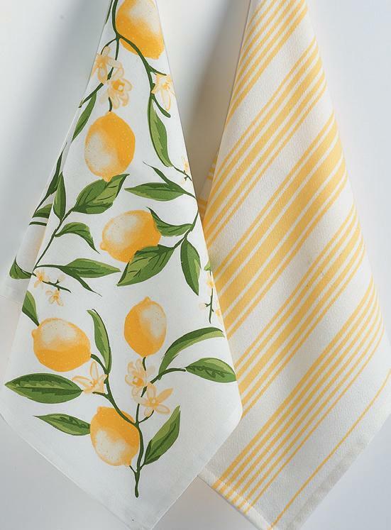 DII Kitchen Dish Towel Set 2 Lemon Bliss Yellow Green Lemon Print Yellow Stripe Beautiful kitchen dishtowels from Design Imports 1 lemon print and 1 yellow stripe Set of 2 kitchen tea towels measuring 18" x 28" 100% Cotton Machine Wash and Dry Includes sewn in hanging loop Make a great gift