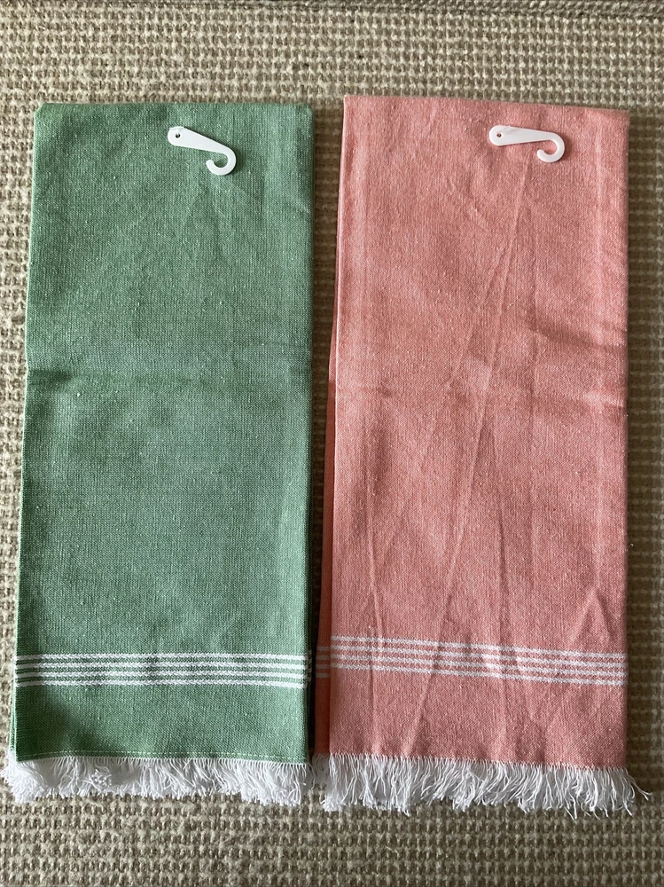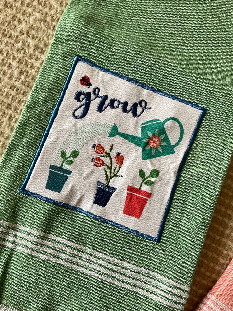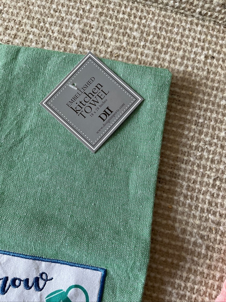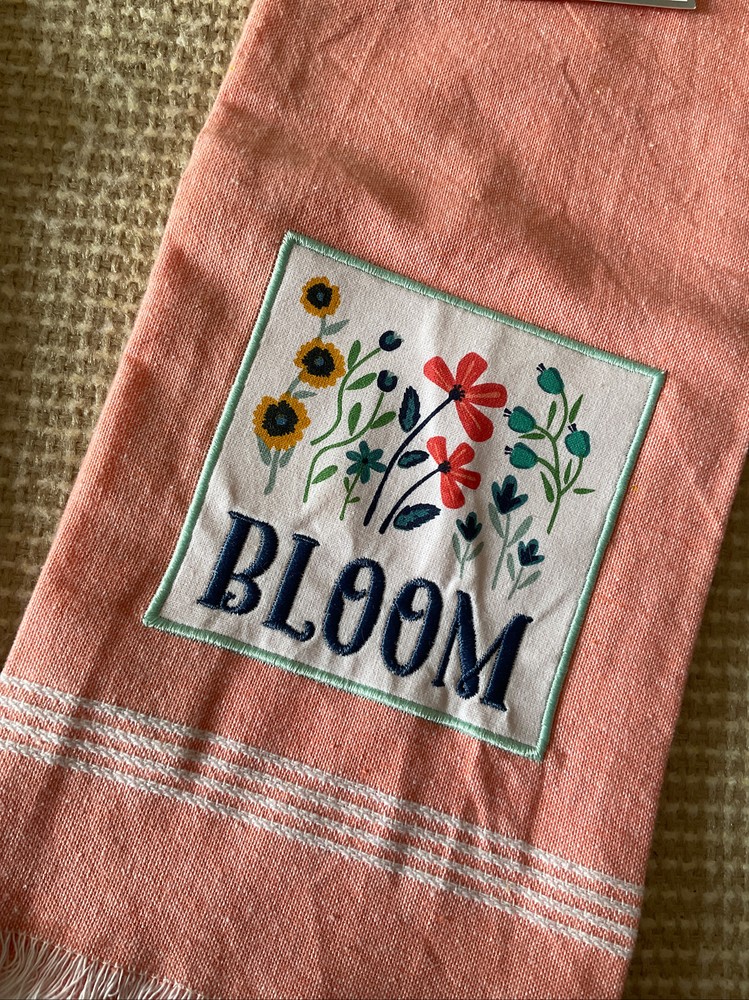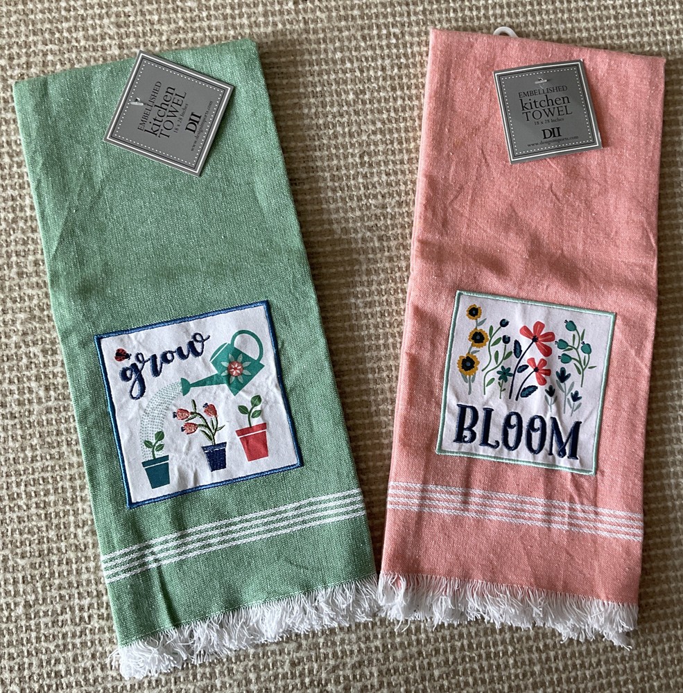 Set of 2 Kitchen Towels DII Embellished Kitchen Towels Includes: 1 green towel with white stripes and fringed bottom; embellished with embroidered "grow" patch featuring a watering can and potted plants, and a little ladybug friend. 1 peach towel with white stripes and fringed bottom; embellished with embroidered "BLOOM" patch with pretty florals. Towels are new with tags