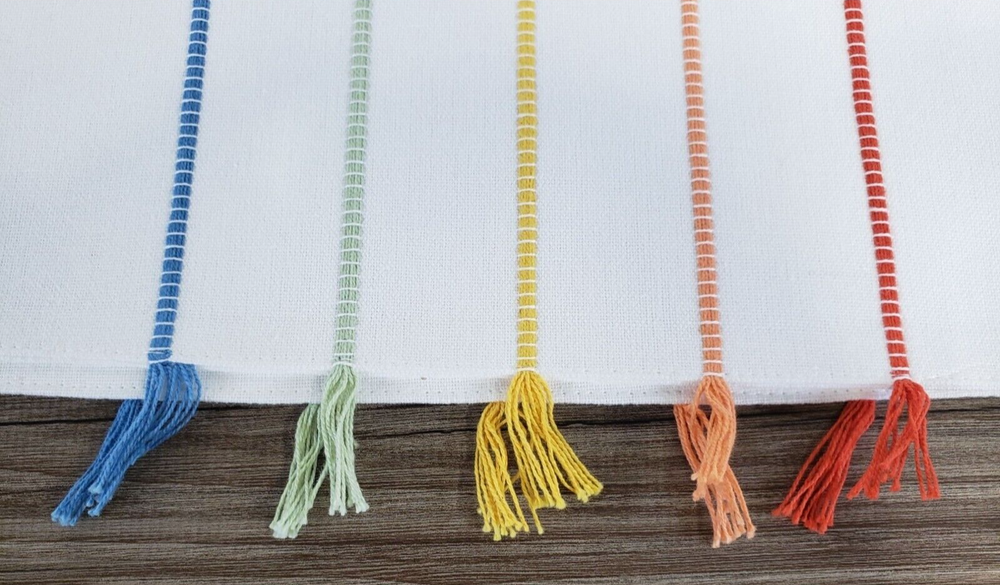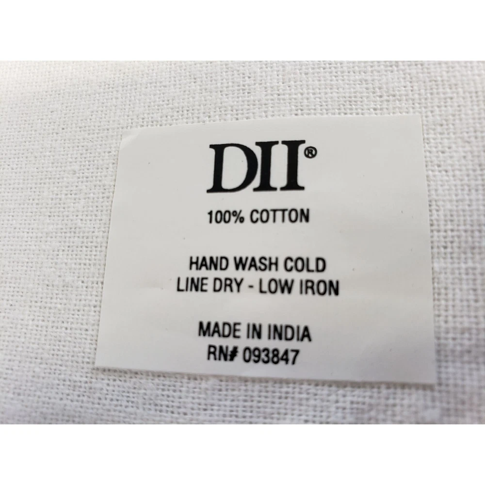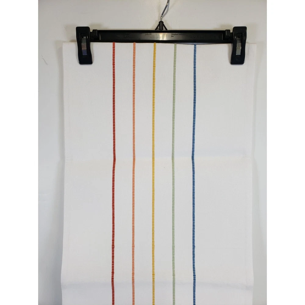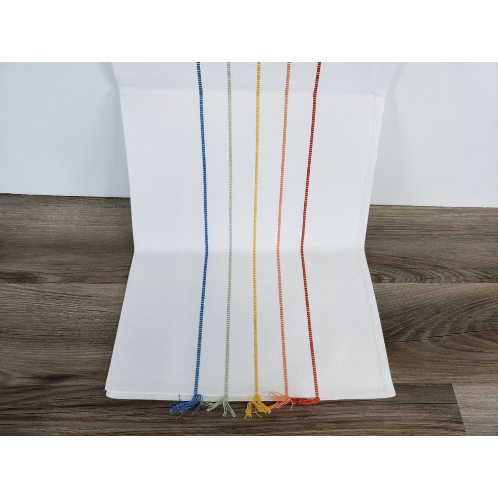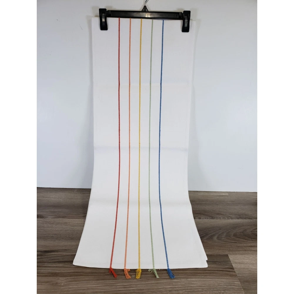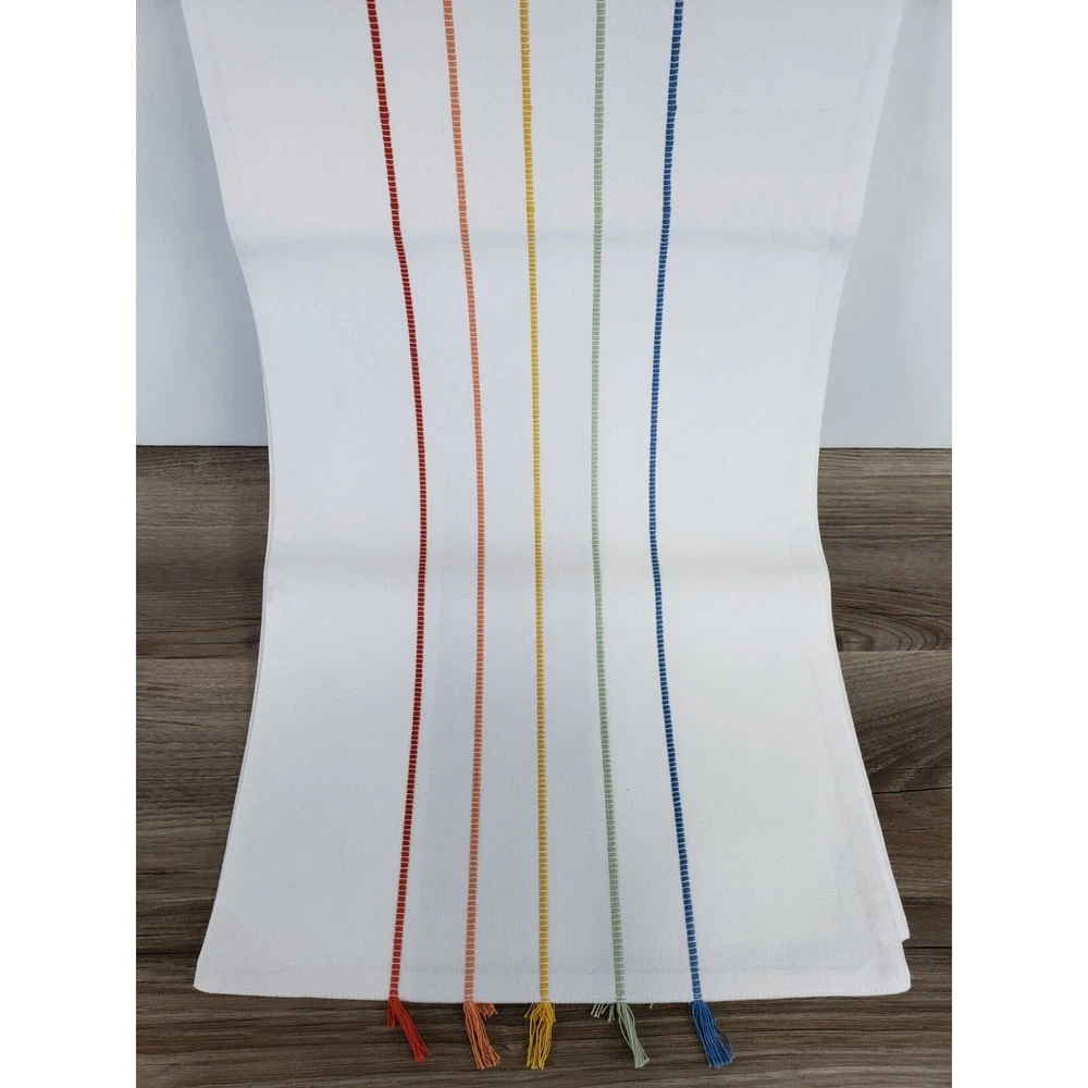 NEW WITH TAGS DII WHITE TABLE RUNNER WITH BLUE, GREEN, YELLOW, ORANGE AND A RUSTY RED STRIPES WITH SMALL TASSELS AT THE END OF EACH COLOR. MADE OF COTTON. MEASURES 72 INCHES BY 15 INCHES. PERFECT FOR A FIESTA SETTING. Features: • Made in INDIA • HANDWASH Condition: New With Tags NEW WITH TAGS THANKS FOR SHOPPING WITH US HERE AT THE RED MOOSE! CHECK OUT OUR EBAY STORE Ø Please read the product description, look at the pictures and/or email us with any questions prior to bidding or purchasing. We try to be very specific and accurate when depicting the items we sell, but there may be something missed. Ø Payment is due immediately with the “Buy It Now” option or within 48 hours for bids or accepted offers. Ø Whenever free shipping is offered, it only applies to the Continental United States. Stated flat shipping rates apply only to the Continental United States. International Buyers may contact us regarding appropriate shipping costs. Ø Please contact us first if you have any issues or problems with any purchase from us. We will be glad to work with you to resolve any problems or issues to our mutual satisfaction. Ø As soon as you receive the item and are satisfied; please leave positive feedback and we will do the same.