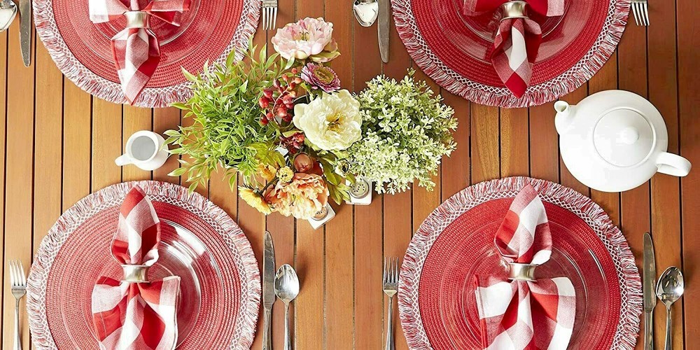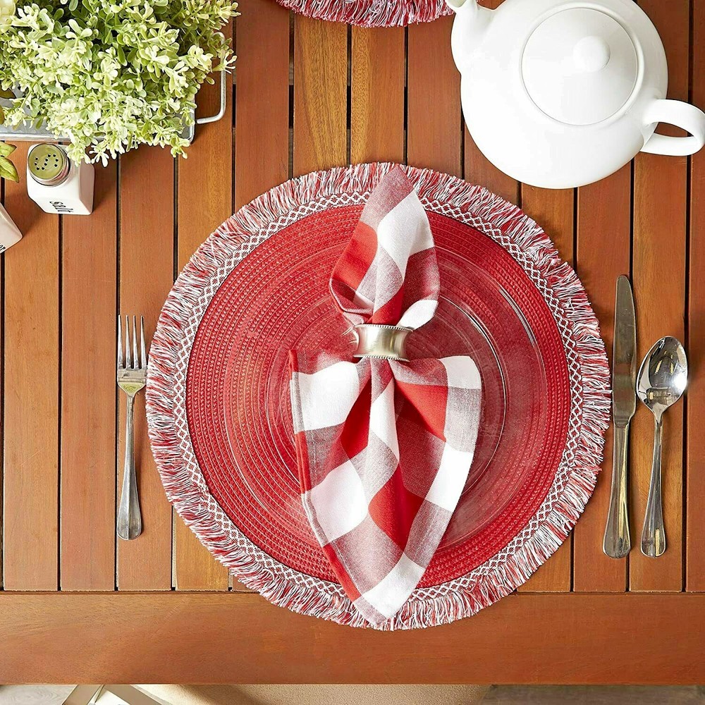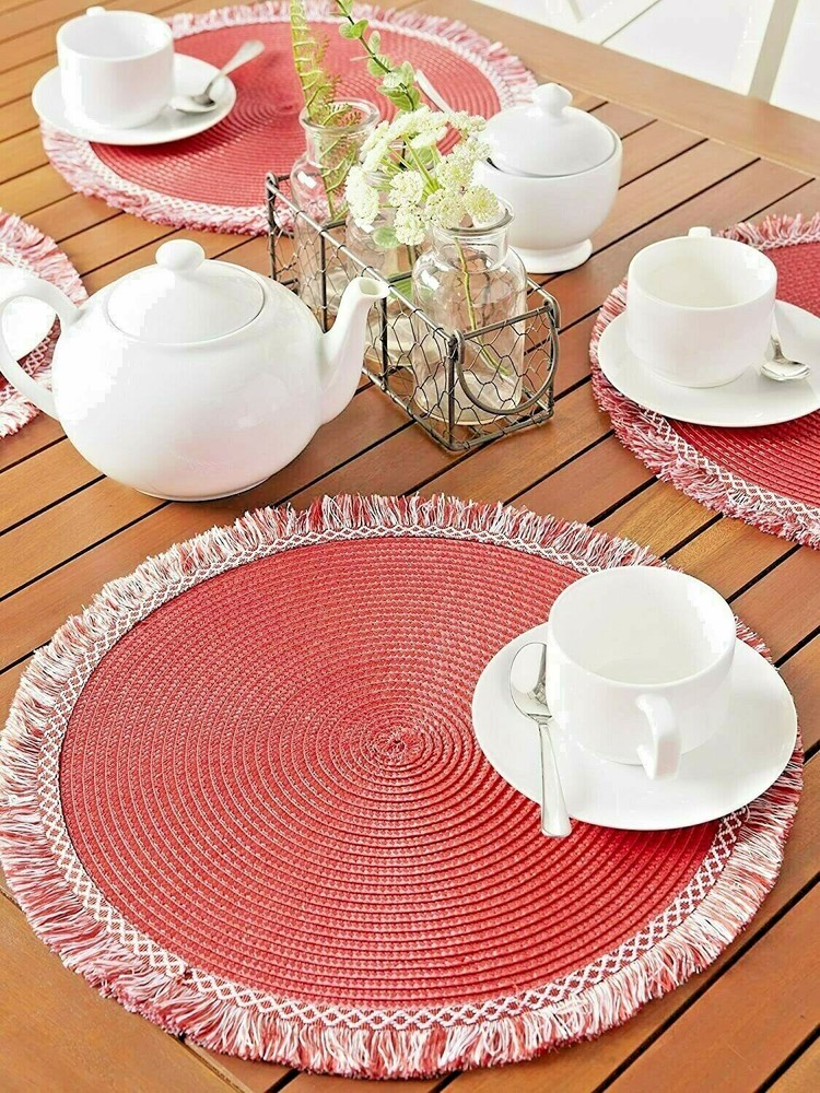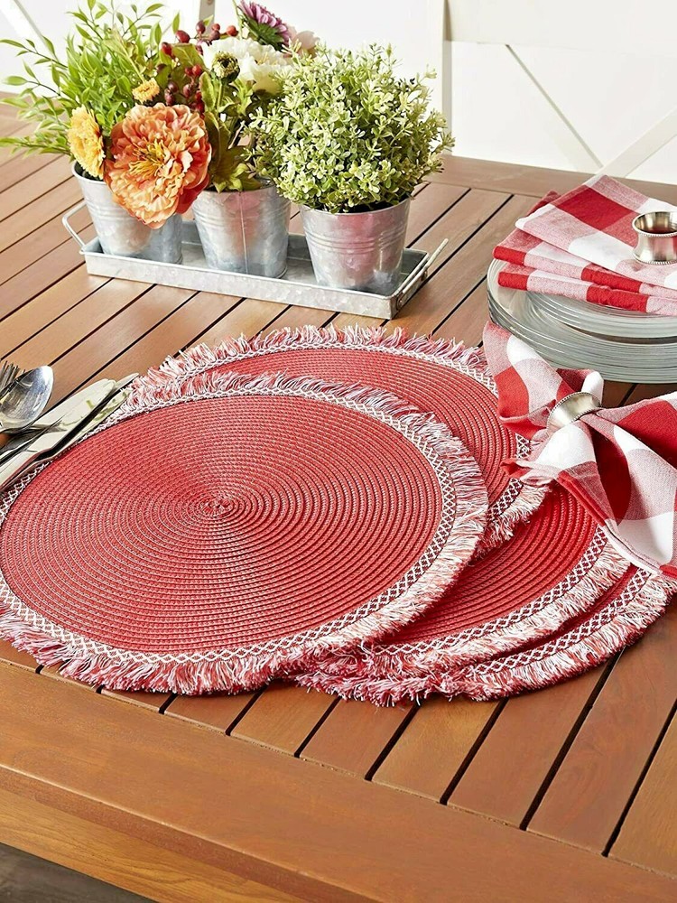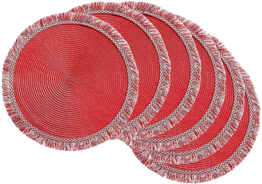 Design Imports 6-Piece Round Woven Placemat Set Tango Red - Fringed 14-3/4" Diameter Easy Care Adds A Finishing Touch Great For Indoor or Outdoor Table Settings Use As A Placemat or Charger Excellent Quality New In Package 5 Star Reviews DII round placemats come in a set of 6 and are perfect for any occasion. These beautifully woven placemats give a contemporary look to any tabletop. These placemats are timeless and pair well with modern tableware as well as with more traditional tableware. DII round placemats are excellent for protecting your table from stains and scratches, extending the life of your table. Use these placemats for any occasion. Thank you for supporting American small business! T a b l e S h o w e r S h o p I value your business and want to provide you with the best customer care