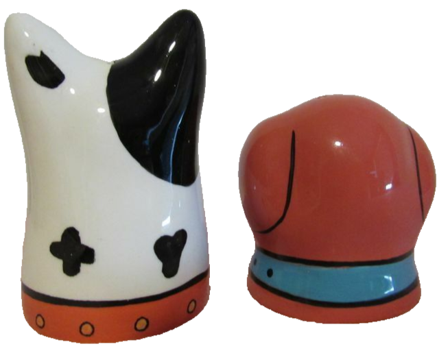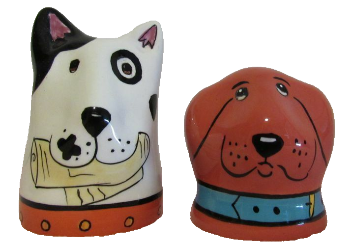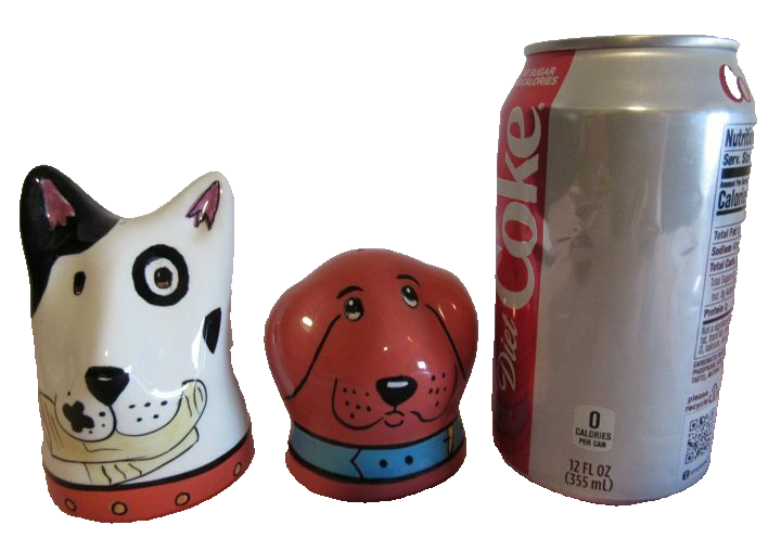 ITEM: Dog Zilla Salt & Pepper Shakers SIZE; The white dog measures 4" tall and the brown/ red dog is 2 1/2" tall COLOR: White/ Brown/ Black/ Gold CONDITION: The shakers are New and UN-Used. and in Great condition. The box has had ware which you can see in the pictures. ( Note: The Coca-Cola Can does Not come with the set, it is there for you to see the size of them only) SPECIAL FEATURES:The box reads " Henriksen Imports" c) 2001 Candace Reiter Designs. Item # 120198" WASHABLE; There are no washing instructions, so you decide MATERIAL: Porcelain Please note: If you purchase more than 1 item from us we will be happy to ship items together to save on shipping costs. We usually ship Priority Mail & Ground Advantage shipping is usually cheaper. If you would like us to use another shipping service, just let us know. Offered by SilverDollarGifts. Note: We are a Smoke Free Store. SHIPPING COSTS: We use the United States Postal Service (USPS) to ship your package. We offer more than one shipping method and if you purchase this item you must decide how you want us to ship your package. The fees for each shipping method are listed so make your selection carefully. The shipping fees are determined by the USPS so if you feel the cost is too high, please contact us before leaving negative feedback or low star ratings.