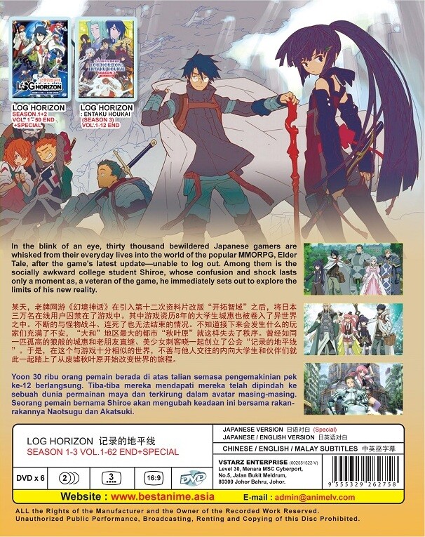 LOG Horizon ログ・ホライズン Complete TV Series (6DVDs) Season 1 + Season 2 + Season 3 *New! English Audio Dub Version *Except Special Episode 1) Season 1: Volume 1-25 End 2) Season 2: Volume 1-25 End 3) Season 3: Volume 1-12 End 4) Special Episode - ALL Region / Region 0 - ~ FREE International Shipping ~ Optional: Japanese with English Subtitle Condition: Authentic, Brand NEW, Original Factory Sealed. Episode: 1-62 (End) + Special No. of Discs: DVD x 6pcs * Region Code: All Region/Region FREE "0" ( Able to play on any DVD Players throughout the World) Audio Language: English* / Japanese Subtitles: English / Chinese ************************************************************************************** - We Only Sell Original/Genuine DVDs. All DVDs I'm selling are from Licensed Publisher in Malaysia. All DVDs come with Original Sealed Authenticated Sticker / Hologram by Malaysia Censorship Board. Satisfaction Guaranteed ** If doesn't satisfied with your purchase, contact me immediately and we can work out something to solve it. ** ~ FREE Shipping Worldwide by Registered AirMail with Tracking Numbers Provided ~ Delivery Time: US, CA, UK, AU, NZ, Europe Countries and Asia Countries takes about 9-21 working days to arrive. South America and rest of the world takes about 20-28 days to arrive. Selling Policy I only accept Payment via PayPal . Please note that Items will not be delivered until Full Payment has been received. Payment has to be made or arranged within 5 days of purchase. Unpaid item dispute will be filed after that. Handling & Shipping Policy Shipping is FREE Worldwide I only ship to the address stated in your PayPal accounts. IF you have special shipping address request, please specify clearly during your purchase. I do not responsible for any custom fees, import duties or taxes in buyer country. If you do not receive the item in stated period of time, please do not hesistate to contact me. I will reply within 24hrs and will try to solve the problem for you. Returns Policy 30 days returnable. Items must be returned in perfect original condition, buyer responsible for returns shipping cost. Refunds will be arranged thru Paypal. Contacts us Please feel free to contact us if you have any questions. Normally, I will response within 24hrs. Please Check out my other Items for sale! Thanks for looking!