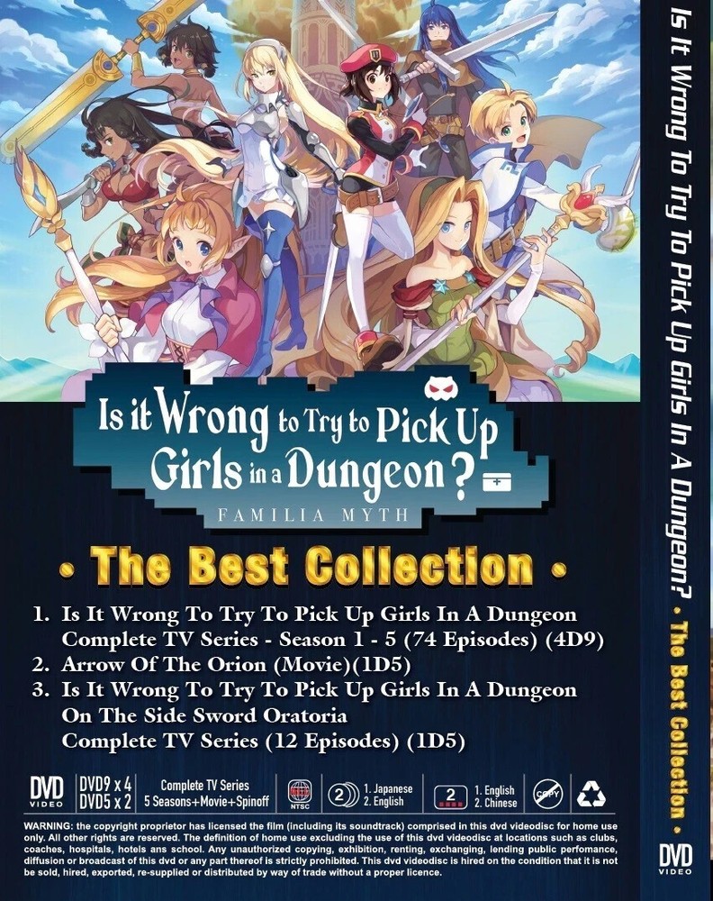 DVD Anime Is It Wrong To Try To Pick Up Girls In A Dungeon? Season 1-5 + Spinoff + Movie (English Dubbed) Description: Number of Disc: 6 DVD Language: Japanese / English Subtitle: English / Chinese Condition: NEW, Original & Licensed Item Disc Format: NTSC (16:9) Region Code: All Region TV Series, 1-59 Episodes + Movie + Spinoff Synopsis: As an adventurer living in Orario, Bell Cranel becomes the only member of Hestia Familia. Although he was very weak compared to veteran dungeon crawlers, he gained a special skill that enables him to become stronger quickly as long as his feelings towards Aiz, the Sword Princess whom he looks up to, does not change. With the help of his Goddess, Hestia and other people who cares for him, he vows to be strong enough to stand side-by-side with Aiz and protect everyone important to him. Item Condition: Brand New & Factory Seal and it is an Original Malaysian and Licensed item. Payment Method: We accept payment using eBay manage payment only. Shipping Method: Handling time is 1-3 working days. Your goods will be shipped with a valid tracking number. All products are packed, and layered with bubble wrap to reduce damages during shipment delivery. Economy Shipping : The products will be shipped via SingPost from Malaysia. Estimate delivery is between 11 to 23 business days. Expedited shipping : Approx 9-11 working days depending on location Tracking will be provided. Return Method: If you have any problem with the order, do contact us via eBay message. We are glad to assist you and solving the problem as soon as possible. Items can be returned within 30 days in a good condition. Other: Import duties, taxes, and additional charges are not included in the item price or shipping charges. Please be aware this custom import duties and taxes are buyer's responsibility.