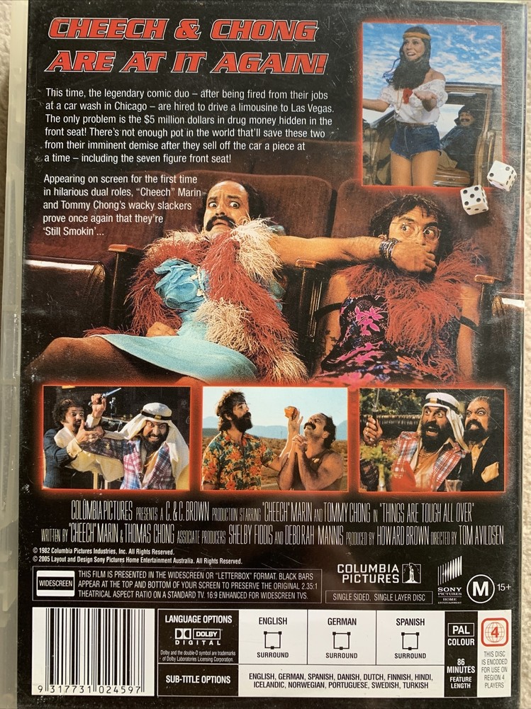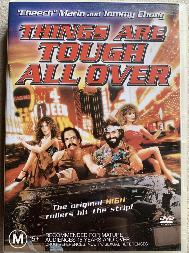 Things are Tough All Over is a 1982 American action comedy film directed by Thomas K. Avildsen and starring Tommy Chong and Cheech Marin as two hippies, and additionally as Arab businessmen Mr. Slyman and Prince Habib. Drug-addled, down-and-out musicians Cheech (Cheech Marin) and Chong (Tommy Chong) finally get a lucky break when two wealthy Arabs, Mr. Slyman (also Marin) and Prince Habib (also Chong), hire them to drive a limousine from Chicago to Las Vegas. What the hapless duo doesn't know is that millions are stashed in the seats of the car. Soon the clueless Cheech and Chong are selling off parts of the limo for money and wind up in the desert with their angry foreign employers in hot pursuit. REAR COVER This time, the legendary comic duo - after being fired from their jobs at a car wash in Chicago - are hired to drive a limousine to Las Vegas. The only problem is the $5 million dollars in drug money hidden in the front seat! There's not enough pot in the world that'll save these two't from their imminent demise after they sell off the car a piece at a time - including the seven figure front seat! Appearing on screen for the first time in hilarious dual roles, "Cheech" Marin and Tommy Chong's wacky slackers prove once again that they re “Still Smokin'... RECEPTION Janet Maslin of The New York Times wrote, "Cheech and Chong have a good time in 'Things Are Tough All Over,' and you will, too." Variety called the film "a painful and pallid affair which reminds of the tired, late-career efforts of Abbott & Costello."Gene Siskel of the Chicago Tribune gave the film one-and-a-half stars out of four and called it "the fourth and possibly worst Cheech and Chong comedy film."Gary Arnold of The Washington Post wrote, "'Things Are Tough All Over' proves a prophetic bad-luck title for Cheech & Chong, who slump into the sporadically amusing doldrums for the first time in their brief but hilarious career as outrageous movie clowns."David Ansen of Newsweek called it "a shaggy-dog road movie, with all the team's usual ingredients but one — it's not funny." DETAILED PLOT Cheech and Chong are driving a limo through the desert. Chong, who has decided to stop doing drugs for a while, is talking about rock and roll, and Cheech is falling asleep, but Cheech is narrating over what's happening. He says that "things are tough all over" and that he's going to tell their story. It's an awful winter in Chicago, and Cheech and Chong are poor, struggling musicians working at a car wash owned by a pair of oil-rich Arabs, Mr. Slyman and Prince Habib. After messing up on the job, the 2 are forced by the Arabs to work and play music at their club. Cheech and Chong also try to get with the Arabs' French girlfriends, who are more in love with the stoners. The Arabs find themselves with a large sum of illegal money, which they try to get to their other business in Las Vegas. They decide to stash all the money in the seats of a limousine. The Arabs hire the stoners to drive the limousine to Las Vegas, telling them that they're sending them on a "rock tour." Cheech and Chong at first get gas in Chicago, but when they reveal they're strapped for cash, the man at the gas station takes a piece of the car as payment. With that idea, Cheech and Chong find themselves driving across the country, selling parts and pieces of the car for gas, food, and supplies. Soon, their car becomes a wreck and looks messed up, but Cheech and Chong continue to sell parts to get by. While out in the middle of the deserts, they decide to pick up a hitchhiker, who turns out to be none other than Donna, Cheech's girlfriend. The two decide to take Donna in their messed-up limo to the nearest gas station. However, Donna is traveling with dozens of Mexicans, so the stoners end up driving all the Mexicans and Donna to the nearest gas station. To pay for gas, Cheech and Chong give the old man that runs the place a chair from the limo—which unbeknownst to them the Arab's have hidden money for safe transport on the bottom of the car seat. Cheech and Chong deliver the messed-up limousine to the Arabs' other oil plant in the desert, to find no one there. With no other transportation or money, Cheech and Chong set out on foot into the desert. They wander into the burning deserts, suffering the Nevada heat, and trying to get cars to stop- they remain unsuccessful. Eating peyote to survive and singing to pass the time, Cheech and Chong do their best to get through the desert, though they believe they'll die from the heat. Back in Chicago, the Arabs find out that Cheech and Chong have delivered what remains of the car without any money in it. After deciding to kill them, the Arabs fly out to Nevada in their private plane and set out by car into the desert. The Arabs meet the old man at the gas station and learn that Cheech and Chong have been around, and set out into the deserts; their car breaks down, leaving the Arabs to wander through the Nevada deserts and get lost. Meanwhile, while walking through the desert, Cheech and Chong are picked up by the Arab's French girlfriends, who take them to an abandoned motel in the middle of the desert. The French girlfriends have sex with the stoners, and are (unknown to them) on a hidden camera film. Afterwards, the French ladies leave in their car, leaving the stoners stranded in the middle of nowhere yet again. Meanwhile, the Arabs are having the same problem, looking for Cheech and Chong in the middle of the desert, having no idea where to go. Cheech and Chong wander through the desert again until they're picked up again, this time by comedian Rip Taylor, whose puns and props make Chong cry. The comedian drives the two into Las Vegas and drops them off at a restaurant, and has them dressed up as women to cover up their rags. Cheech and Chong start to dine at the restaurant, before the Arabs show up for dinner as well, having escaped the desert. Before they can eat, all the peyote Chong consumed begins to mess wit