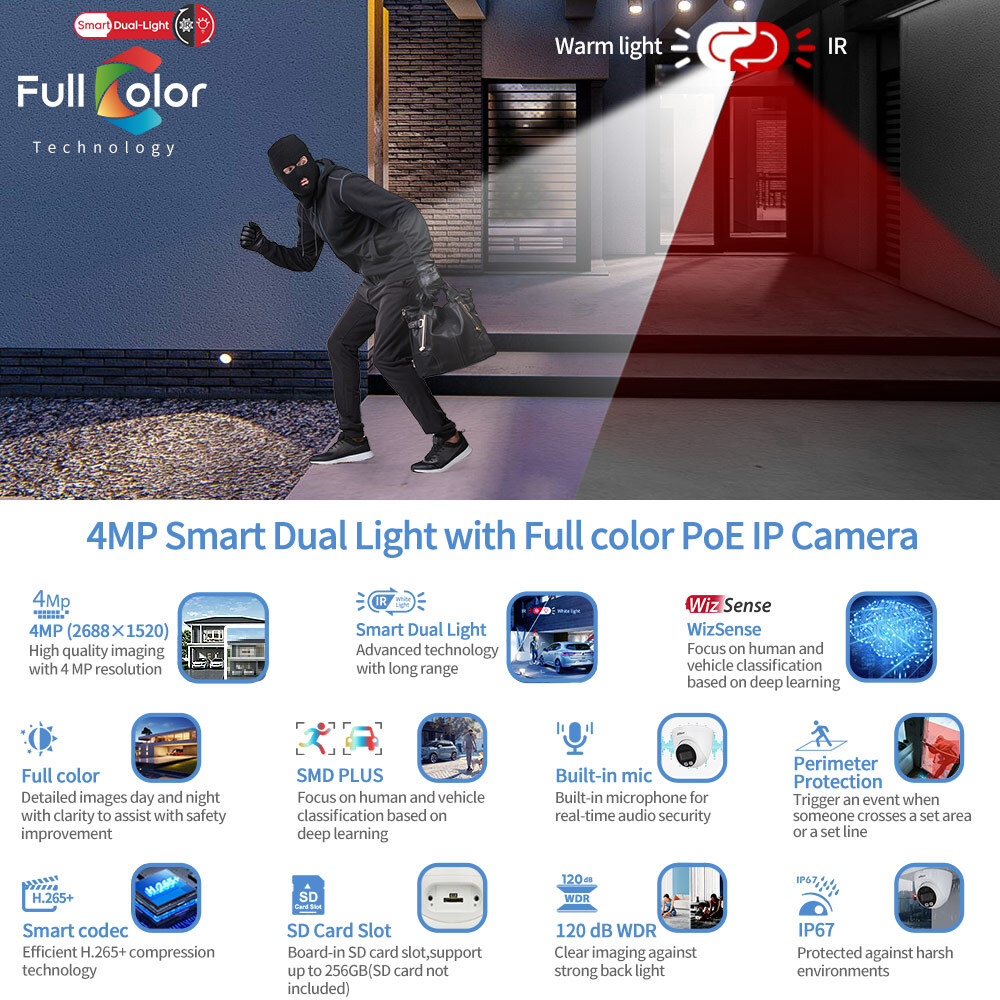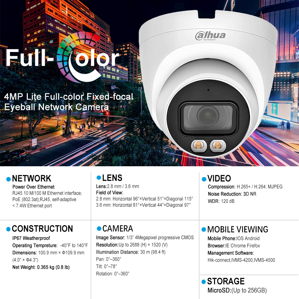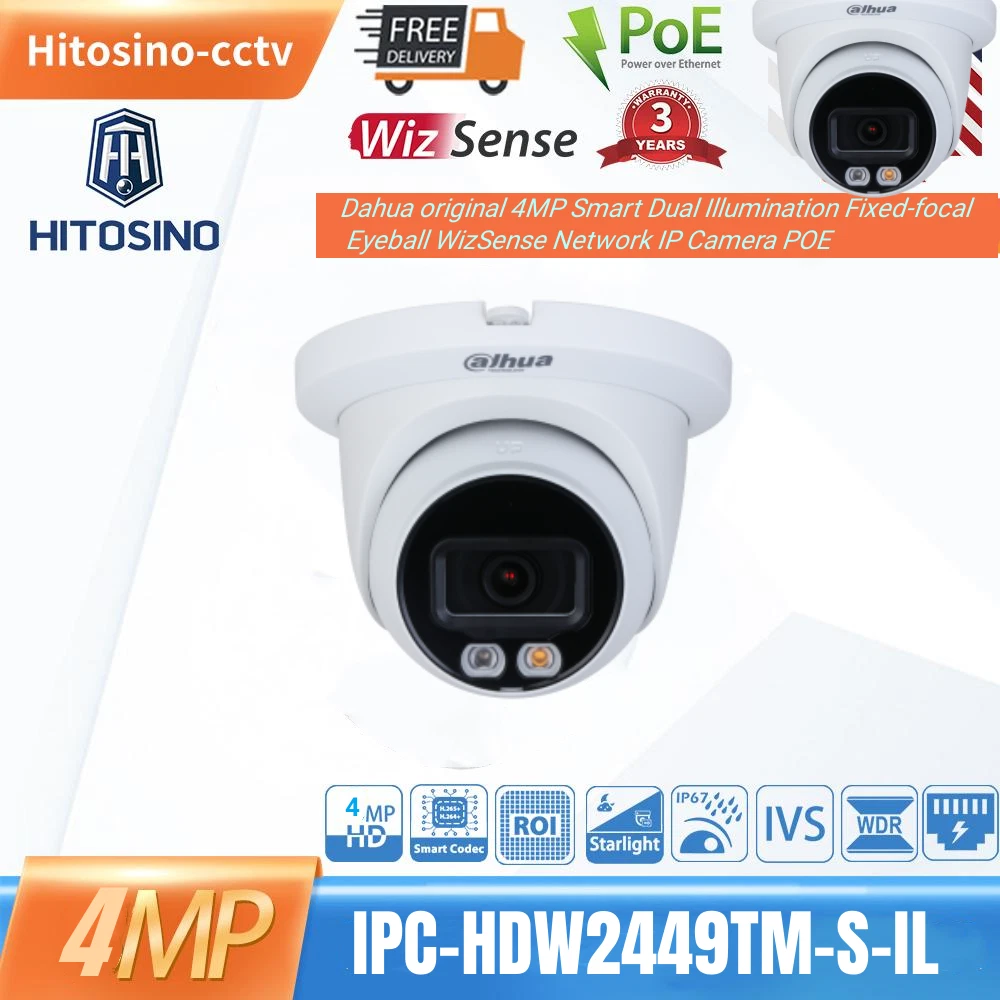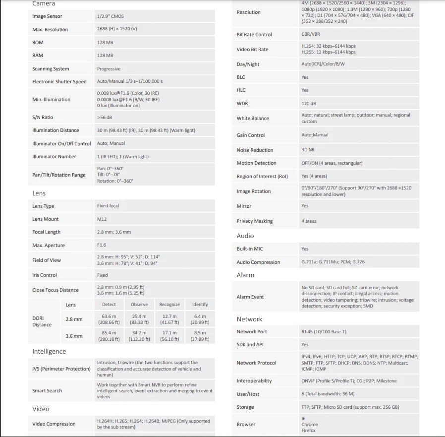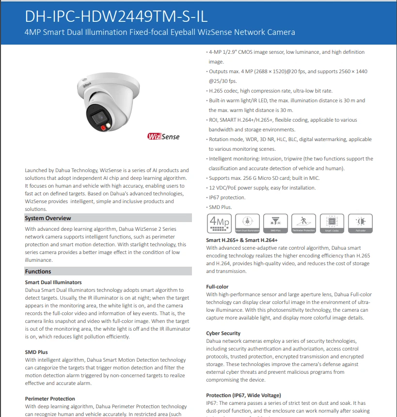 Dahua IPC-HDW2449TM-S-IL 4MP Eyeball WizSense Camera PoE Smart Dual Illumination Important Reminder Before Buying 1. Original Dahua worldwide English version and Firmware upgradeable. 2. 2.8mm Lens as default. If need 3.6mm lens, please write a note in your order or contact us by message. 3. There is no power adapter and cables in the original Package, if you need, please kindly contact us for inquiry. 4.Welcome to the bulk order of Hikvision & Dahua original English version products with attractive price, please contact us now! Features > 4-MP 1/2.9" CMOS image sensor, low luminance, and high definition image. > Outputs max. 4 MP (2688 × 1520)/20 fps, and supports 2560 × 1440 /25/30 fps. > H.265 codec, high compression rate, ultra-low bit rate. > Built-in warm light/IR LED, the max. illumination distance is 30 m and the max. warm light distance is 30 m. > ROI, SMART H.264+/H.265+, flexible coding, applicable to various bandwidth and storage environments. > Rotation mode, WDR, 3D NR, HLC, BLC, digital watermarking, applicable to various monitoring scenes. > Intelligent monitoring: Intrusion, tripwire (the two functions support the classification and accurate detection of vehicle and human). > Supports max. 256 G Micro SD card; built in MIC. > 12 VDC/PoE power supply, easy for installation. > IP67 protection. > SMD Plus. Functions Smart Dual Illuminators Dahua Smart Dual Illuminators technology adopts smart algorithm to detect targets. Usually, the IR illuminator is on at night; when the target appears in the monitoring area, the white light is on, and the camera records the full-color video and information of key events. That is, the camera links snapshot and video with full-color image. When the target is out of the monitoring area, the white light is off and the IR illuminator is on, which reduces light pollution efficiently. Full-color With high-performance sensor and large aperture lens, Dahua Full-color technology can display clear colorful image in the environment of ultra low illuminance. With this photosensitivity technology, the camera can capture more available light, and display more colorful image details. SMD Plus With intelligent algorithm, Dahua Smart Motion Detection technology can categorize the targets that trigger motion detection and filter the motion detection alarm triggered by non-concerned targets to realize effective and accurate alarm. Perimeter Protection With deep learning algorithm, Dahua Perimeter Protection technology can recognize human and vehicle accurately. In restricted area (such as pedestrian area and vehicle area), the false alarms of intelligent detection based on target type (such as tripwire, intrusion) are largely reduced. Smart Codec (H.265+ & H.264+) Smart Codec is the optimized implementation of standard video compression (H.265 & H.264) that uses a scene-adaptive encoding strategy, dynamic GOP, dynamic ROI, flexible multi-frame reference structure and intelligent noise reduction to deliver high-quality video without straining the network. Smart Codec technology reduces bit rate and storage requirements by up to 70% when compared to the standard video compression. Protection (IP67, wide voltage) IP67: The camera passes a series of strict test on dust and soak. It has dust-proof function, and the enclosure can works normal after soaking in 1 m deep water for 30 minutes. Wide voltage: The camera allows ±30% input voltage tolerance (wide voltage range), and it is widely applied to outdoor environment with instable voltage. Specifications Camera Image Sensor 1/2.9" CMOS Max. Resolution 2688 (H) × 1520 (V) ROM 128 MB RAM 128 MB Scanning System Progressive Electronic Shutter Speed Auto/Manual 1/3 s–1/100,000 s Min. Illumination 0.008 lux/F1.6 (Color, 30 IRE) 0.0008 lux/F1.6 (B/W, 30 IRE) 0 lux (Illuminator on) S/N Ratio > 56 dB Illumination Distance 30 m (98.43 ft) (IR), 30 m (98.43 ft) (Warm light) Illuminator On/Off Control Auto; Manual Illuminator Number 1 (IR LED); 1 (Warm light) Pan/Tilt/Rotation Range Pan: 0°–360° Tilt: 0°–78° Rotation: 0°–360° Lens Lens Type Fixed-focal Lens Mount M12 Focal Length 2.8 mm; 3.6 mm Max. Aperture F1.6 Field of View 2.8 mm: H: 95°; V: 52°; D: 114° 3.6 mm: H: 78°; V: 41°; D: 94° Iris Control Fixed Close Focus Distance 2.8 mm: 0.9 m (2.95 ft) 3.6 mm: 1.6 m (5.25 ft) DORI Distance Lens Detect Observe Recognize Identify 2.8 mm 63.6 m (208.66 ft) 25.4 m (83.33 ft) 12.7 m (41.67 ft) 6.4 m (20.99 ft) 3.6 mm 85.4 m (280.18 ft) 34.2 m (112.20 ft) 17.1 m (56.10 ft) 8.5 m (27.89 ft) Intelligence IVS (Perimeter Protection) Intrusion, tripwire (the two functions support the classification and accurate detection of vehicle and human) Smart Search Work together with Smart NVR to perform refine intelligent search, event extraction and merging to event videos Video Video Compression H.264H; H.265; H.264; H.264B; MJPEG (Only supported by the sub stream) Smart Codec Smart H.265+; Smart H.264+ Video Frame Rate Main stream: 2688 × 1520/(1–20 fps)/2560 × 1440/(1–25/30 fps) Sub stream: 704 × 576/(1–25 fps)/704 × 480/(1–30 fps) *The values above are the max. frame rates of each stream; for multiple streams, the values will be subjected to the total encoding capacity. Stream Capability 2 streams Resolution 4M (2688 × 1520/2560 × 1440); 3M (2304 × 1296); 1080p (1920 × 1080); 1.3M (1280 × 960); 720p (1280 × 720); D1 (704 × 576/704 × 480); VGA (640 × 480); CIF (352 × 288/352 × 240) Bit Rate Control CBR/VBR Video Bit Rate H.264: 32 kbps–6144 kbps H.265: 12 kbps–6144 kbps Day/Night Auto(ICR)/Color/B/W BLC Yes HLC Yes WDR 120 dB White Balance Auto; natural; street lamp; outdoor; manual; regional custom Gain Control Auto;Manual Noise Reduction 3D NR Motion Detection OFF/ON (4 areas, rectangular) Region of Interest (RoI) Yes (4 areas) Image Rotation 0°/90°/180°/270° (Support 90°/270° with 2688 ×1520 resolution and lower) Mirror Yes Privacy Masking 4 areas Audio Built-in MIC Yes Audio Comp