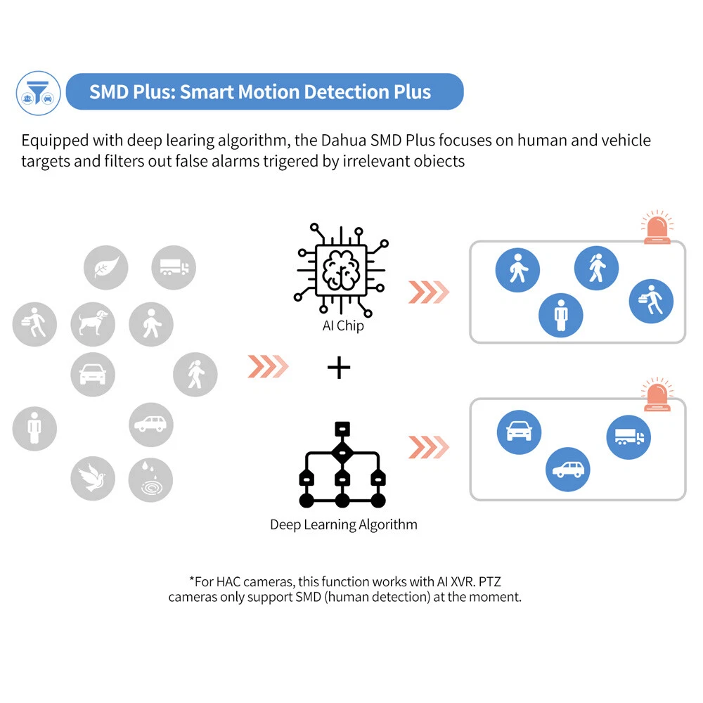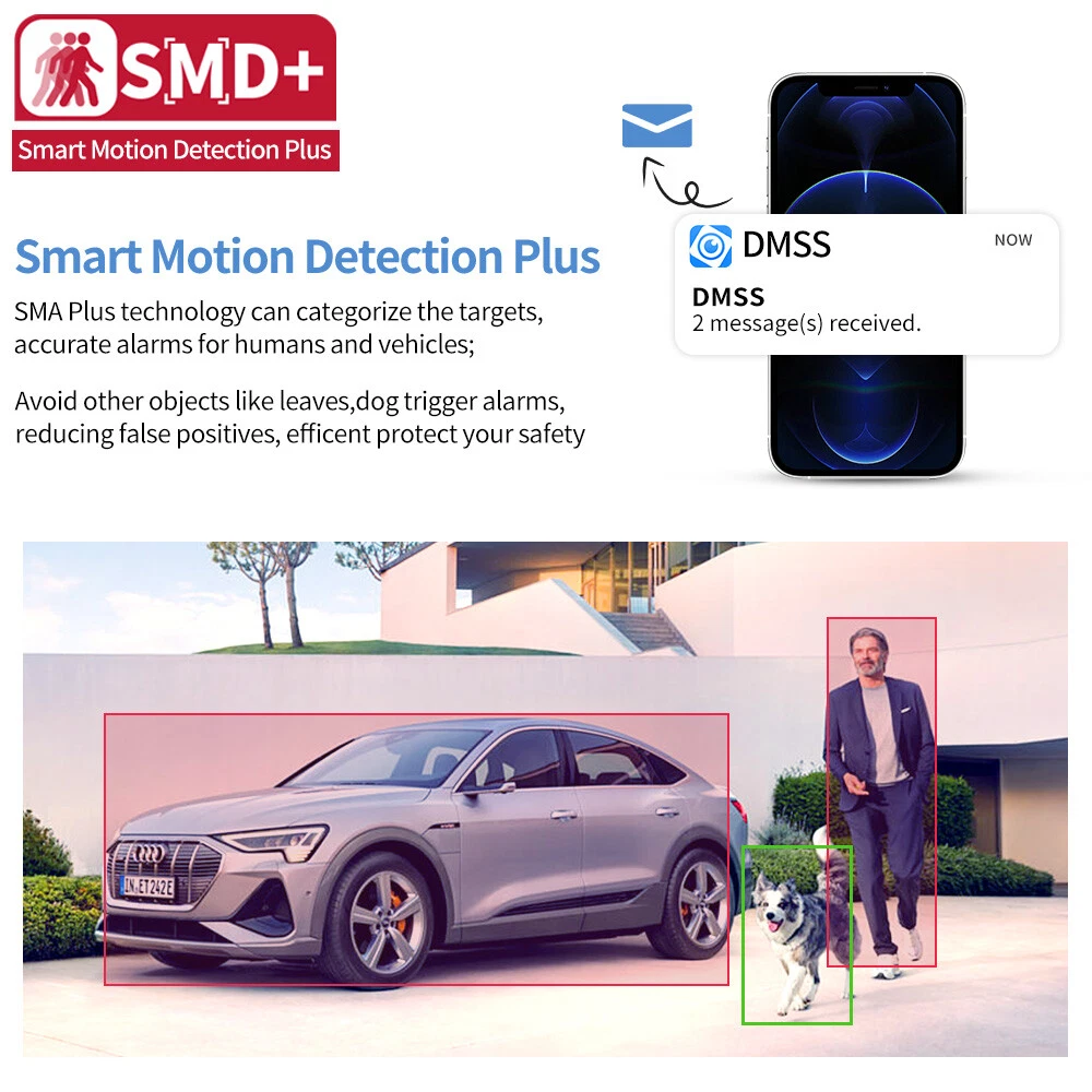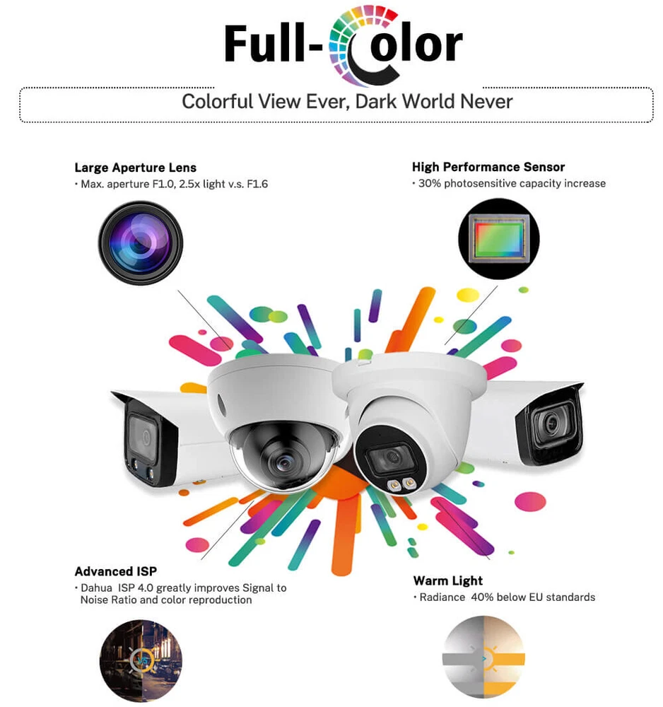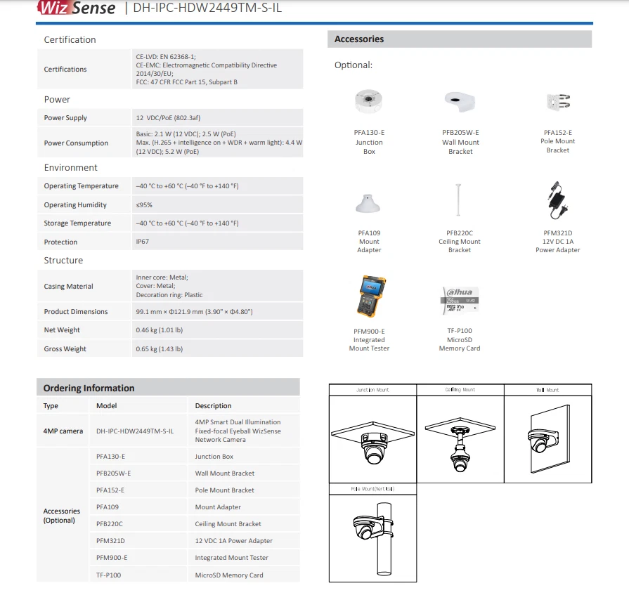 Dahua IPC-HDW2449TM-S-IL 4MP Eyeball WizSense Camera PoE Smart Dual Illumination Important Reminder Before Buying 1. Original Dahua worldwide English version and Firmware upgradeable. 2. 2.8mm Lens as default. If need 3.6mm lens, please write a note in your order or contact us by message. 3. There is no power adapter and cables in the original Package, if you need, please kindly contact us for inquiry. 4.Welcome to the bulk order of Hikvision & Dahua original English version products with attractive price, please contact us now! Features > 4-MP 1/2.9" CMOS image sensor, low luminance, and high definition image. > Outputs max. 4 MP (2688 × 1520)/20 fps, and supports 2560 × 1440 /25/30 fps. > H.265 codec, high compression rate, ultra-low bit rate. > Built-in warm light/IR LED, the max. illumination distance is 30 m and the max. warm light distance is 30 m. > ROI, SMART H.264+/H.265+, flexible coding, applicable to various bandwidth and storage environments. > Rotation mode, WDR, 3D NR, HLC, BLC, digital watermarking, applicable to various monitoring scenes. > Intelligent monitoring: Intrusion, tripwire (the two functions support the classification and accurate detection of vehicle and human). > Supports max. 256 G Micro SD card; built in MIC. > 12 VDC/PoE power supply, easy for installation. > IP67 protection. > SMD Plus. Functions Smart Dual Illuminators Dahua Smart Dual Illuminators technology adopts smart algorithm to detect targets. Usually, the IR illuminator is on at night; when the target appears in the monitoring area, the white light is on, and the camera records the full-color video and information of key events. That is, the camera links snapshot and video with full-color image. When the target is out of the monitoring area, the white light is off and the IR illuminator is on, which reduces light pollution efficiently. Full-color With high-performance sensor and large aperture lens, Dahua Full-color technology can display clear colorful image in the environment of ultra low illuminance. With this photosensitivity technology, the camera can capture more available light, and display more colorful image details. SMD Plus With intelligent algorithm, Dahua Smart Motion Detection technology can categorize the targets that trigger motion detection and filter the motion detection alarm triggered by non-concerned targets to realize effective and accurate alarm. Perimeter Protection With deep learning algorithm, Dahua Perimeter Protection technology can recognize human and vehicle accurately. In restricted area (such as pedestrian area and vehicle area), the false alarms of intelligent detection based on target type (such as tripwire, intrusion) are largely reduced. Smart Codec (H.265+ & H.264+) Smart Codec is the optimized implementation of standard video compression (H.265 & H.264) that uses a scene-adaptive encoding strategy, dynamic GOP, dynamic ROI, flexible multi-frame reference structure and intelligent noise reduction to deliver high-quality video without straining the network. Smart Codec technology reduces bit rate and storage requirements by up to 70% when compared to the standard video compression. Protection (IP67, wide voltage) IP67: The camera passes a series of strict test on dust and soak. It has dust-proof function, and the enclosure can works normal after soaking in 1 m deep water for 30 minutes. Wide voltage: The camera allows ±30% input voltage tolerance (wide voltage range), and it is widely applied to outdoor environment with instable voltage. Specifications Camera Image Sensor 1/2.9" CMOS Max. Resolution 2688 (H) × 1520 (V) ROM 128 MB RAM 128 MB Scanning System Progressive Electronic Shutter Speed Auto/Manual 1/3 s–1/100,000 s Min. Illumination 0.008 lux/F1.6 (Color, 30 IRE) 0.0008 lux/F1.6 (B/W, 30 IRE) 0 lux (Illuminator on) S/N Ratio > 56 dB Illumination Distance 30 m (98.43 ft) (IR), 30 m (98.43 ft) (Warm light) Illuminator On/Off Control Auto; Manual Illuminator Number 1 (IR LED); 1 (Warm light) Pan/Tilt/Rotation Range Pan: 0°–360° Tilt: 0°–78° Rotation: 0°–360° Lens Lens Type Fixed-focal Lens Mount M12 Focal Length 2.8 mm; 3.6 mm Max. Aperture F1.6 Field of View 2.8 mm: H: 95°; V: 52°; D: 114° 3.6 mm: H: 78°; V: 41°; D: 94° Iris Control Fixed Close Focus Distance 2.8 mm: 0.9 m (2.95 ft) 3.6 mm: 1.6 m (5.25 ft) DORI Distance Lens Detect Observe Recognize Identify 2.8 mm 63.6 m (208.66 ft) 25.4 m (83.33 ft) 12.7 m (41.67 ft) 6.4 m (20.99 ft) 3.6 mm 85.4 m (280.18 ft) 34.2 m (112.20 ft) 17.1 m (56.10 ft) 8.5 m (27.89 ft) Intelligence IVS (Perimeter Protection) Intrusion, tripwire (the two functions support the classification and accurate detection of vehicle and human) Smart Search Work together with Smart NVR to perform refine intelligent search, event extraction and merging to event videos Video Video Compression H.264H; H.265; H.264; H.264B; MJPEG (Only supported by the sub stream) Smart Codec Smart H.265+; Smart H.264+ Video Frame Rate Main stream: 2688 × 1520/(1–20 fps)/2560 × 1440/(1–25/30 fps) Sub stream: 704 × 576/(1–25 fps)/704 × 480/(1–30 fps) *The values above are the max. frame rates of each stream; for multiple streams, the values will be subjected to the total encoding capacity. Stream Capability 2 streams Resolution 4M (2688 × 1520/2560 × 1440); 3M (2304 × 1296); 1080p (1920 × 1080); 1.3M (1280 × 960); 720p (1280 × 720); D1 (704 × 576/704 × 480); VGA (640 × 480); CIF (352 × 288/352 × 240) Bit Rate Control CBR/VBR Video Bit Rate H.264: 32 kbps–6144 kbps H.265: 12 kbps–6144 kbps Day/Night Auto(ICR)/Color/B/W BLC Yes HLC Yes WDR 120 dB White Balance Auto; natural; street lamp; outdoor; manual; regional custom Gain Control Auto;Manual Noise Reduction 3D NR Motion Detection OFF/ON (4 areas, rectangular) Region of Interest (RoI) Yes (4 areas) Image Rotation 0°/90°/180°/270° (Support 90°/270° with 2688 ×1520 resolution and lower) Mirror Yes Privacy Masking 4 areas Audio Built-in MIC Yes Audio Comp