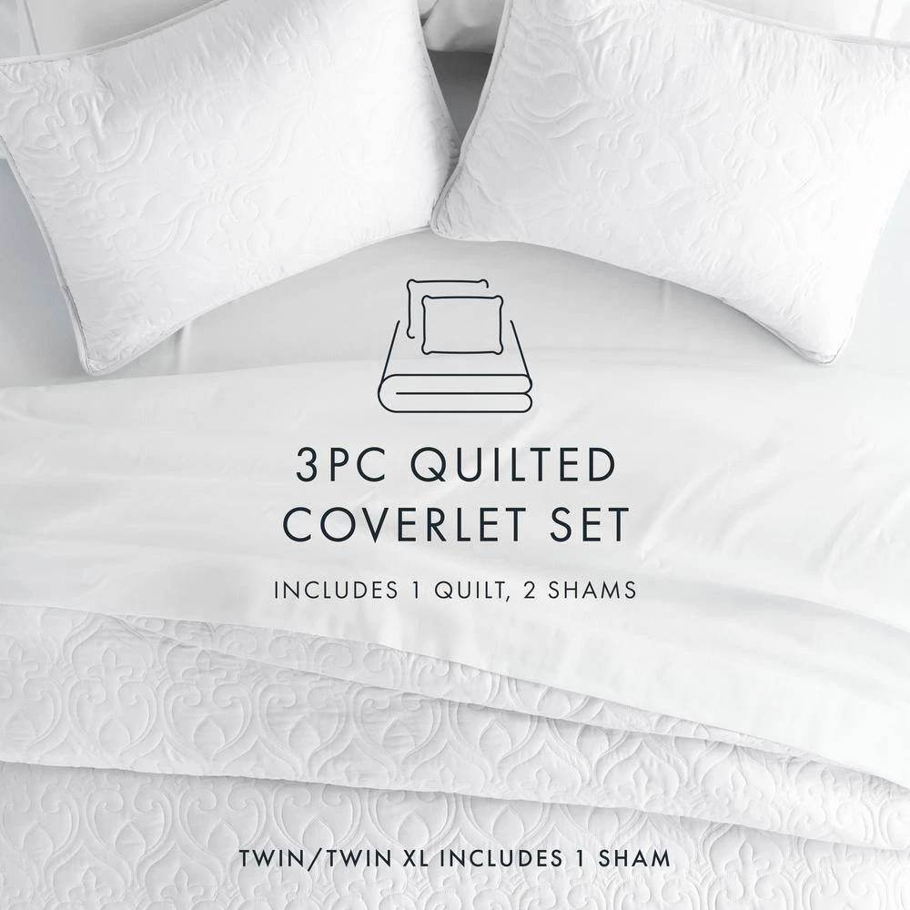 Includes 1 Quilted Coverlet, 2-Shams (Tw set 1-Sham) Hypoallergenic and antimicrobial for sensitive skin Double Brushed Microfiber for comfort and temperature control The Becky Cameron Quilted Coverlet is where casual elegance meets pure uncompromising comfort. Sure to compliment any bedroom style, this beautiful coverlet is available in three timeless patterns. Spun from our premium microfiber yarns, offering twice the durability of cotton and is 100% hypoallergenic. Truly an All Seasons Coverlet, it will keep you warm in the winter and cool in the summer and is sure to add the finishing touch to your tranquil bedroom oasis. Easy Care: Machine wash cold, Tumble dry low, Fade resistant, Wrinkle Free, No ironing necessary King / California King Set Includes: 1 Quilted Coverlet: 108" W x 96" L : 2 Pillow Shams: 20" W x 36" L Full / Queen Set Includes: 1 Quilted Coverlet: 90" W x 94" L ; 2 Pillow Shams: 20" W x 26" L Twin / Twin Extra Long set includes: 1 Quilted Coverlet: 70" W x 90" L ; 1 Pillow Sham: 20" W x 26" L