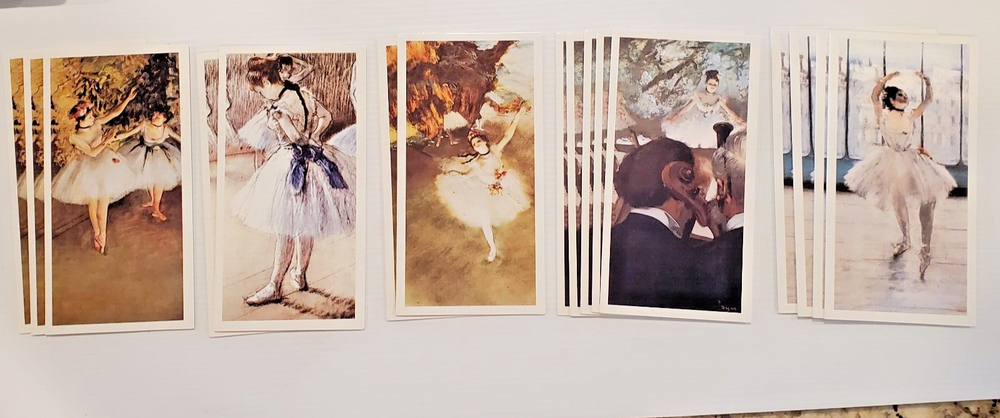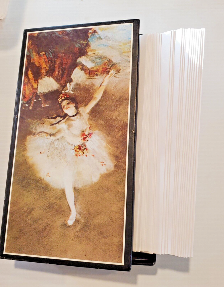 Edgar Degas French Impressionist Blank Inside Note Card 4" x 7.9" SET of 5 (Open box) BA - 304 Robert Frederick Ltd presents a charming set of 16 blank cards, each featuring the exquisite art of Edgar Degas. The cards depict the theme of "Dancer on the Stage," showcasing the grace of French Impressionist dancers. Designed with a vibrant, multicolored floral pattern, these cards are perfect for any occasion, making them a versatile choice for sending personal messages or notes.Crafted with quality and attention to detail, these cards come with matching envelopes, ensuring they are ready to be signed, sealed, and delivered. Whether you're sending a warm greeting or a heartfelt thank you, these contemporary-style cards will beautifully convey your sentiments to a wide range of recipients. P.S. Note this is an open box set of cards. There are no Dancer's in Blue cards Dancer on Stage -2 cards Musicians in the Orchestra - 5 cards Two Dancers on the Stage - 3 cards Dancer's Rehearsing - 2 cards Dancer posing for photographer - 4 cards