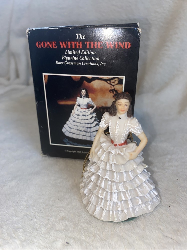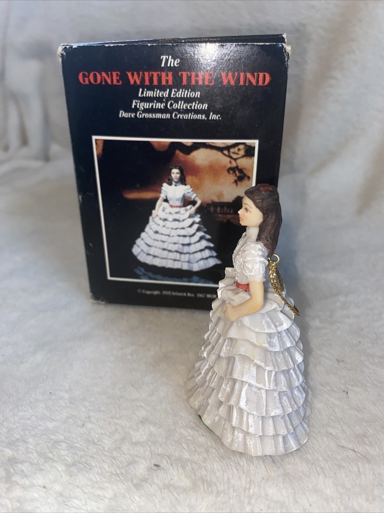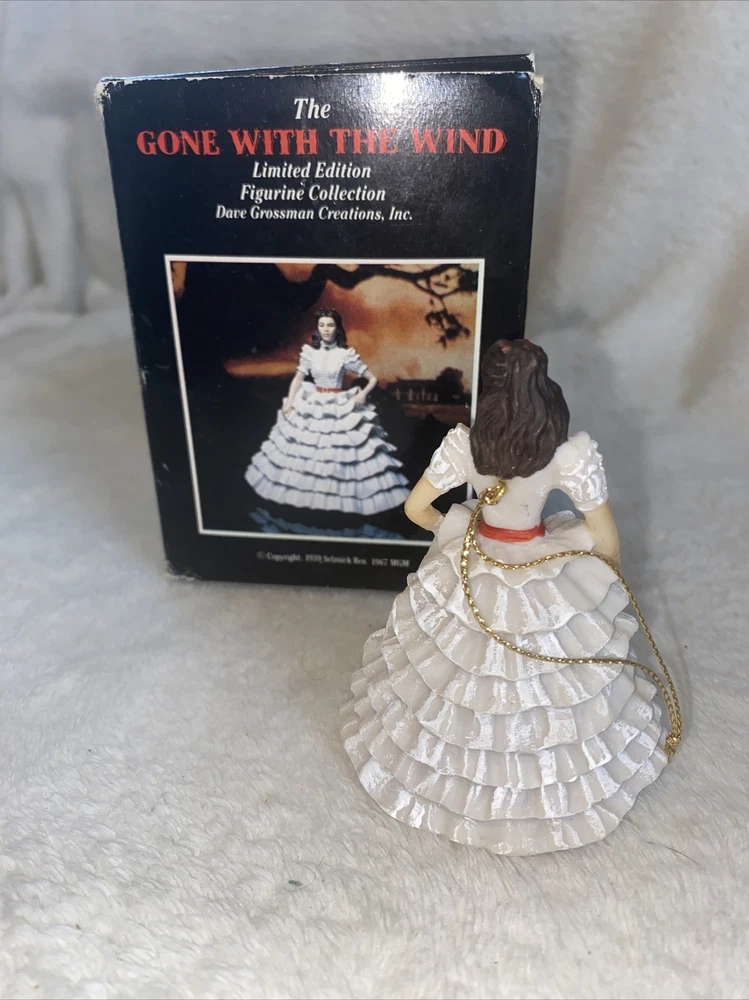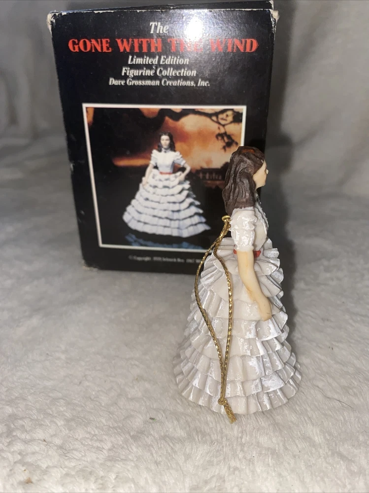 Celebrate the holiday season with this beautiful miniature figurine ornament featuring Scarlett O'Hara from the classic movie Gone With The Wind. The figure is crafted from high-quality ceramic and porcelain materials and comes in a retro style box, making it a perfect gift for any fan of the film. This collectible piece is from the Cameo Guild Studios and is designed by renowned artist Dave Grossman. It is a great addition to any ornament collection and can be displayed in any room. Don't miss out on the chance to own this timeless treasure!