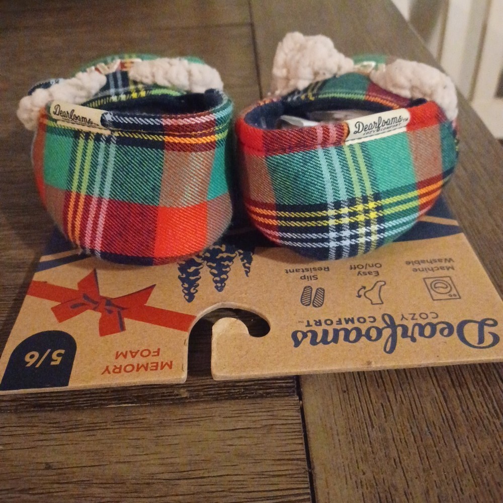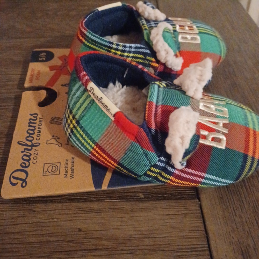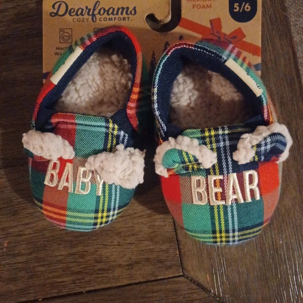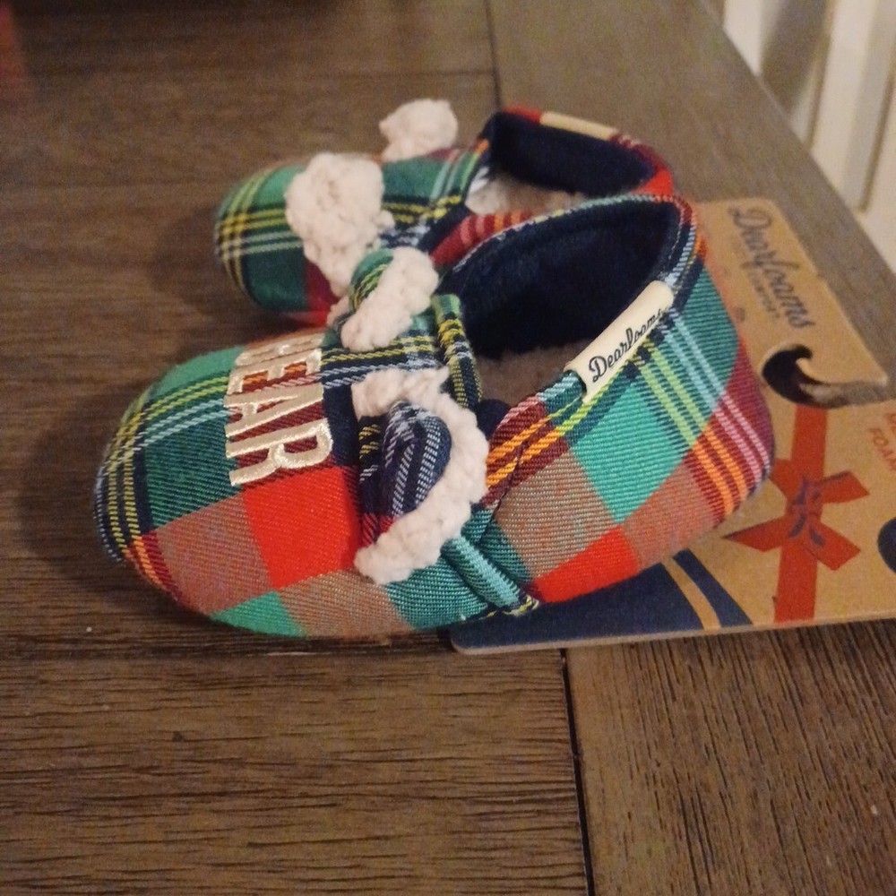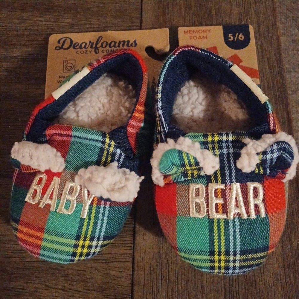 Introducing the Dearfoams Cozy Comfort slipper, perfect for your little one's casual wear. The slipper features a cute bear theme and plaid pattern that will make them look stylish all-year-round. Its slip-on closure allows for easy wear, while the flannel and faux fur lining material provides ultimate comfort. The slipper is made from memory foam and slip-resistant material, ensuring your child's safety and comfort as they play around. Available in size 5/6, this unisex baby and toddler slipper is perfect for all seasons, be it winter, summer, fall or spring.