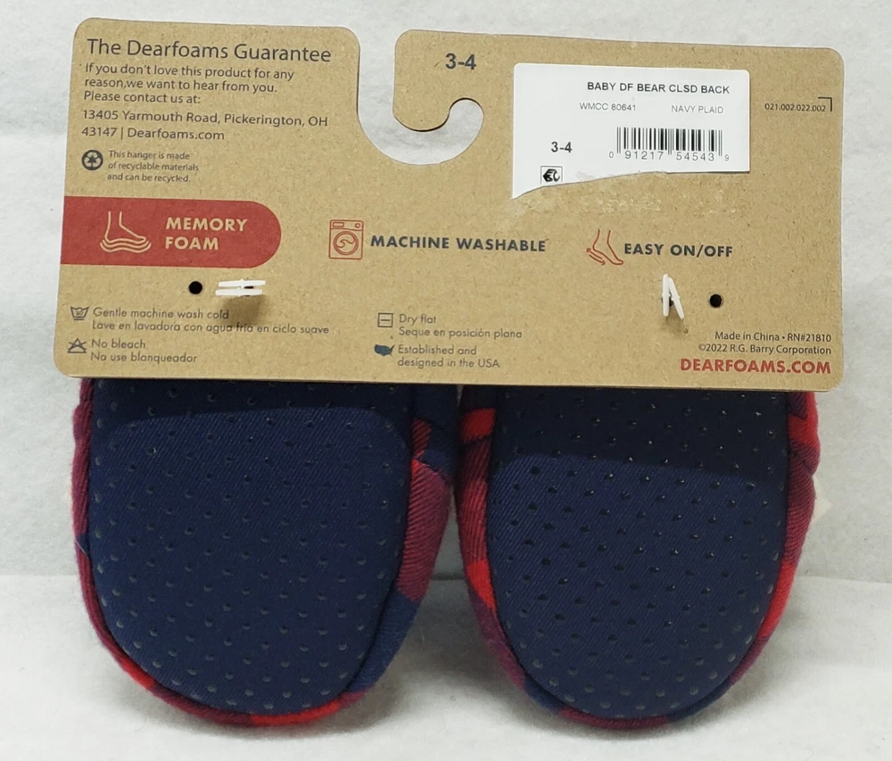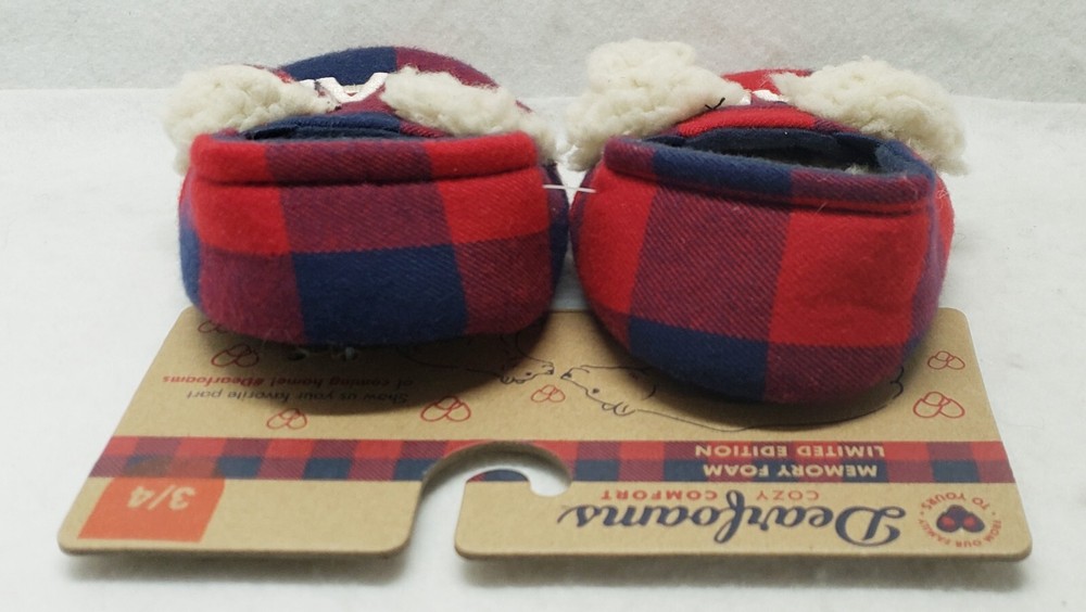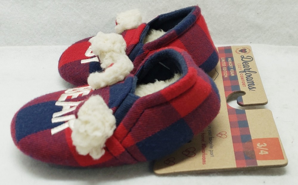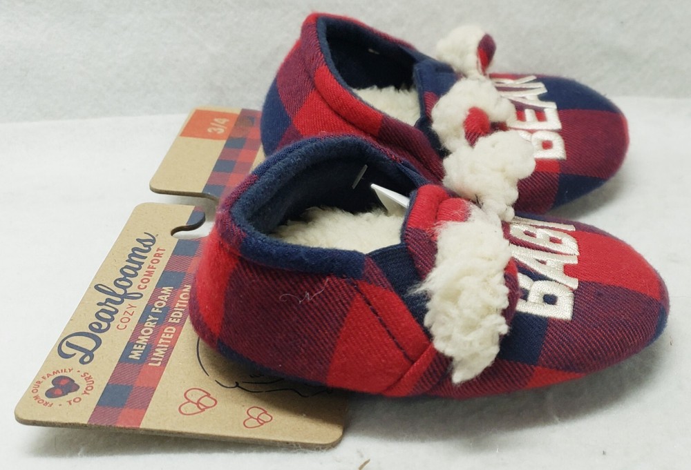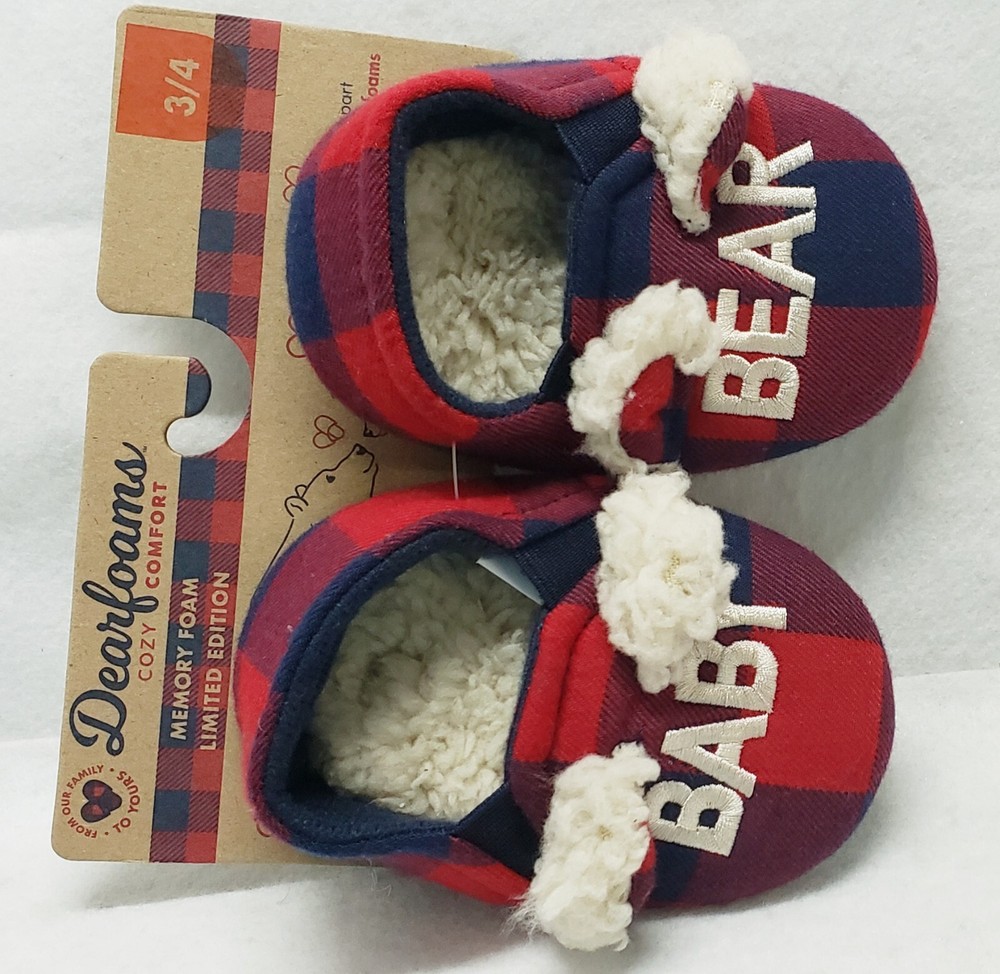 Dearfoams Cozy Comfort "Baby Bear" Plaid Closed Back Slippers Baby Size 3/4 Brand new Smoke free home The family that cuddles together, stays together! Perfect for Baby Bear, these slippers feature supersoft memory foam insoles, extra-cozy flannel lining, and charming designs that look too-cute next to the other members of our Matching Family Collection. Plaid upper with Baby Bear embroidery. Cozy flannel lining and teddy sock. Cushioned insole with gel memory foam for added comfort.