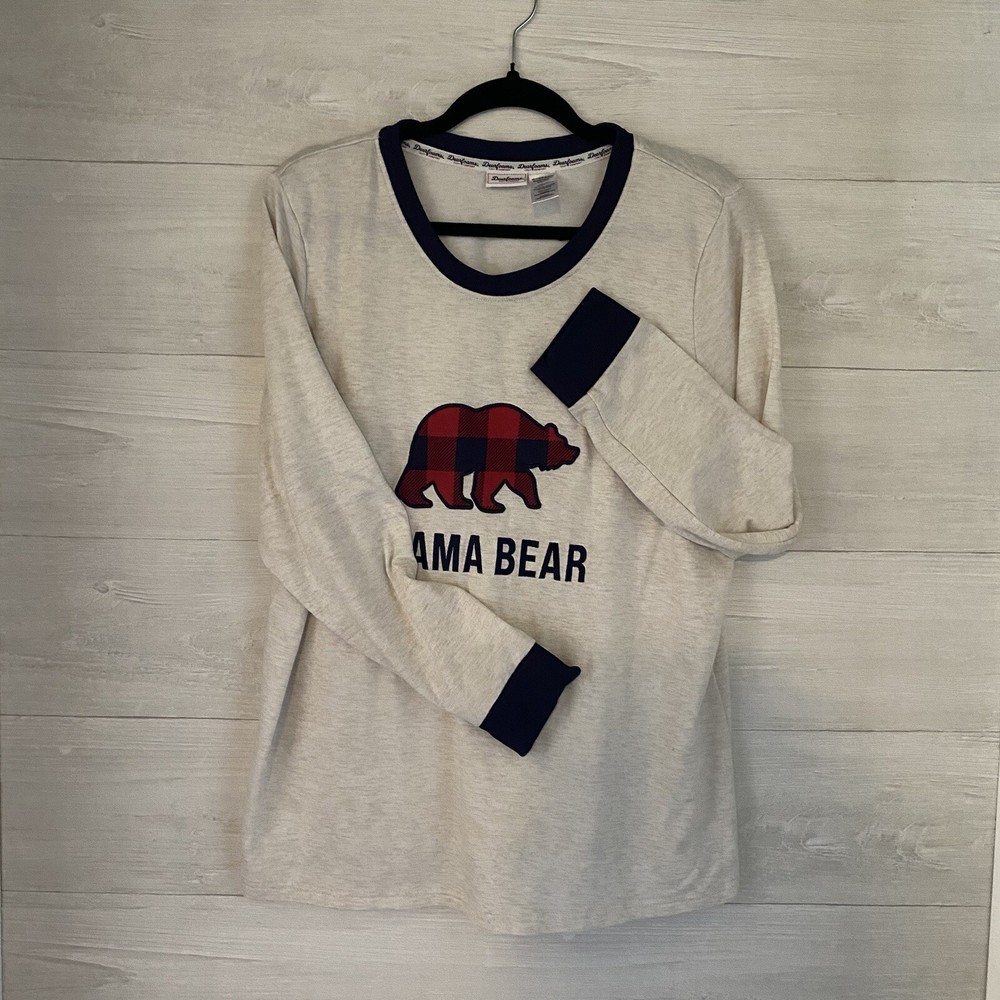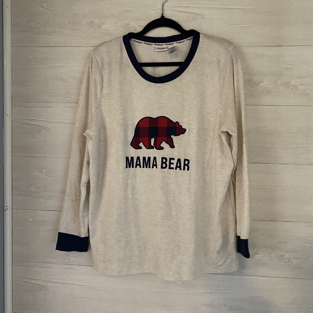 Enjoy cozy comfort with this Dearfoams pajama top in cream, black, and red featuring a cute "Mama Bear" design. Made for plus-sized women (3XL/22W-24W), this top has a round neckline and is perfect for lounging or sleeping. Ideal for those looking for sleepwear that is both comfy, soft, and stylish, this top is a must-have for any wardrobe.