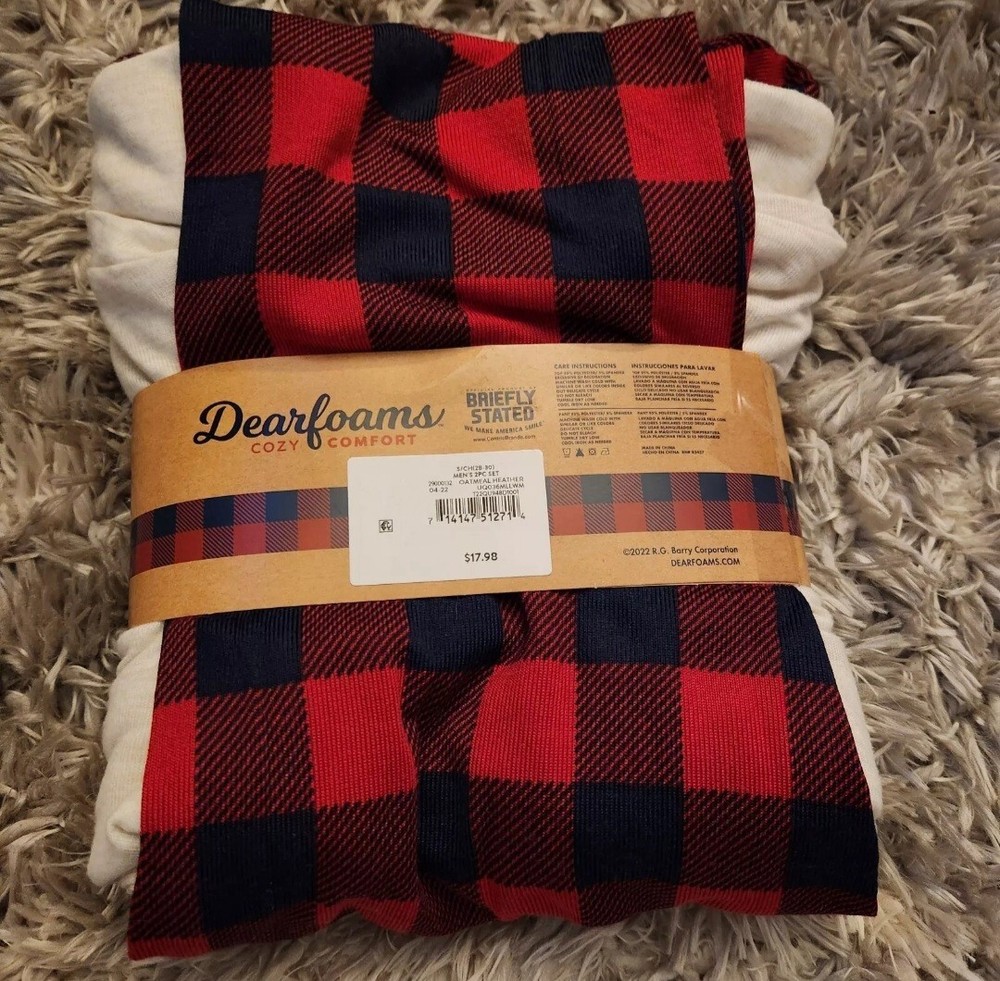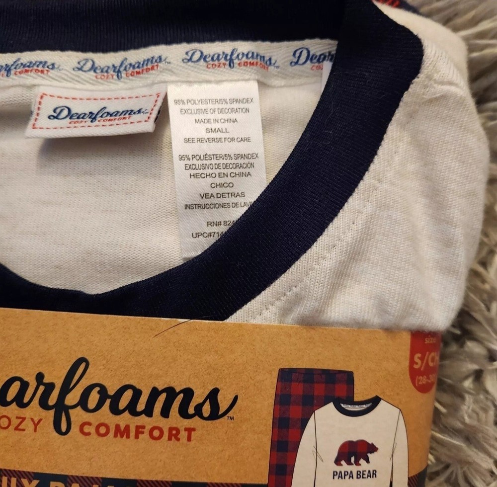 Snuggle up in this cozy and stylish Dearfoams pajama set, perfect for the winter season. The set includes a long-sleeved shirt and pants, both in a festive red check pattern and featuring a cute Papa Bear theme. Made from a soft and stretchy blend of polyester and spandex, these pajamas ensure maximum comfort while lounging around the house. With a size range of S/CH 28-30, this pajama set is perfect for men who want to relax in style. The set is brand new with tags and is a great addition to any sleepwear collection. Order now and get ready to cuddle up in comfort this winter season!
