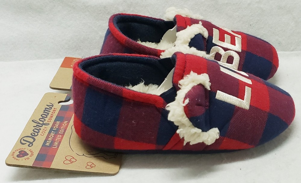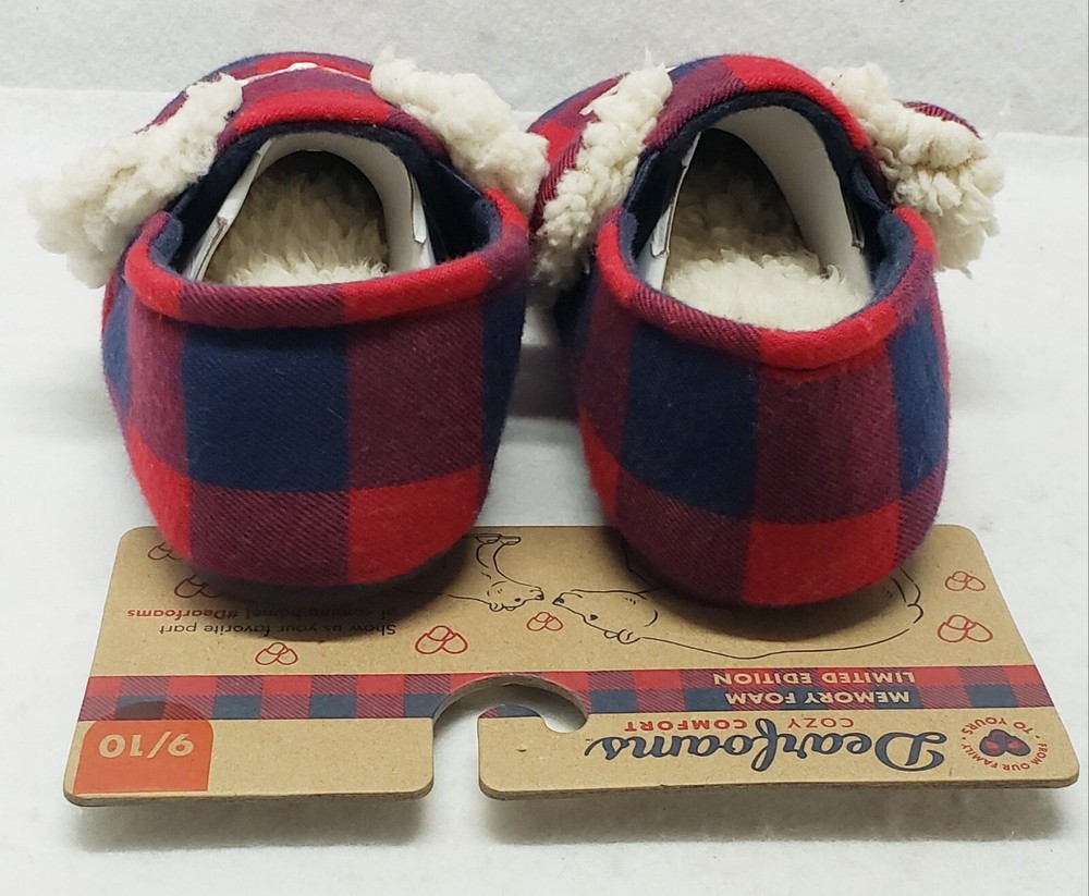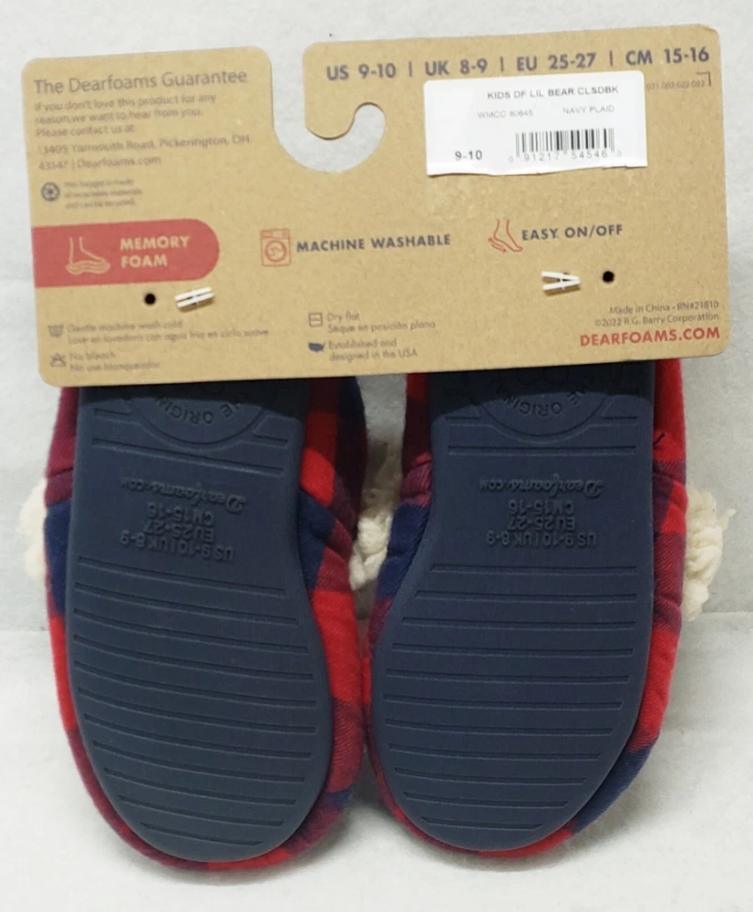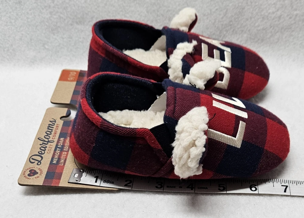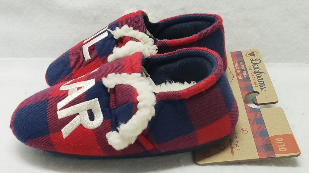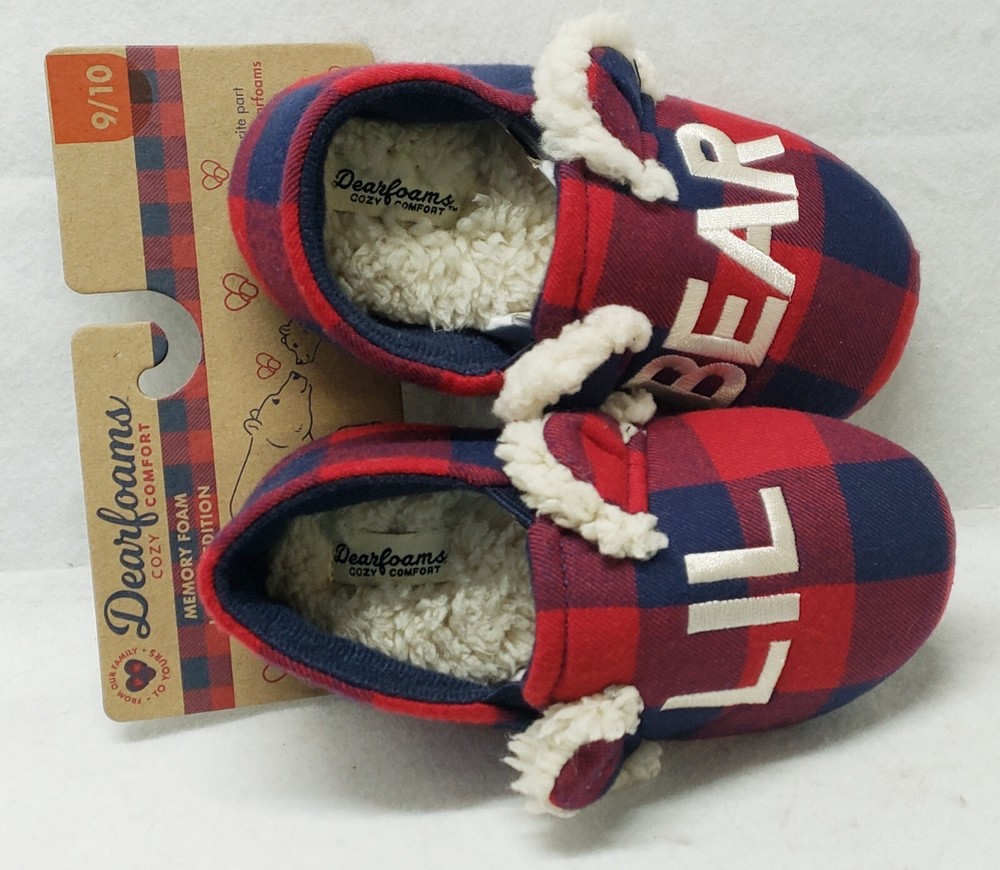 Dearfoams Cozy Comfort "Lil Bear" Navy Plaid Closed Back Slippers Toddler Kids' Size 9/10 Brand new Smoke free home The family that cuddles together, stays together! Perfect for Lil Bear, these slippers feature supersoft memory foam insoles, extra-cozy flannel lining, and charming designs that look too-cute next to the other members of our Matching Family Collection. Plaid upper with Lil Bear embroidery. Cozy flannel lining and teddy sock. Cushioned insole with gel memory foam for added comfort.