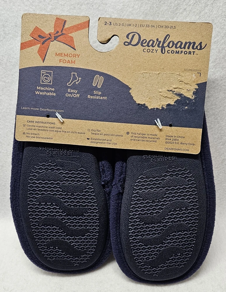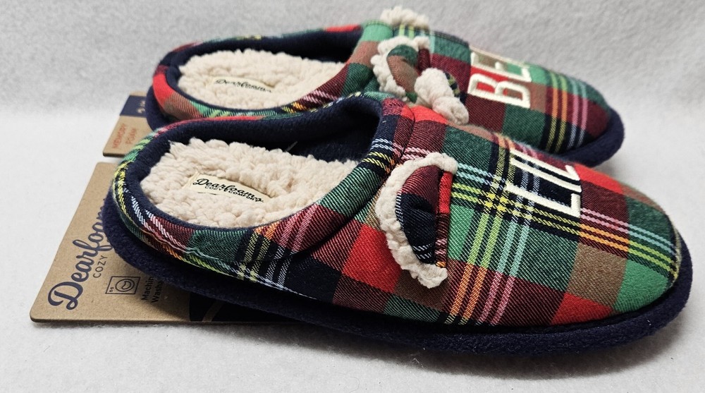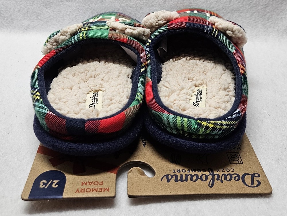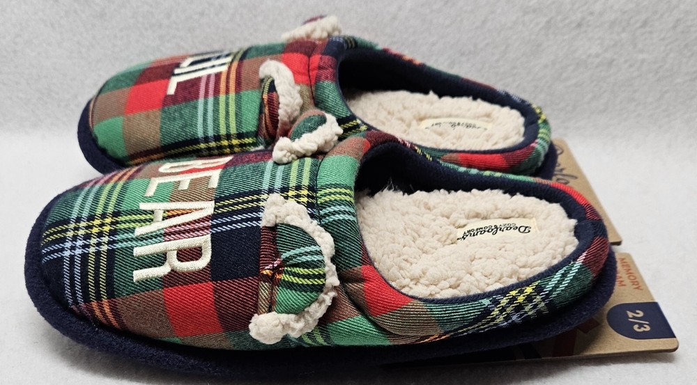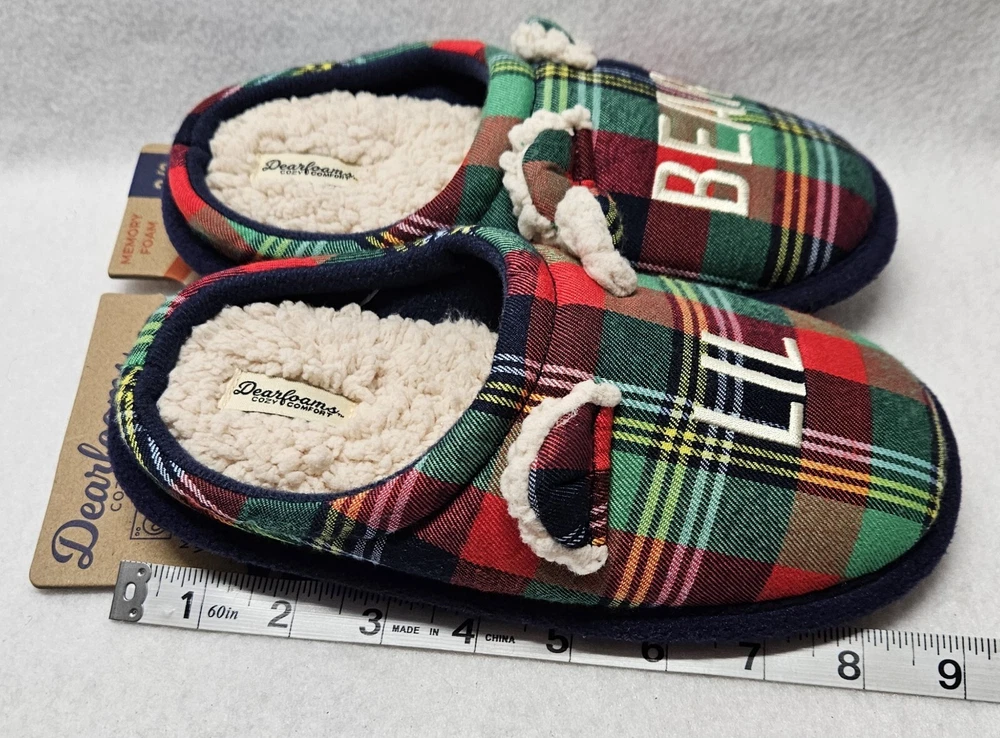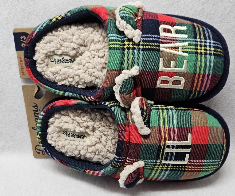 Dearfoams Cozy Comfort "Lil Bear" Plaid Slippers Youth Kids Size 2/3 Brand new Back of cardboard tag has some sticker damage Smoke free home Dearfoams Cozy Comfort Plaid Family Bear Slippers. Featuring slip-resistant, easy on/off designs, these cozy memory foam insoles are the perfect pick for a comfy night in with the whole family. Machine washable designs make quick cleaning a breeze, ensuring your slippers stay fresh for the long haul! Machine washable: don't stress over spills; your slippers are sure to stay fresh for the long haul with convenient, easy-clean designs. Easy on/off: comfort's just a step away thanks to the easy on/off designs of these clogs. Slip-resistant: thanks to slip-resistant outsoles, this style is the perfect pick for relaxing around the house. Memory foam: our superior comfort memory foam insoles cradle your feet with every step. Memory foam Woven plaid upper. Flannel lining. Faux fur footbed.