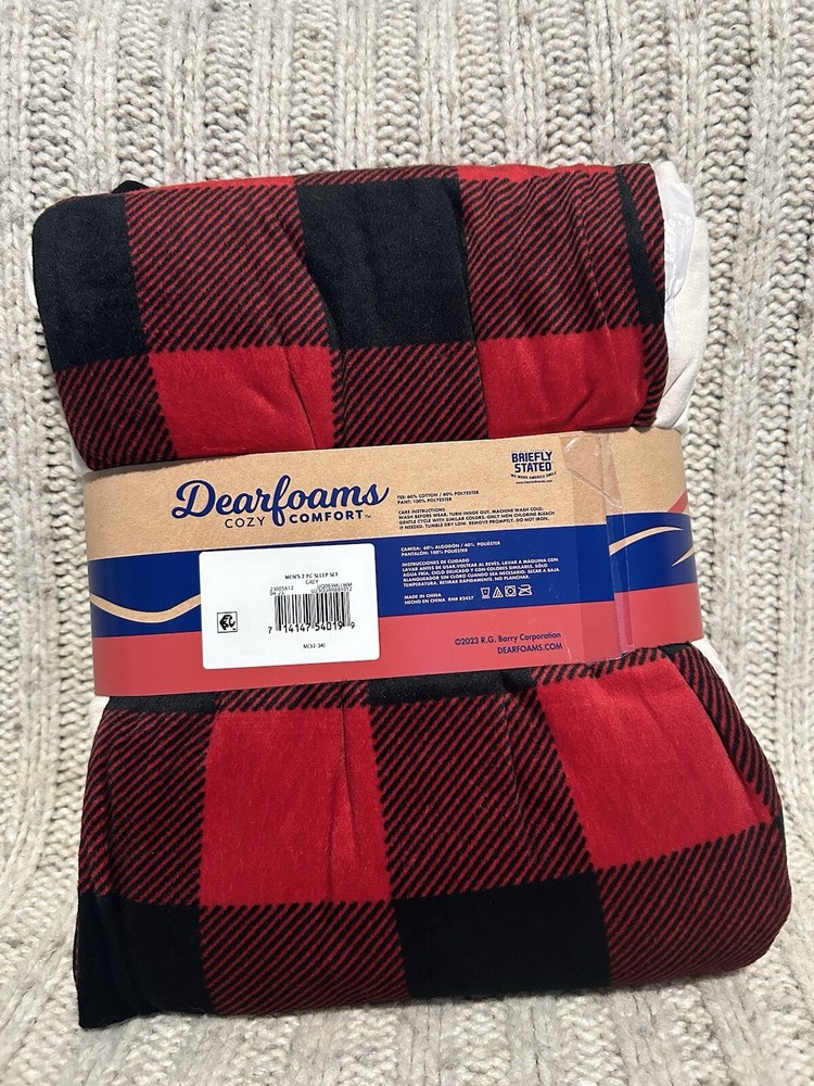 Dearfoams Cozy Comfort Mens 2 Piece Sleep Set Red Plaid Size Medium 32-34. Brand new. Stored at room temperature in smoke/pet free space. Refer to pictures for color and pattern details. Let me know if you have any questions. Thanks so much for stopping by.