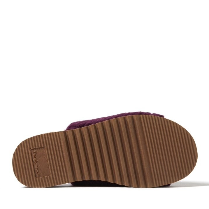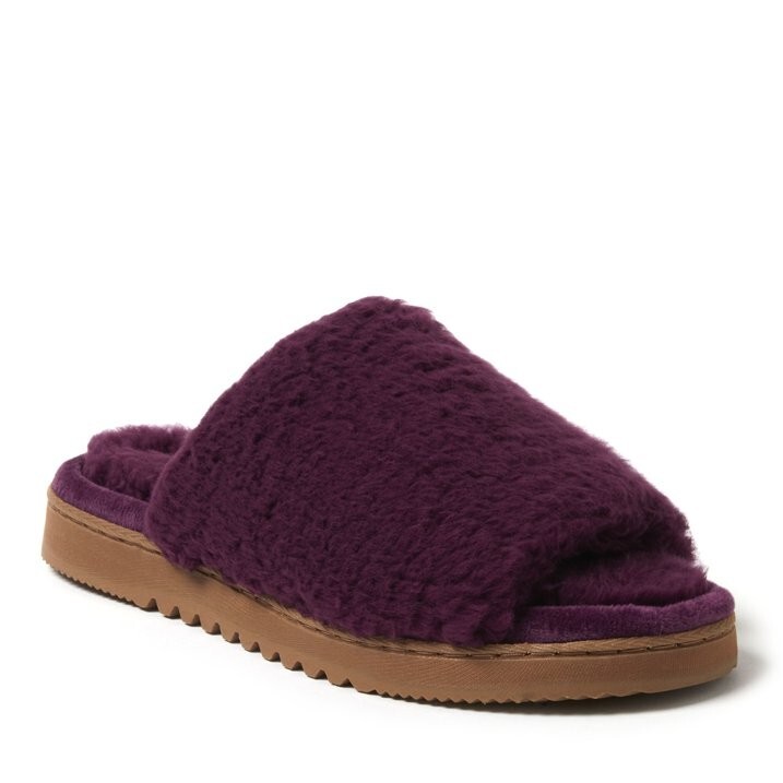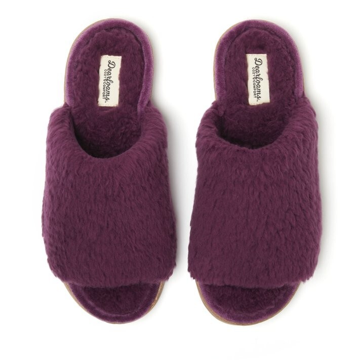 Dearfoams Cozy Comfort Women's Teddy Pile Open Toe Scuff Slippers. Treat your feet to superior comfort no matter where you relax thanks to these indoor/outdoor slippers. Our temperature regulating slippers are a smart choice no matter the weather, and when it's time for a quick refresh, these machine washable slippers are a breeze to clean. Temperature regulating: no matter the weather, these slippers are sure to help you stay cozy or cool. Machine washable: don't stress over spills; your slippers are sure to stay fresh for the long haul with convenient, easy-clean designs. Indoor/outdoor support: relax wherever the day takes you with durable and convenient indoor/outdoor outsoles. Memory foam: our superior comfort memory foam insoles cradle your feet with every step. Gel memory foam Faux fur upper. Flannel lining. Faux fur footbed. Country of Origin - Textiles Imported Size Women's 5-6 Shoe Size 5/6 Gender Female Shoe Category Women's Shoes Brand Dearfoams Manufacturer Part Number 091217596486 Manufacturer RG Barry Corporation Color Aubergine Fabric Care Instructions Gentle machine wash cold. Do not bleach. Dry flat.