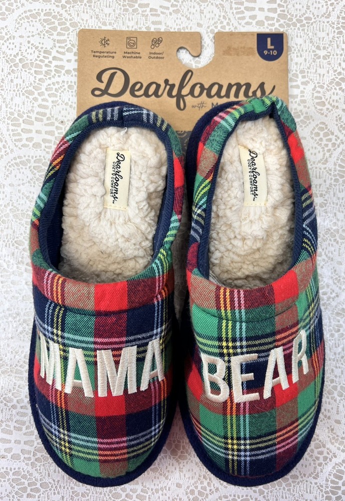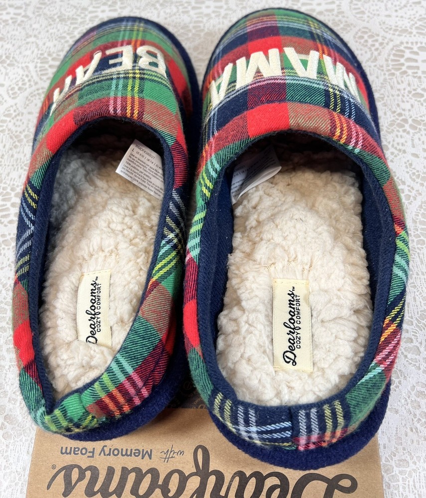 Dearfoams Cozy Memory Foam "MAMA BEAR" Plaid Slippers Slip On NEW SZ 9-10. New, still attached original cardboard. Slip-on, machine washable, non skid sole. Women's size LG (9-10).