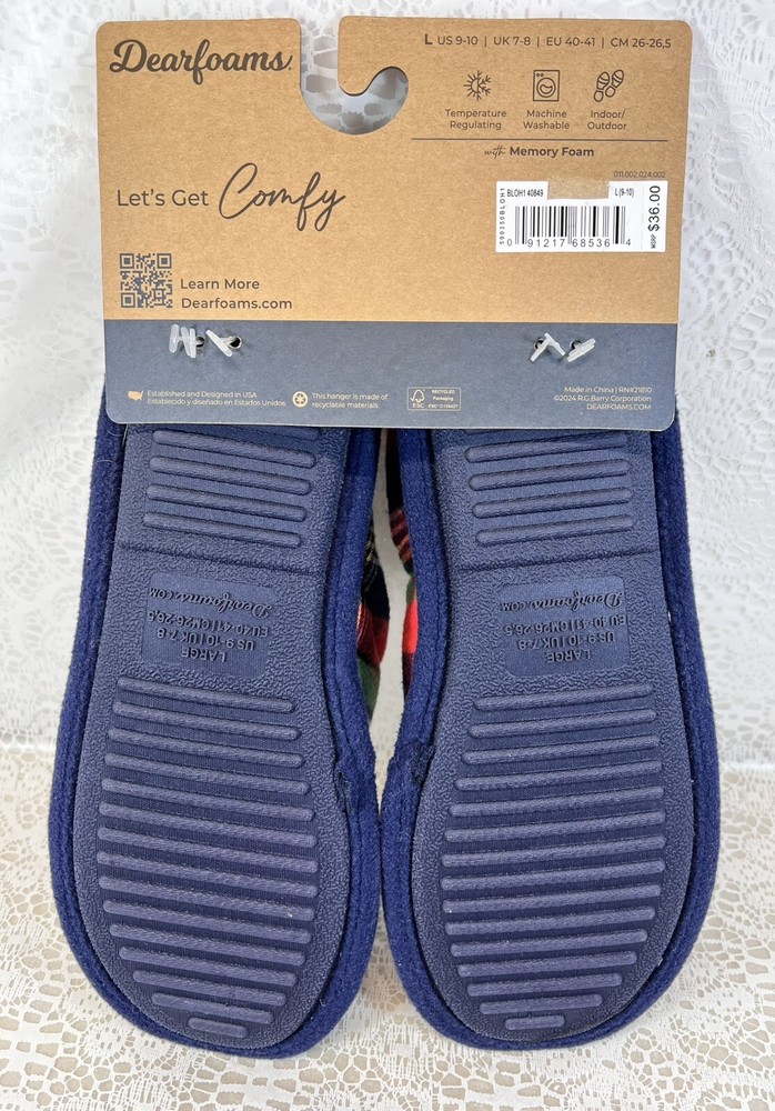 Dearfoams Cozy Memory Foam "MAMA BEAR" Plaid Slippers Slip On NEW SZ 9-10. New, still attached original cardboard. Slip-on, machine washable, non skid sole. Women's size LG (9-10)....