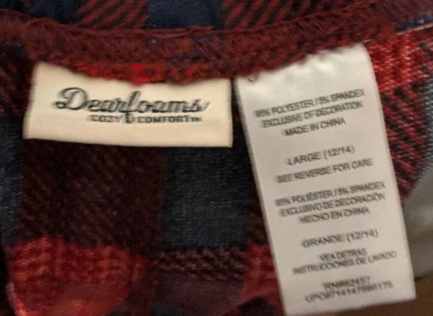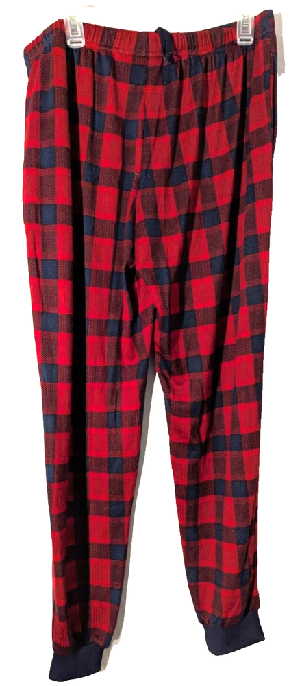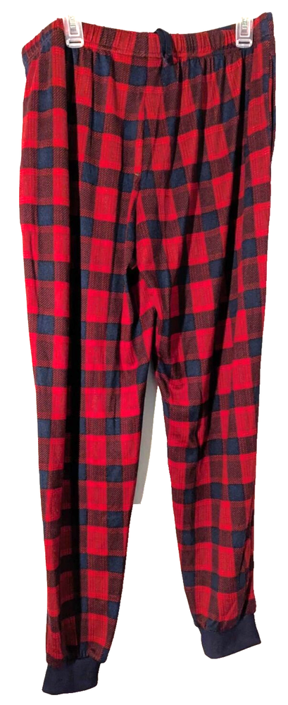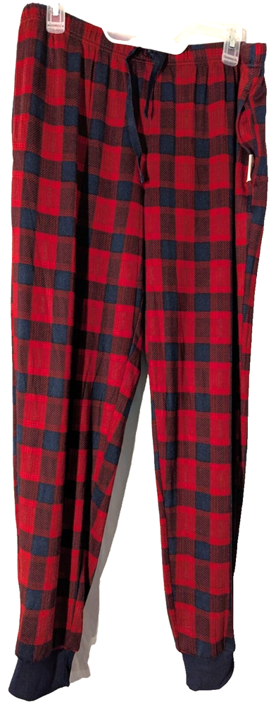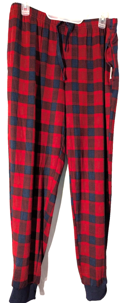 Step into a warm, cozy winter night with these Dearfoams flannel pajama pants. Their classic red and navy plaid design evokes a sense of nostalgia, while the soft fabric wraps you in ultimate comfort. Perfectly tailored with an elastic waistband and drawstring, they ensure both style and a relaxed fit. • Elastic waistband with adjustable drawstring • Soft flannel fabric for warmth • Red and navy plaid pattern • Cuffed ankle hem for snug fit • Side pocket for convenience No visible flaws. Measurements: inseam = 33 inches, waist laid flat = 17 inches.