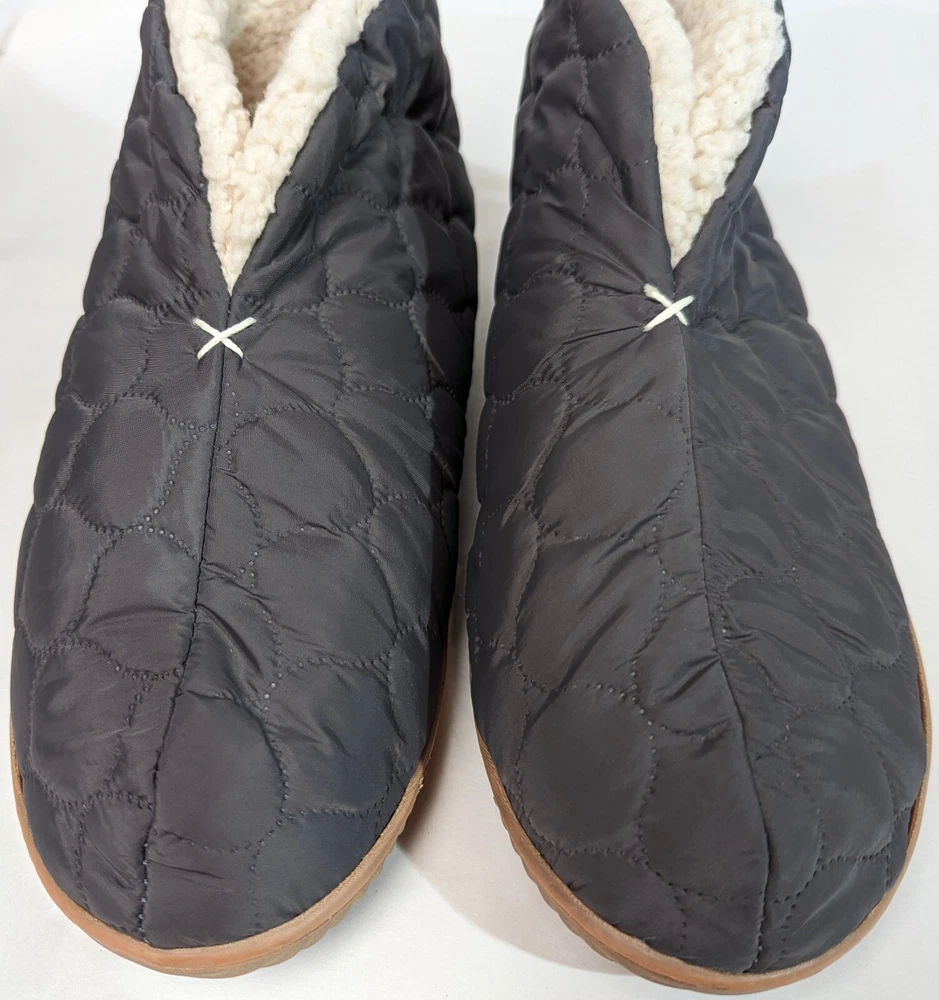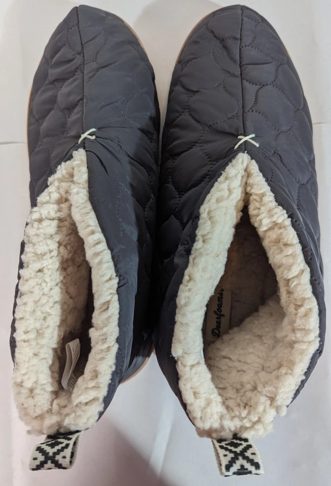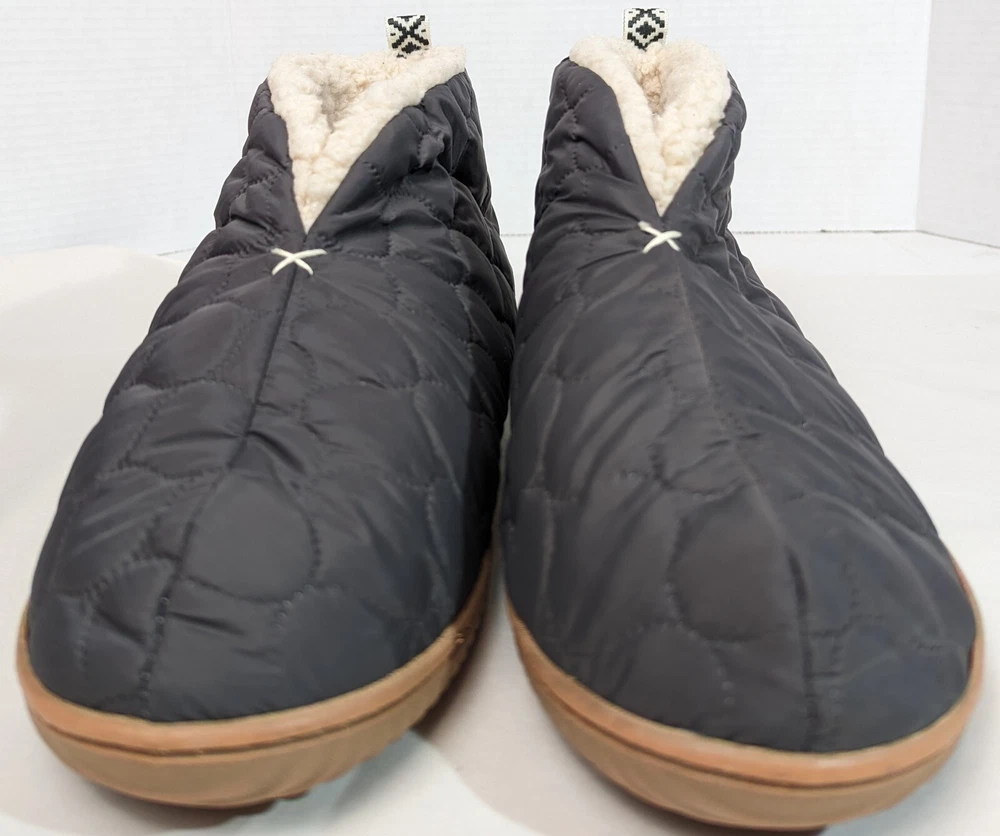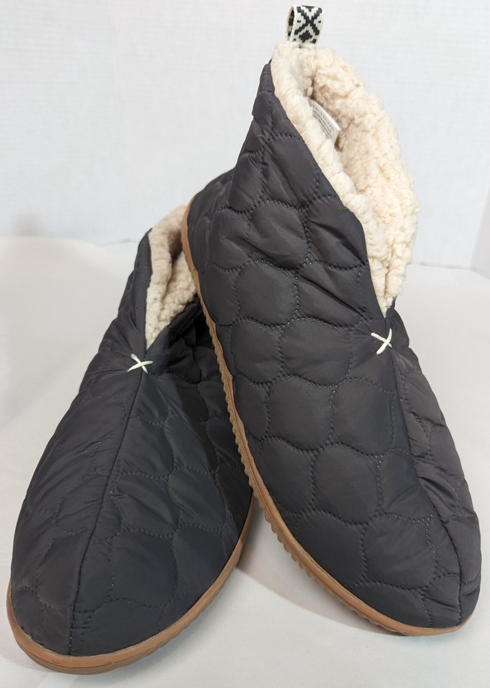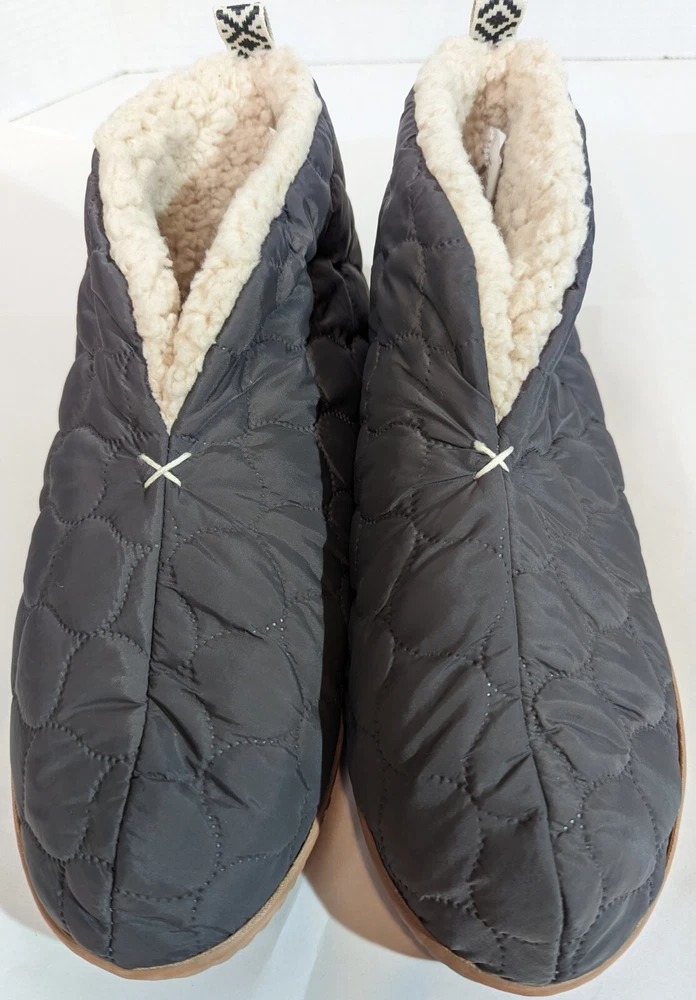 Seller's Note: these cozy slippers were never worn. They are in perfect condition: the outsoles are free of wear and stains and the insoles are brand new (c f: pictures). These beautiful slippers are ready to be worn and... loved! Stay cozy and comfortable with these slipper booties from Dearfoams. These gray booties feature a round toe shape and pull-on entry with a rear pull tab for easy wear. The slipper booties are lined with polyester faux fur and cushioned with memory foam for added comfort. The insole is made of polyester faux fur, while the outsole is made of thermoplastic rubber. These booties are perfect for travel or casual wear. The sherpa-lined slipper booties are available in a size US L 11-12. The solid gray color and Dearfoams Ultra Comfort model make these booties warm and cozy.
