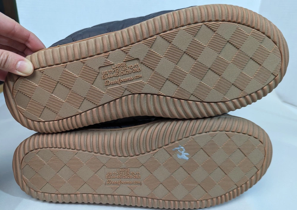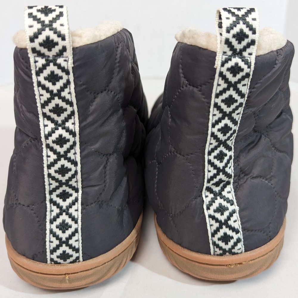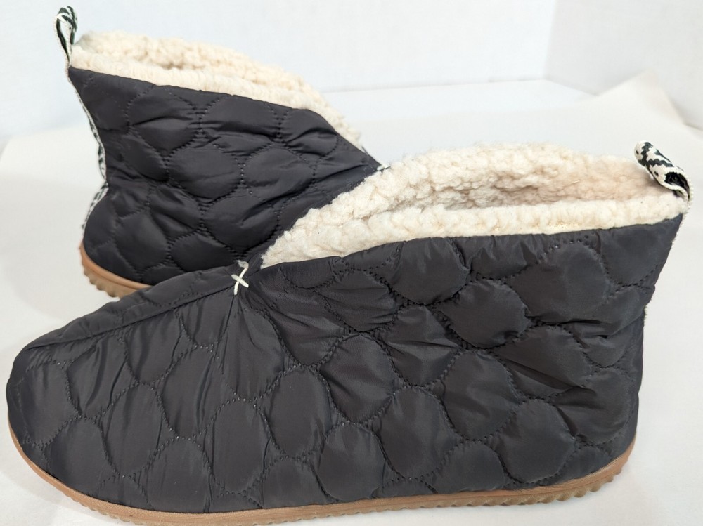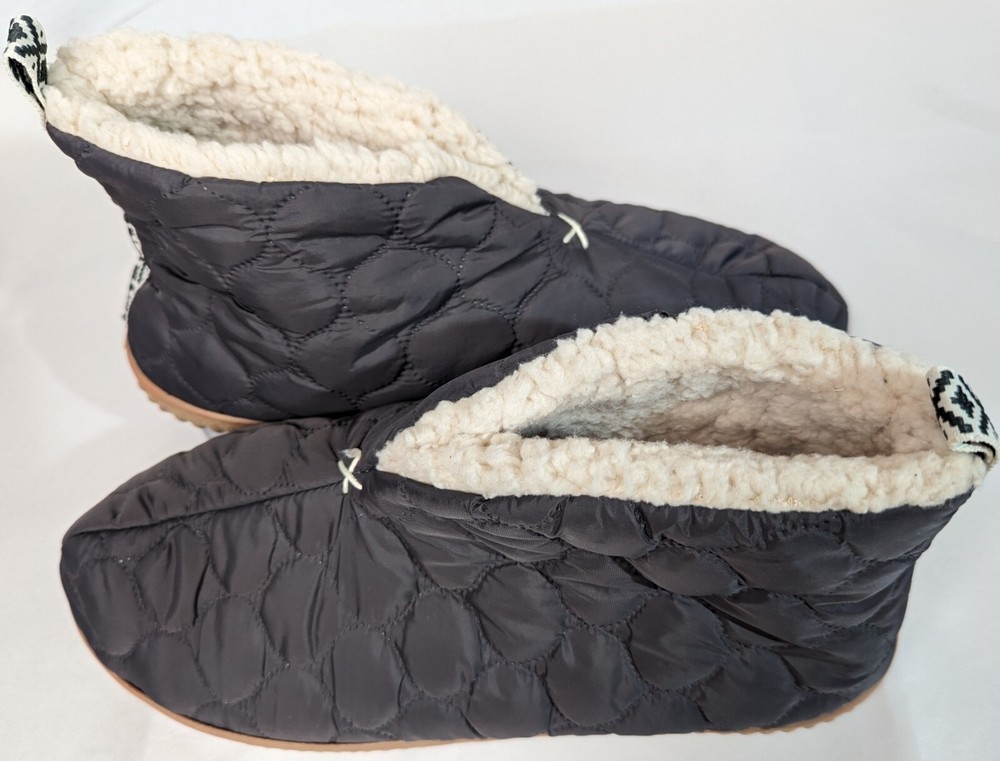 Seller's Note: these cozy slippers were never worn. They are in perfect condition: the outsoles are free of wear and stains and the insoles are brand new (c f: pictures). These beautiful slippers are ready to be worn and... loved! Stay cozy and comfortable with these slipper booties from Dearfoams. These gray booties feature a round toe shape and pull-on entry with a rear pull tab for easy wear. The slipper booties are lined with polyester faux fur and cushioned with memory foam for added comfort. The insole is made of polyester faux fur, while the outsole is made of thermoplastic rubber. These booties are perfect for travel or casual wear. The sherpa-lined slipper booties are available in a size US L 11-12. The solid gray color and Dearfoams Ultra Comfort model make these booties warm and cozy.