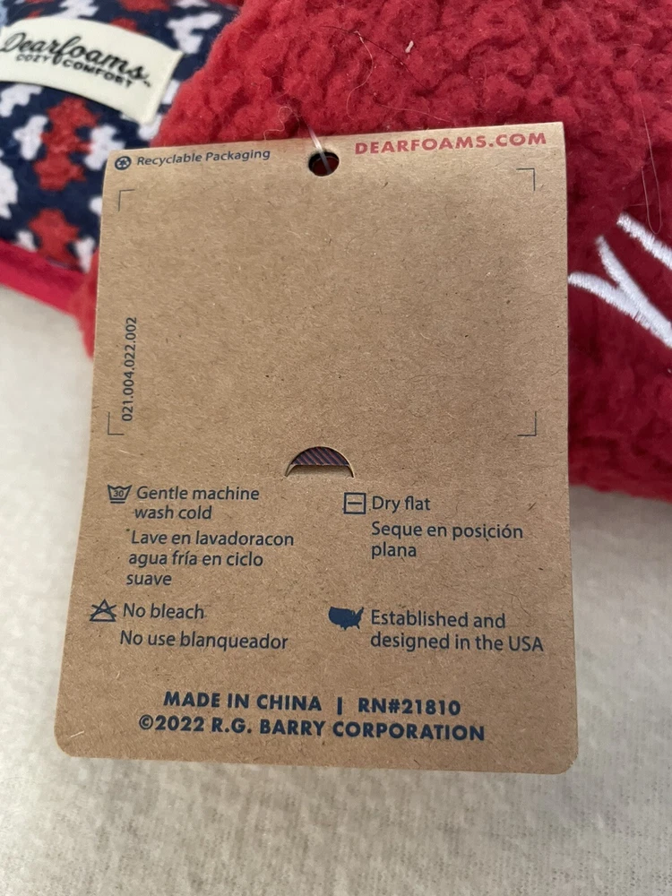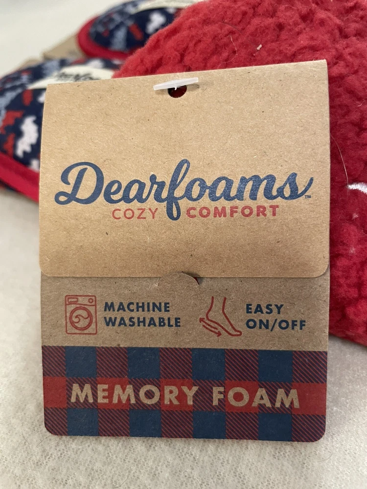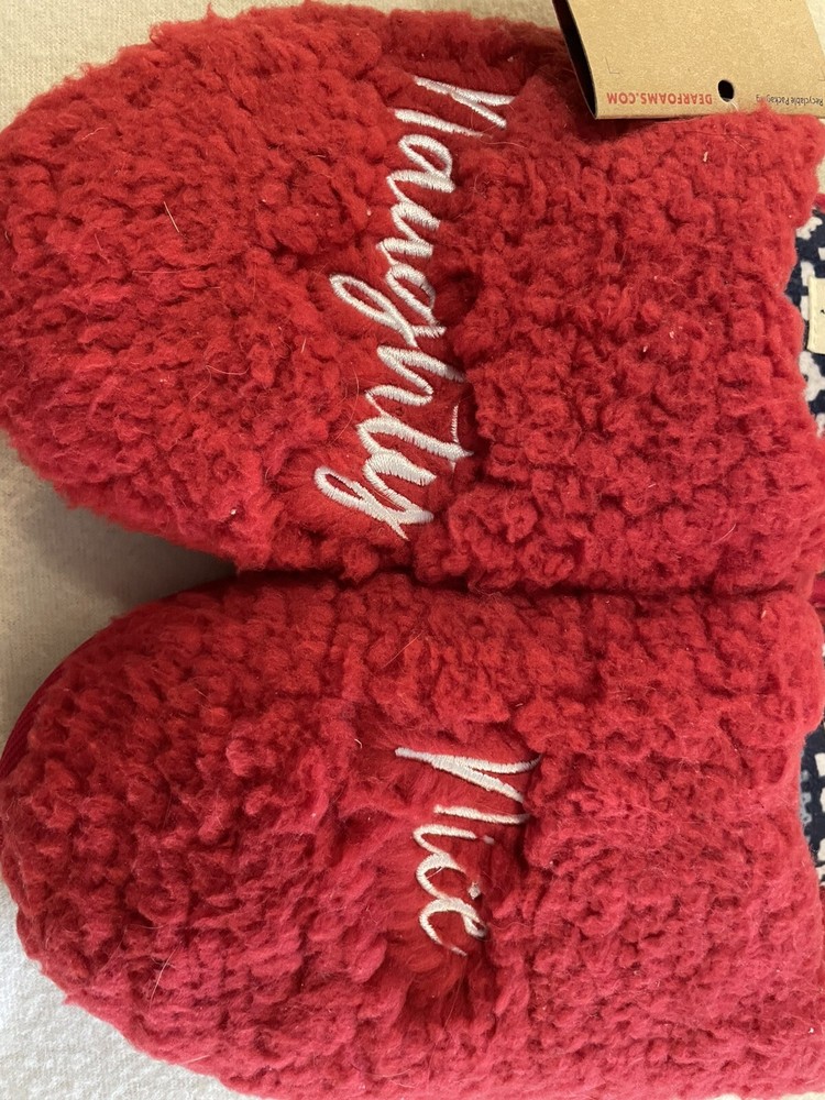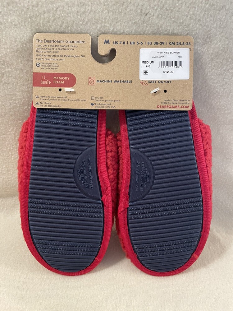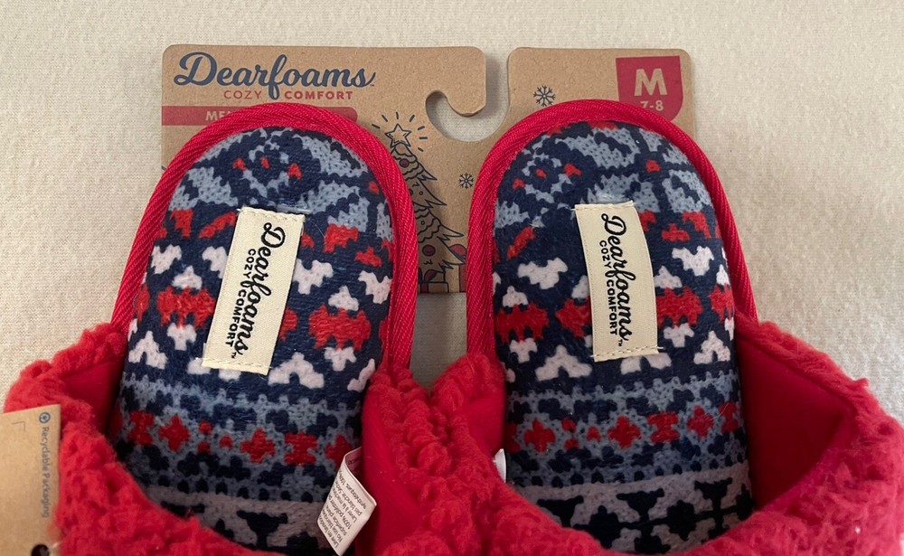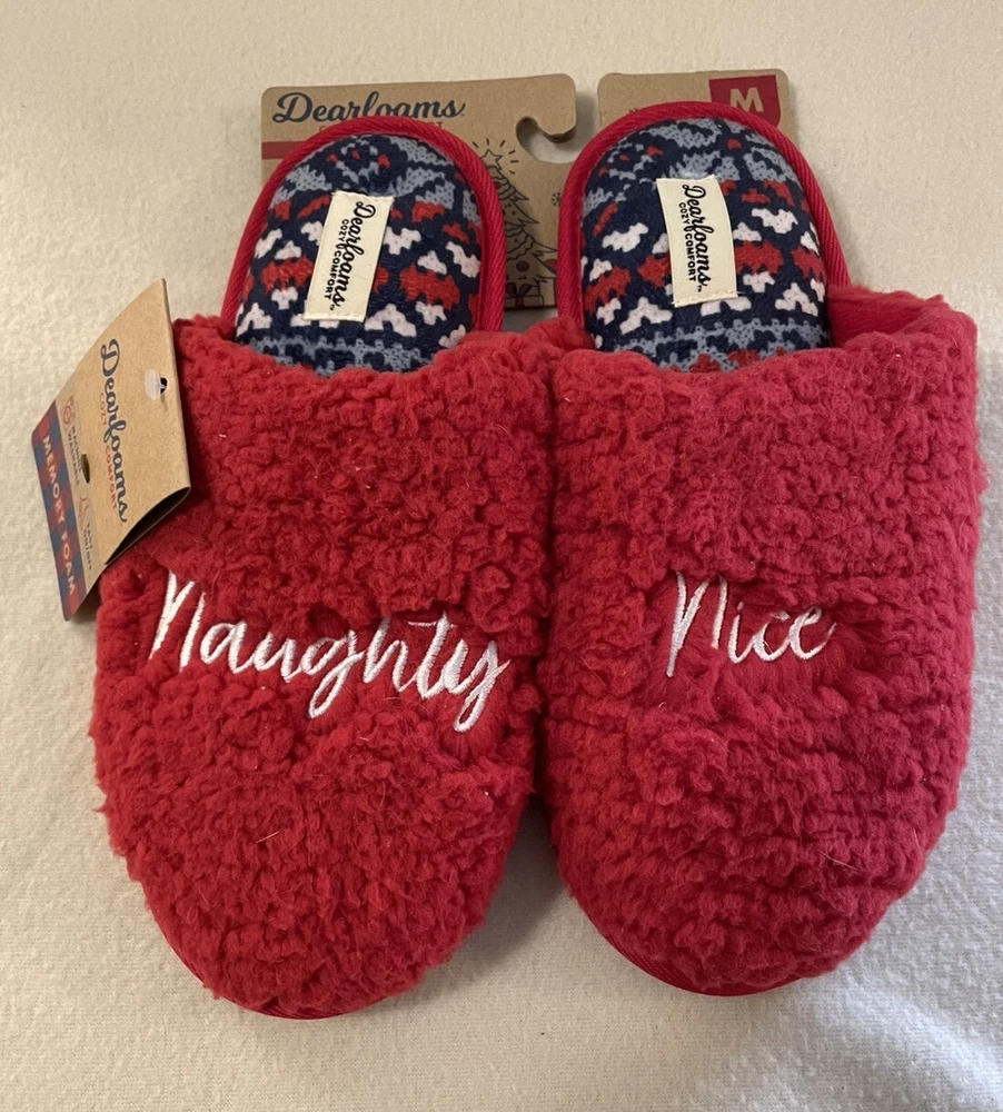 Step into cozy comfort with these Dearfoams Women's Medium Red Naughty Nice Memory Foam Slippers. The faux fur lining and embroidered accents add a touch of luxuriousness to your at-home wardrobe. The slip-on style and flat heel make them perfect for lounging around the house during the winter season. These slippers come in a playful red color with a naughty nice theme, making them the perfect addition to your cozy night in routine.