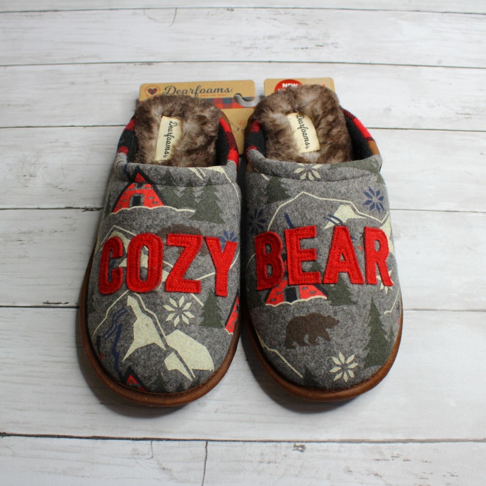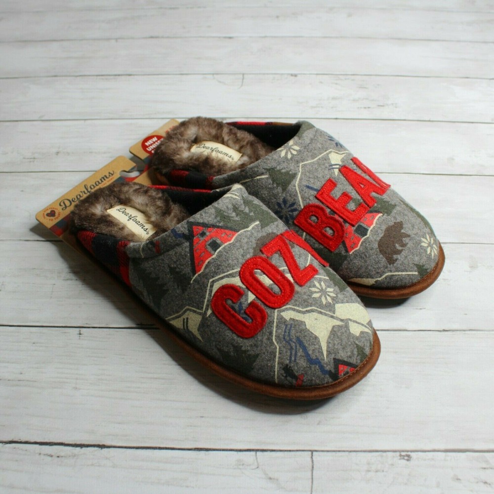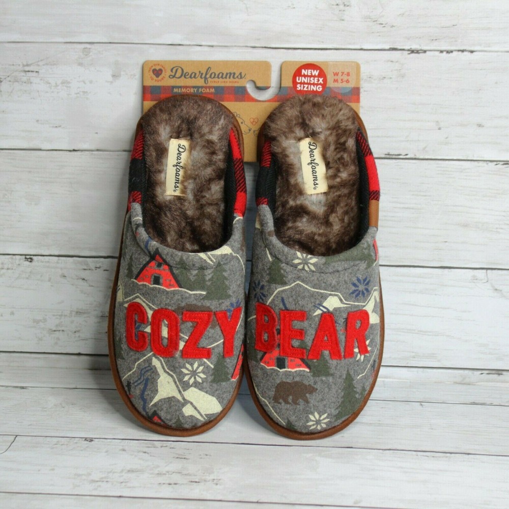 Dearfoams Cozy Bear Memory Foam Scuff Slip on Slippers Machine Washable Women's Size 7-8 These slip on scuff slippers have heather gray felt uppers with rustic ski chalet scenes with red a-frame cabins, green pine trees, brown grizzly bears and little figures snow skiing. The insoles have thick memory foam cushion with brown faux fur insoles and black lining. The outsoles are durable for both indoor & outdoor use. They are extremely nice in quality are brand new with tags. Unisex Sizing Fits: Women's Size 7-8 Men's Size 5-6 Youth Boy Size 5-6