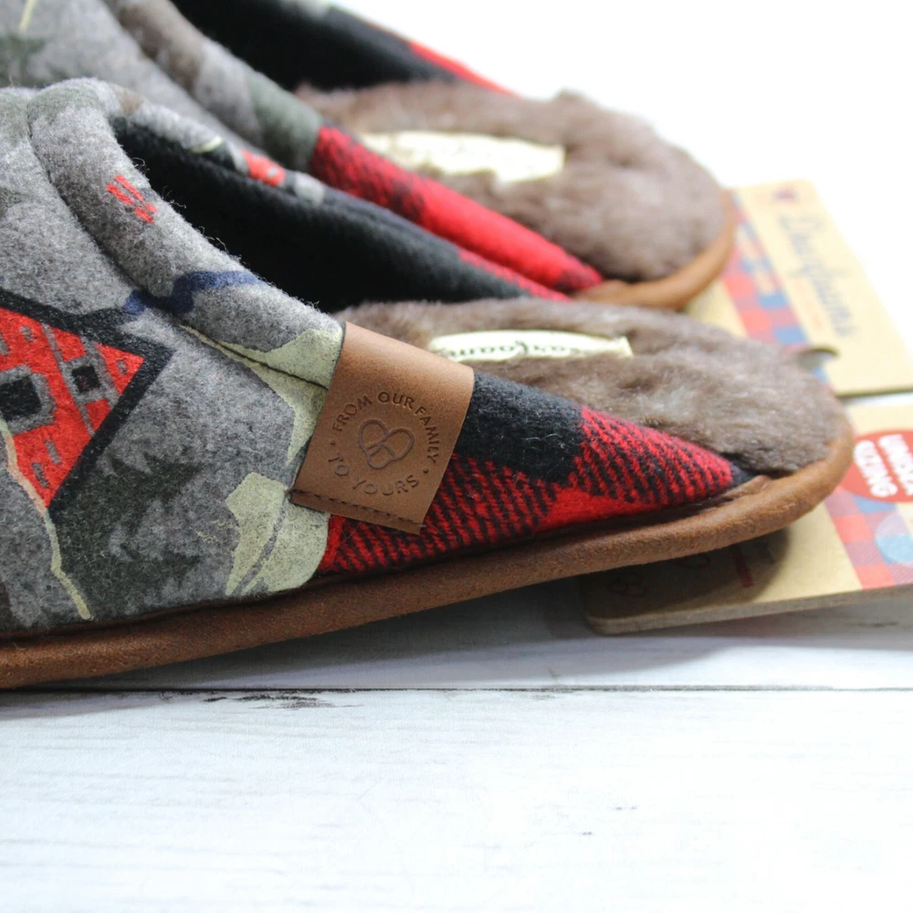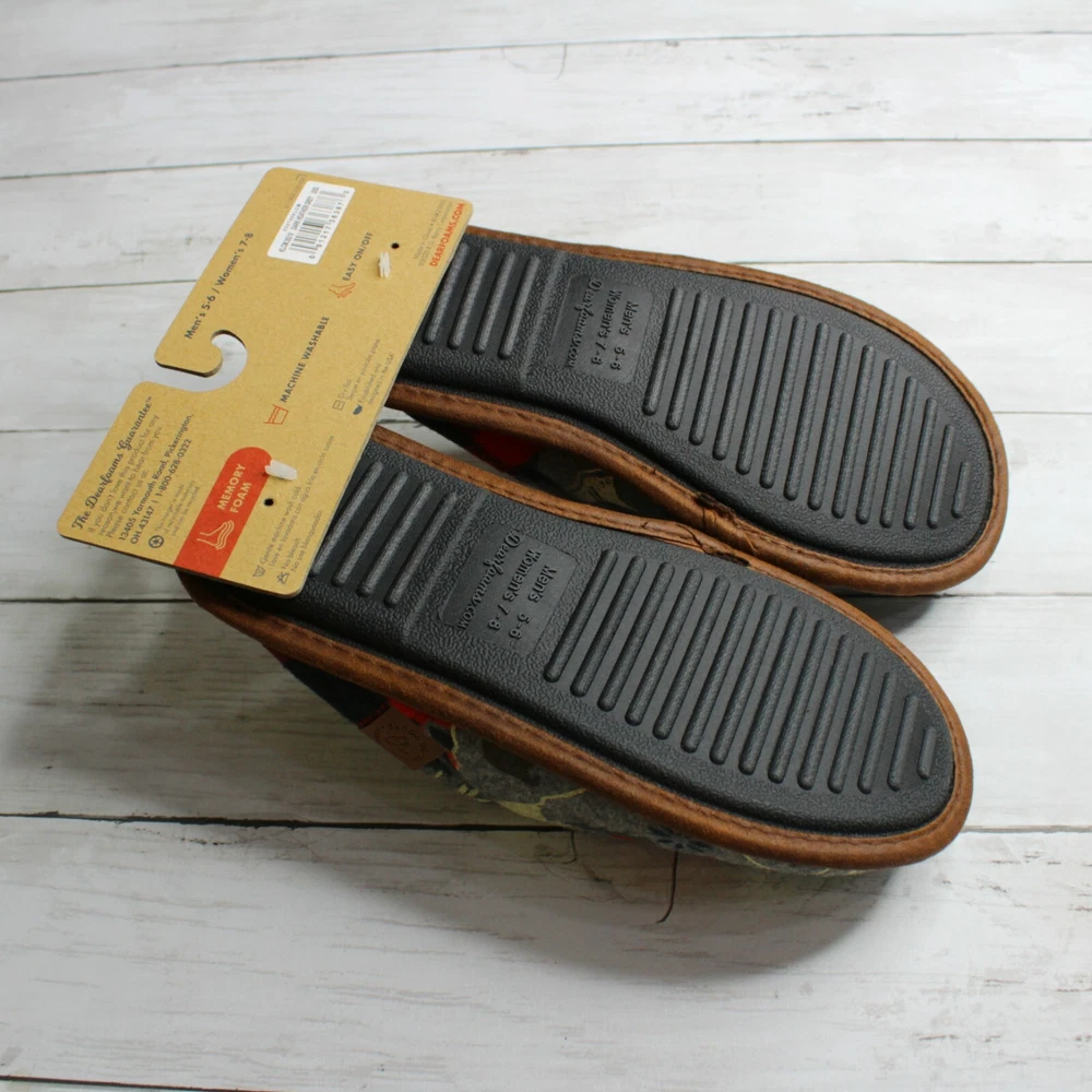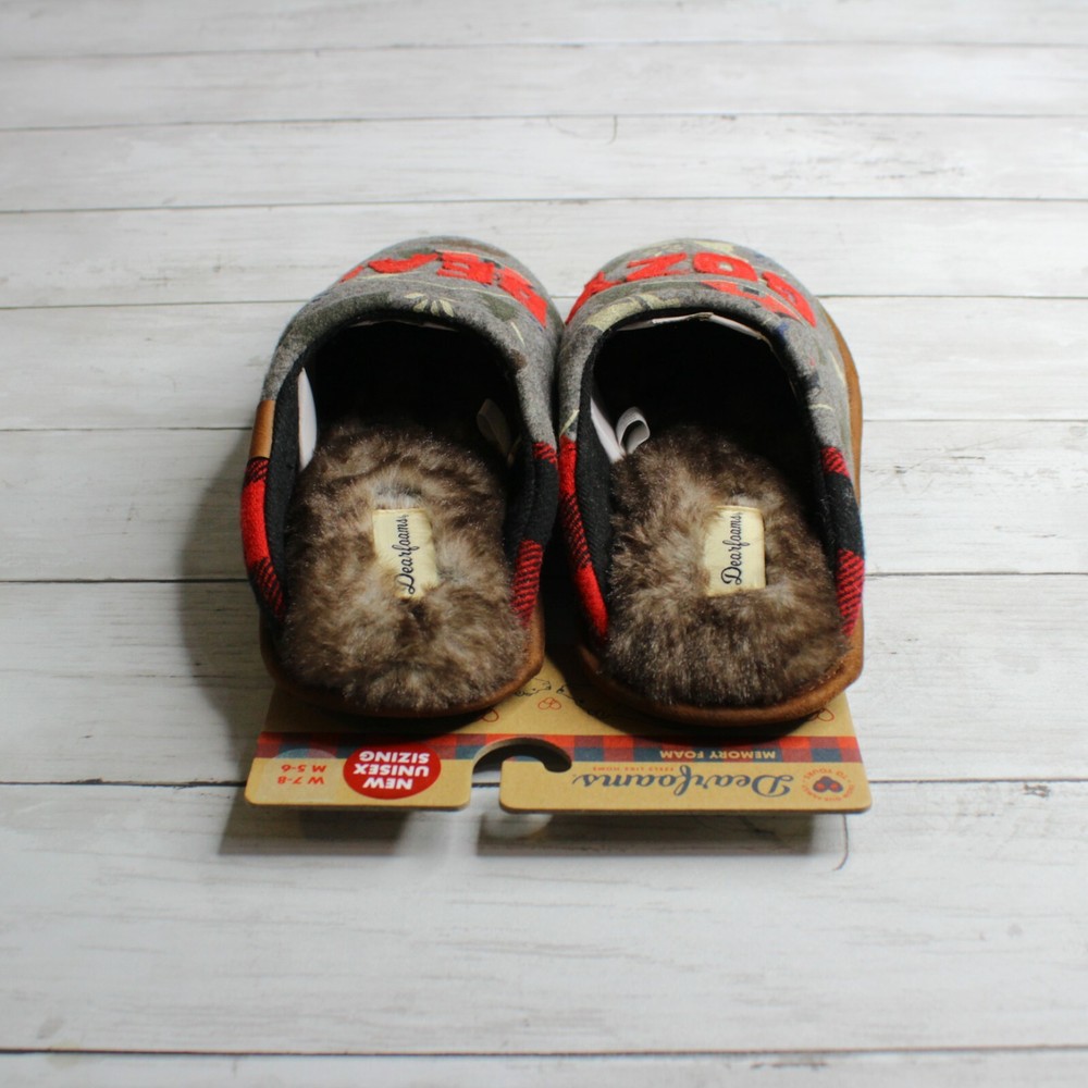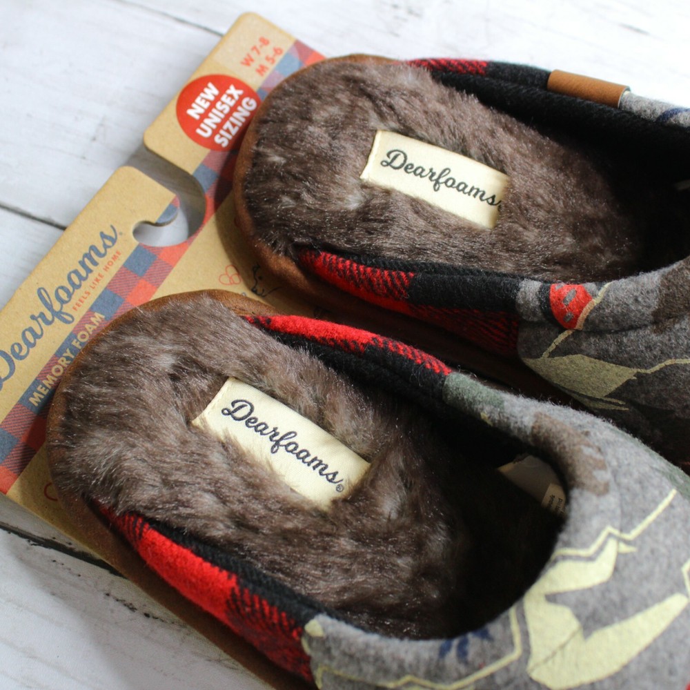 Dearfoams Cozy Bear Memory Foam Scuff Slip on Slippers Machine Washable Women's Size 7-8 These slip on scuff slippers have heather gray felt uppers with rustic ski chalet scenes with red a-frame cabins, green pine trees, brown grizzly bears and little figures snow skiing. The insoles have thick memory foam cushion with brown faux fur insoles and black lining. The outsoles are durable for both indoor & outdoor use. They are extremely nice in quality are brand new with tags. Unisex Sizing Fits: Women's Size 7-8 Men's Size 5-6 Youth Boy Size 5-6