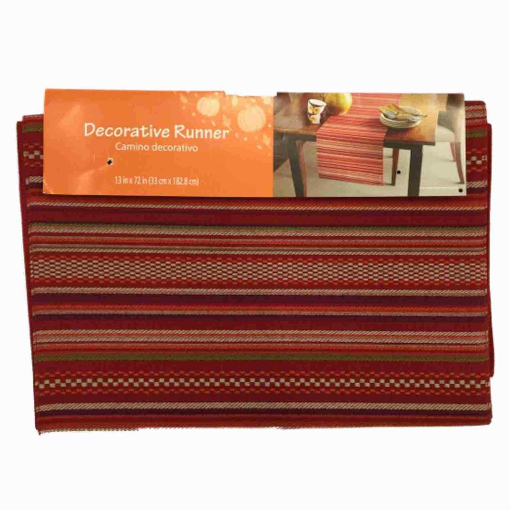 Decorative Fiesta Autumn Stripe Woven Table Runner, Red & Rust Earth Tones, 72" This pretty woven fabric table runner has a great look! It features an autumn pattern of earth tone stripes in shades of red, rust, beige and green. It will add a nice touch to any table Woven stripe fabric table runner Autumn pattern of earth tone stripes in shades of red, rust, beige and green Reverse is solid red Measures 13 inches by 72 inches Made from 55% cotton 45% polyester with 100% polyester back Spot clean Brand is Mainstays Payment We accept PayPal as our payment method. Immediate payment is required. If you have any questions about payment, please feel free to contact our customer support team. Return Policy We have a no hassle return policy If you are unhappy with your purchase, please contact us within 14 days of receipt and let us know why. As long as your item is still in brand new condition and in its factory packaging, we will be happy to refund your money. We will need to receive and inspect your return before a refund will be given. We do not refund shipping charges. To speed up the refund process, please include your item number or user id with your return. Shipping Mailing time: We try to ship items within 1 business day of receiving payment. If shipping time is critical, please let us know before ordering. Alternate addresses: If you need your package shipped to a different address, please make arrangements with us before making your purchase. International Orders: We are happy to provide international shipping to many countries. If you have a question about shipping to your country, please feel free to contact our customer support team. Tracking is not available on most international shipments. Customs: We declare the actual value on our customs labels. You may have to pay an additional customs duty in your country. Customer Service Thank you for shopping with us. We truly appreciate our customers and hope you have a great experience with our store. Customer service is our top priority. If you don't feel like you have received a 5 star shopping experience, please give us the opportunity to make things right. Our customer service team is here to take your emails and calls. Please feel free to leave a phone message or email and we will get back with you as soon as possible. Email: Ask A Question! Phone: 509-554-3597 or 509-308-6607 Mail: Primrose Lane, 2003 Saint Street, Richland, WA 99354
