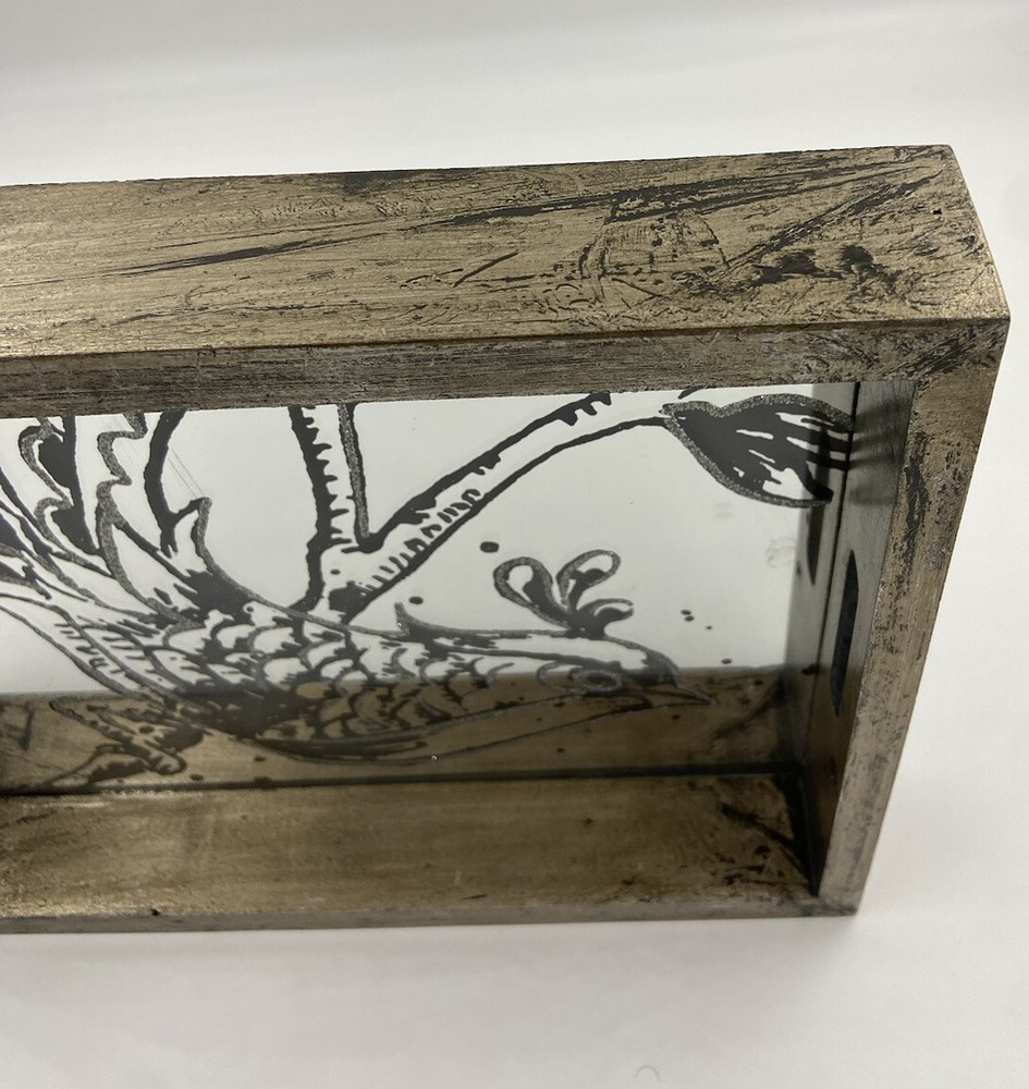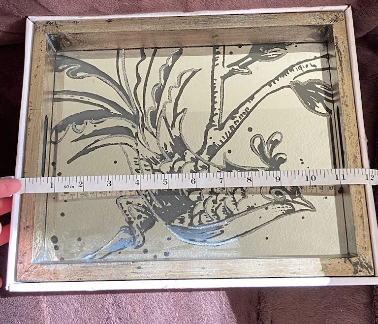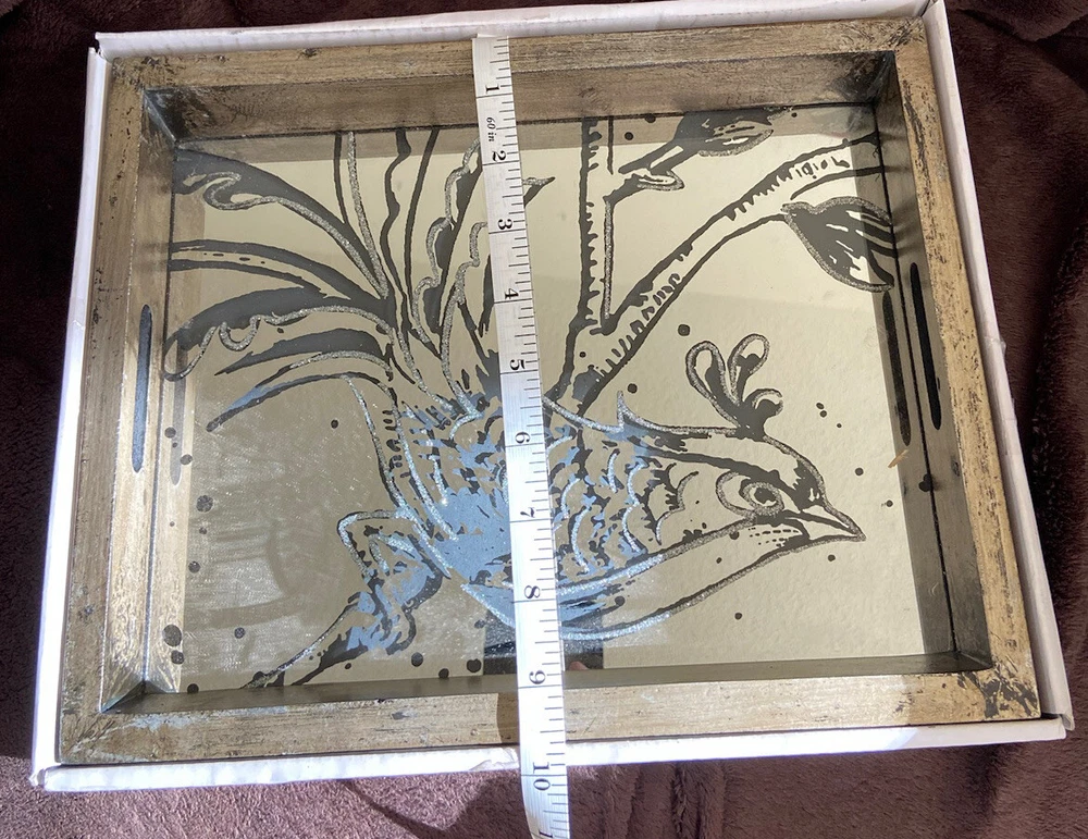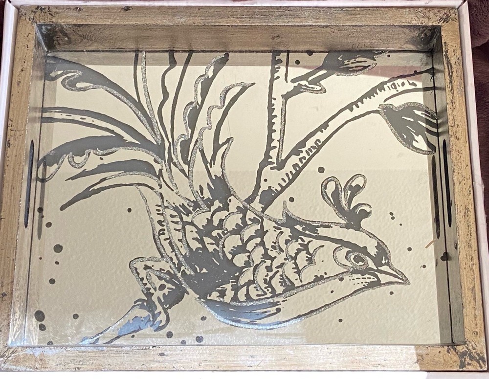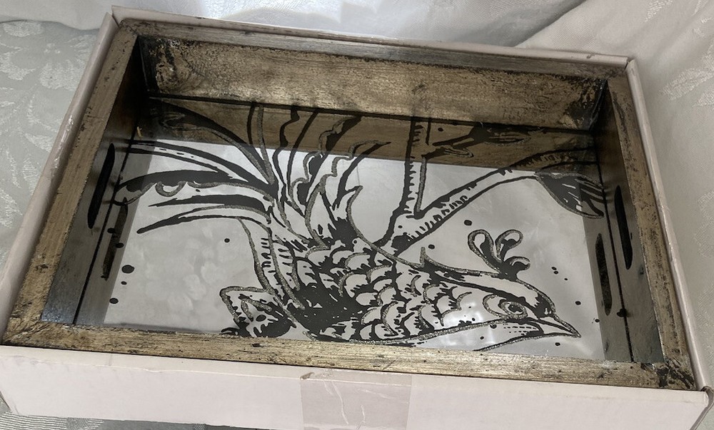 Decorative Fontanne Mirror Tray Farmhouse Style Bird Modern Contemporary Design Base pained with golden tone and black enhancements Not intended for serving food Used for decoration or jewelry/trinket tray Good Condition for a used item. Small scratch on mirror, shown in picture Perfect for any bird lover/collector. Wonderful addition to any modern/contemporary home decorating style