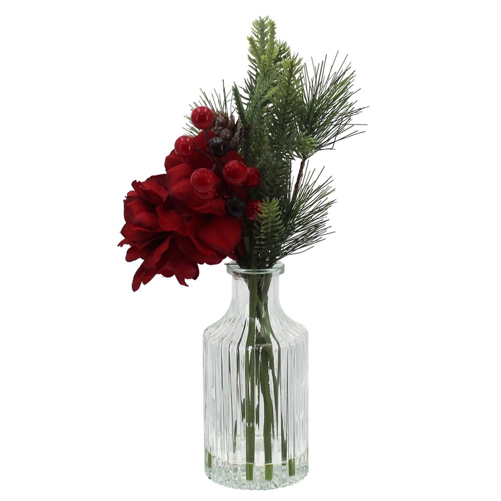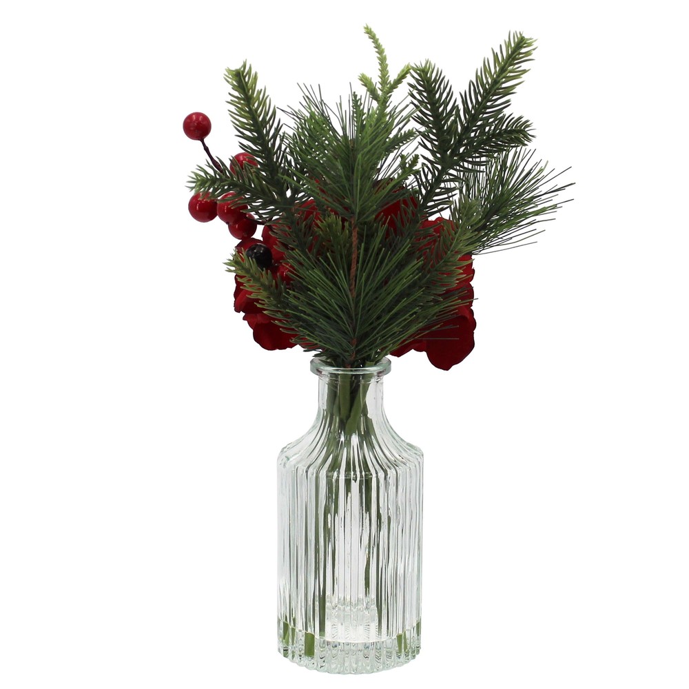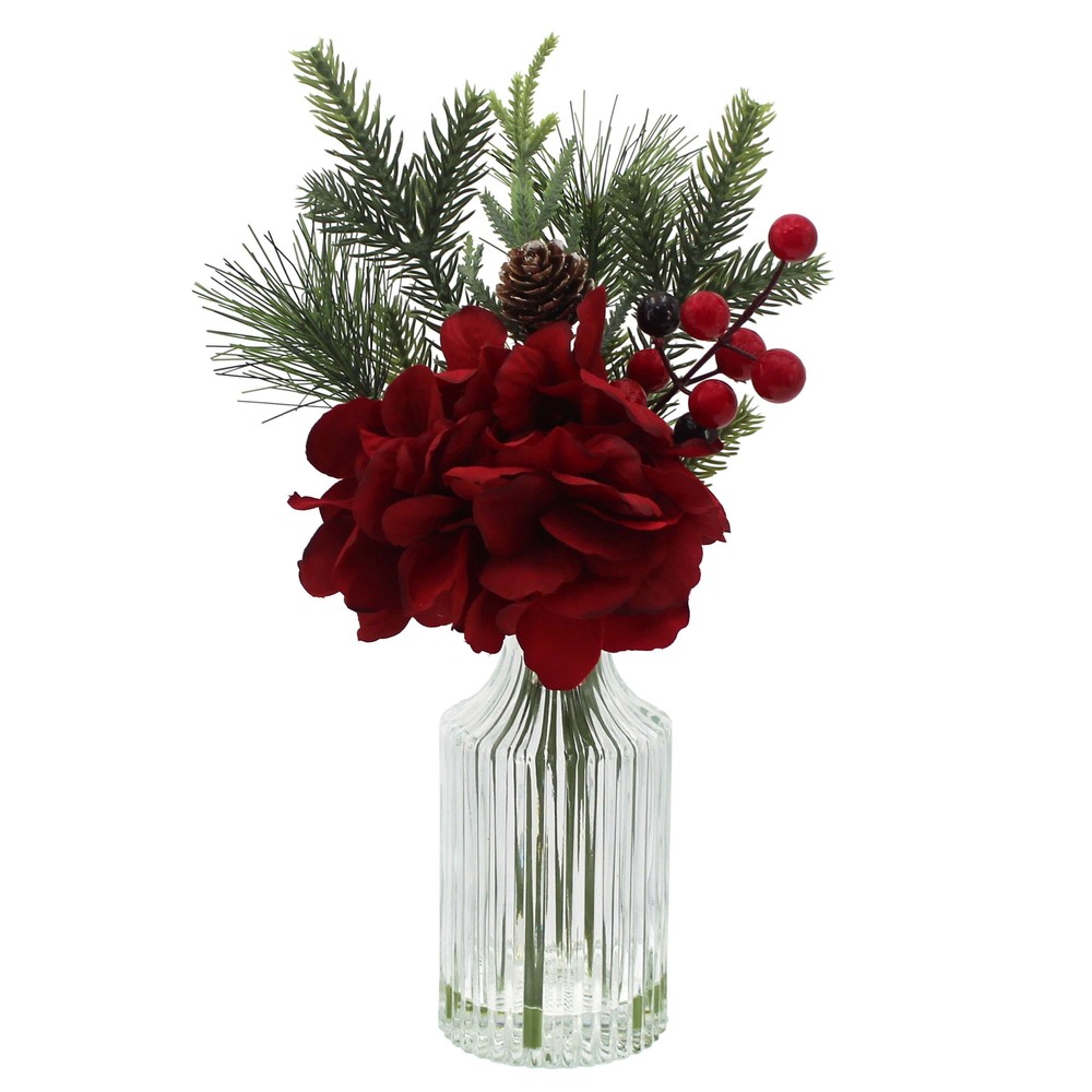 With its sophisticated design and timeless charm, the Mainstays Prestige 11.5" Artificial Red Hydrangea in Clear Ribbed Glass Vase enhances the ambiance of any living room, dining room, kitchen or office. The sophisticated design and timeless charm of the artificial hydrangea decorative piece enhances the ambiance of any room Features an arrangement of fade-resistant, multi-colored, artificial red hydrangeas, green pine needles and red berries, and real pine cones in a round, clear, ribbed glass vase A vibrant decor that enhances the look of any table, mantel, shelf or desk This decorative piece measures 5" deep, 5" wide, and 11.5" tall and features a fade-resistant, colorful artificial floral arrangement of red hydrangeas, green pine needles and red berries, and real pine cones in a round, clear, ribbed glass vase. For indoor use only, this colorful decorative piece enhances the look of any table, mantel, shelf or desk. Mainstays Prestige 11.5" Clear Ribbed Glass Vase Artificial Red Hydrangea with classic style and holiday-themed artificial foliage arrangement will make a cheerful addition to any room in your home this holiday season and for many joyful years to come. Cheerful decor for indoor use only Dimensions: 5"D x 5"W x 11.5"H Weight: 0.68 lbs Service: We are here to help you before and after your purchase. We are here to meet your needs. Shipping: We ship all items within 3 - 10 business days via standard shipping. If there is a problem with your order for any reason, we will contact you immediately. Shipping Carriers: UPS, USPS, FedEx. Return Policy We have a 30-day money back return policy. If you receive a manufacturing defective item and want to return or exchange it, there is no restocking fee. You do not have to pay more for the return.