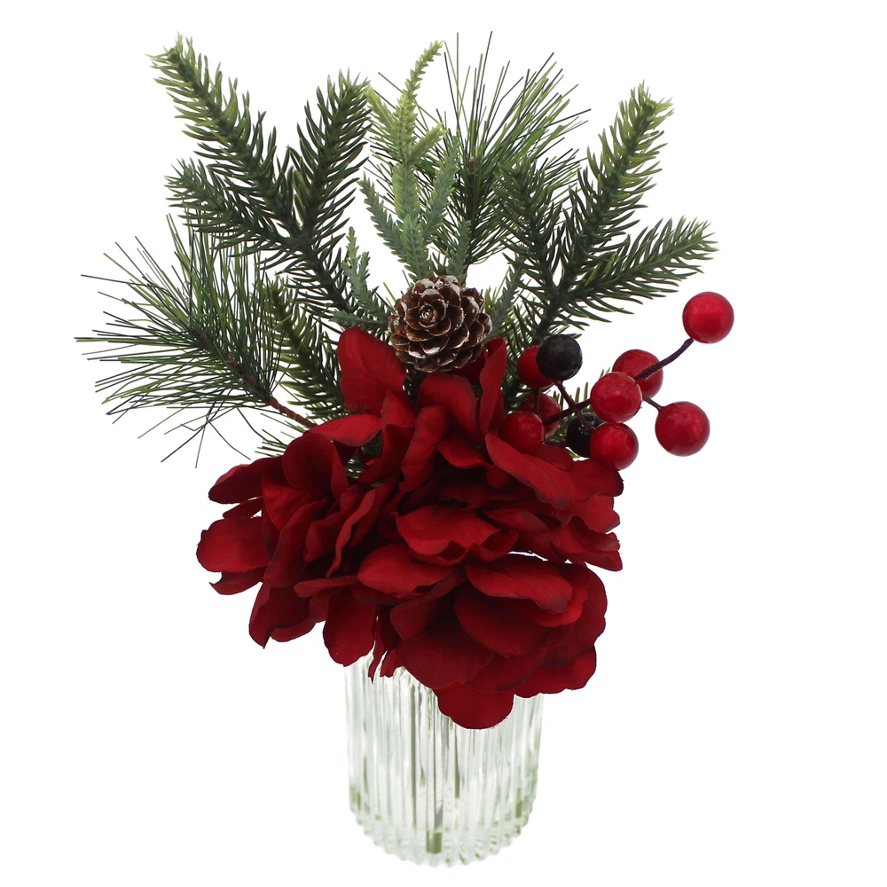 This stunning artificial hydrangea arrangement adds a festive pop of color to any space! The lifelike red blooms, pine cones, and berries look elegant in the ribbed glass vase—perfect for holiday decor without the mess of real flowers. It stays vibrant season after season, making it a great value. Love how it brightens up my desk or dining table with minimal effort!