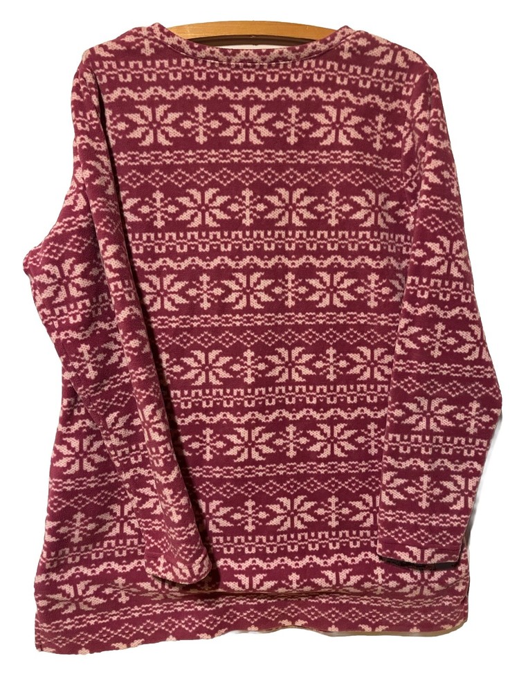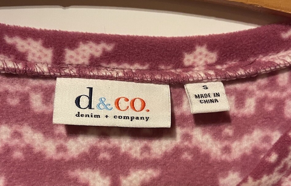 This is a Denim And Company fleece night gown in size Small, designed with a purple and white snowflake pattern. It is a cozy and comfortable garment perfect for lounging or sleeping in. The fleece fabric type adds extra warmth, making it ideal for colder nights.