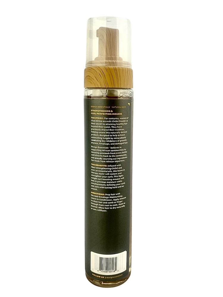 Design Essentials Natural Hair African Chebe Growth Collection Strengthening & Curl Perfecting Mousse Style: Coily and Curly THE STORY: For centuries, Women of Chad Africa accredit Chébé Powder as their secret to attaining healthy hair beyond their waist. They have graciously shared their tradition, helping create this naturally derived product, designed to help achieve astonishing length by miraculously combating key inhibitors of growth: dryness, breakage, and damaged hair. Design Essentials believes in supporting African communities by donating proceeds from every bottle sold directly back to the community, and proudly sourcing our ingredients fair trade from African Importers. THE BENEFITS: Infused with fiber-strengthening Chébé and over 20 essential oils, this leave-in therapy styler will restore and strengthen your curls. This lightweight curl-boosting mousse will lock in precious moisture while simultaneously defining your curls and coils with lasting hold and no crunch. DIRECTIONS: Prep hair with the Anti-breakage Moisturizing Leave-In Conditioner. Apply mousse to clean hair and comb or finger through from root to ends. Style as desired. Allow hair to dry naturally or use a diffuser.
