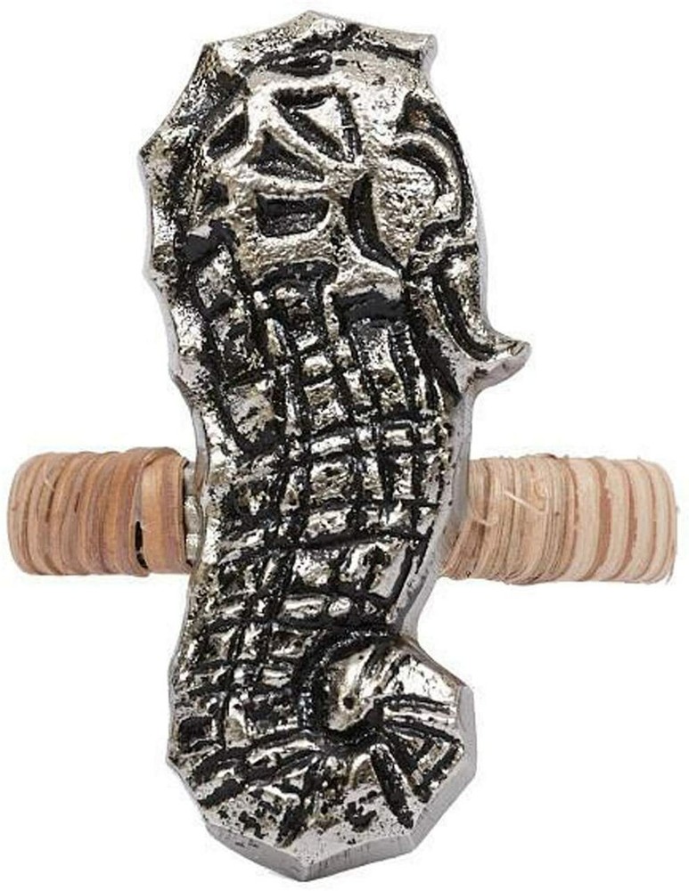 Bring a touch of the ocean into your home or beach house with the Seahorse napkin ring from Design Imports Seashore Table Linens Collection. The napkin ring is in the shape of a seahorse and is made of cast brass metal with an antique silver finish. The ring is wrapped with natural fiber. Dress up your table while adding fun with this sea turtle napkin ring. Lovely and versatile for entertaining, picnics, birthdays, dinner, BBQ’s, special occasions, everyday meals and more!