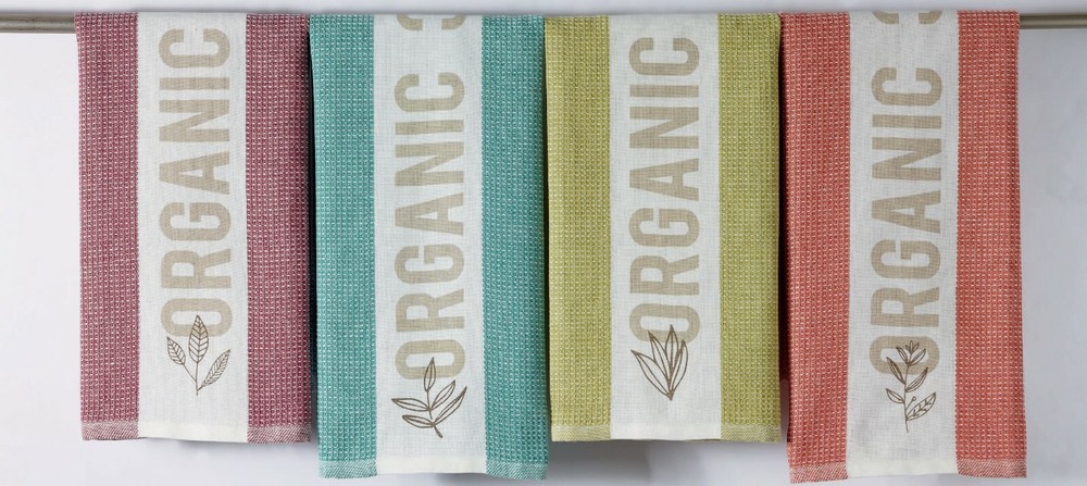 Cotton "Organic" Cotton Waffle Print Dishtowels Set of 4 INCLUDES: 1 of each Printed Waffle Dishtowel shown PERFECT FOR: Tackling all of your drying and cleaning needs in and around your home. The dishtowels makes lovely hostess, housewarming or holiday gifts or perfect for everyday use. SPECS: The dishtowel is absorbent, measures 18” x 28” (46 x 71 cm) 100% Organic Cotton. Machine wash cold separately Gentle cycle Tumble dry low Low iron