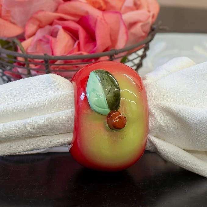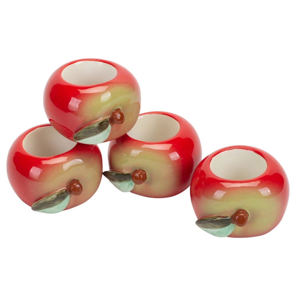 Apple Napkin Rings come in a set of 4 the same; Adds a classy touch of fall to any table Napkin rings are made of hand-painted glossy red ceramic with apple stems on the top Rings come in an 8 x 8 x 3 inch retail quality white box with acetate cover Perfect for your fall table Ships in protective packaging