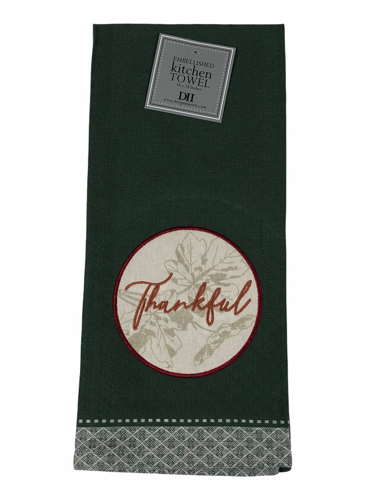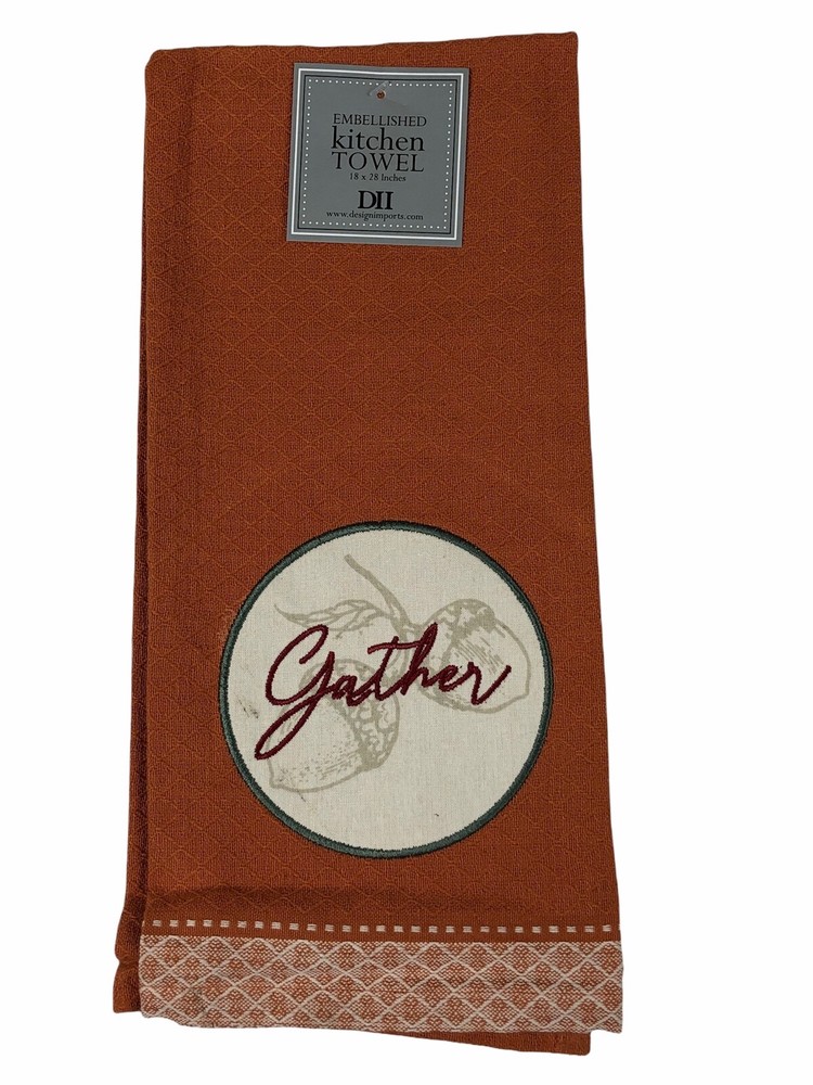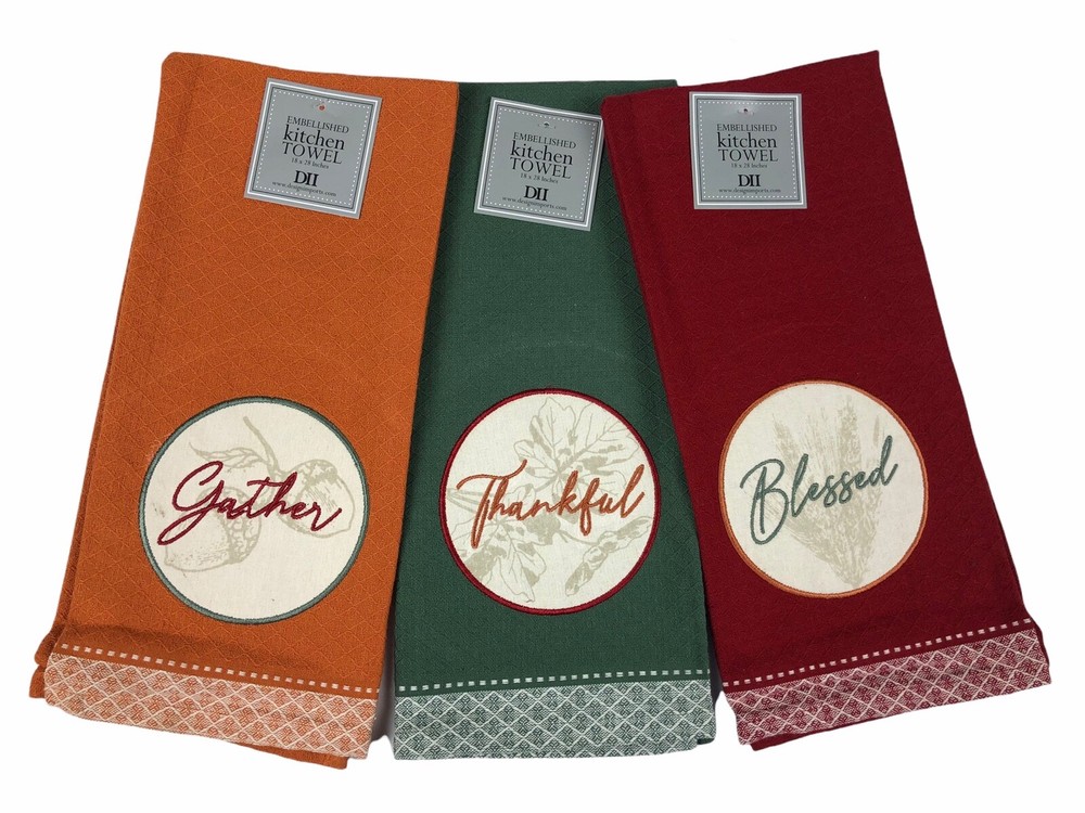 - Design Imports Botanical Autumn Solid Color Embroidered Dishtowel Set of 3 Blessed Thankful Gather - Brand new - Includes 3 different towels. - Made of 100% Cotton. Machine wash cold. Gentle Cycle. Tumble Dry Low. Low Iron - Each towel measures 28" x 18"