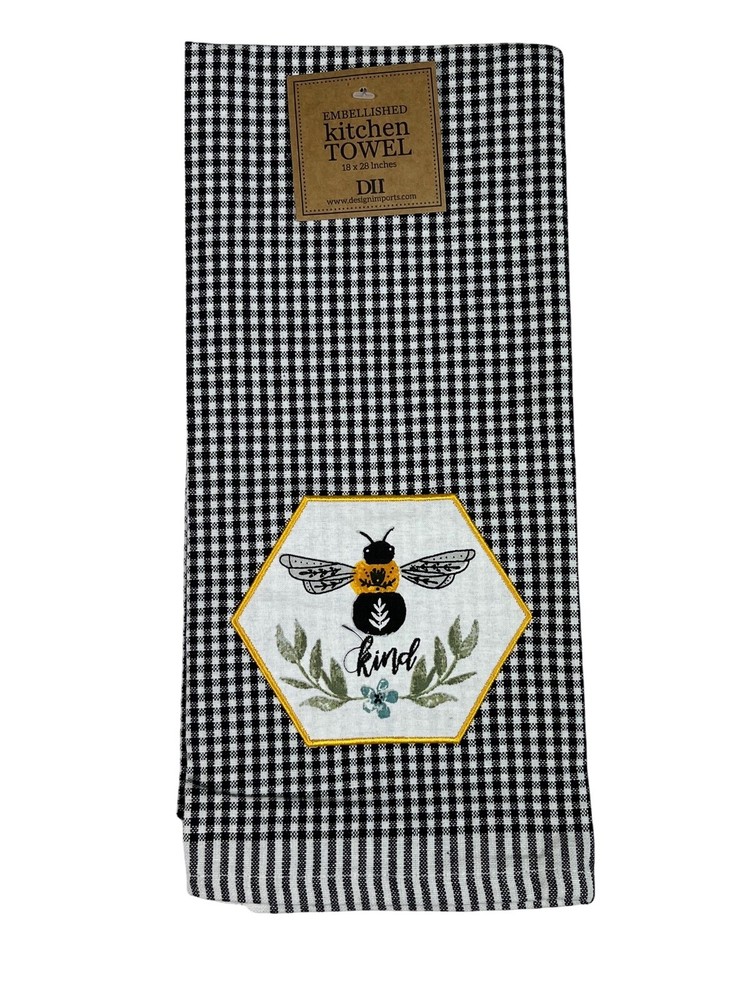 - Design Imports Bee Happy and Bee Kind Gingham Embellished Dishtowel Set of 2 - Brand new with tags - Each towel measures 18" x 28" - Made of 100% Cotton