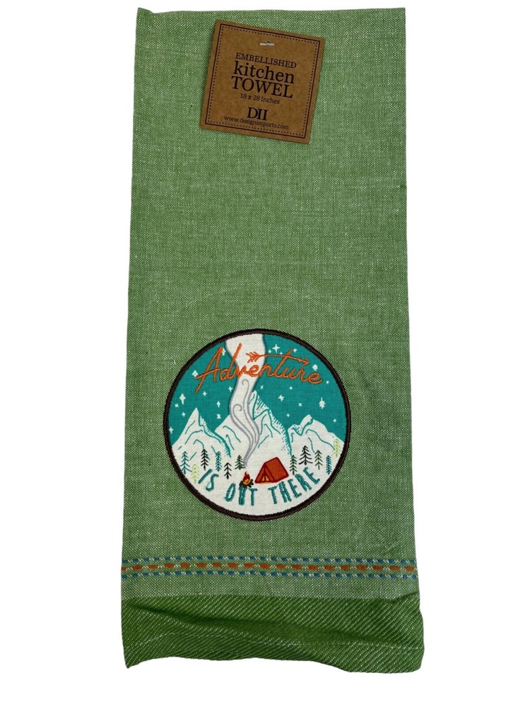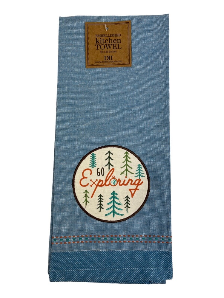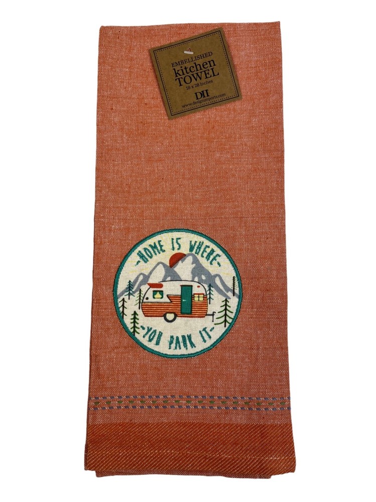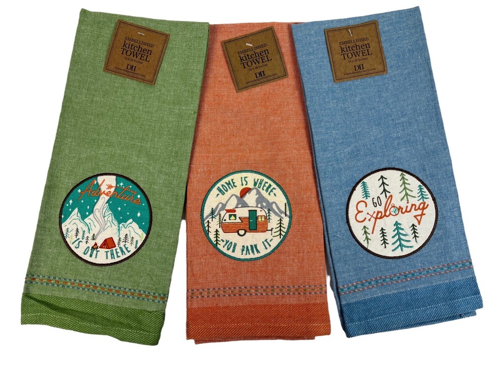 Design Imports DII Camping Embellished Dishtowels Set of 3. Includes 1 blue towel with "Go Exploring" embellishment, 1 orange towel with "Home is Where you Park It" graphic, and 1 green towel with "Adventure is Out There" graphic. Each towel measures 18" x 28". Made of 100% Cotton. Machine washable. These colorful fun graphic towels would make a great addition to your camper, cabin, lake home, or RV.