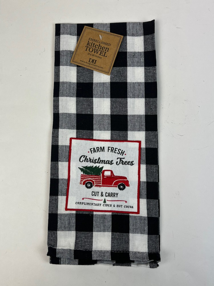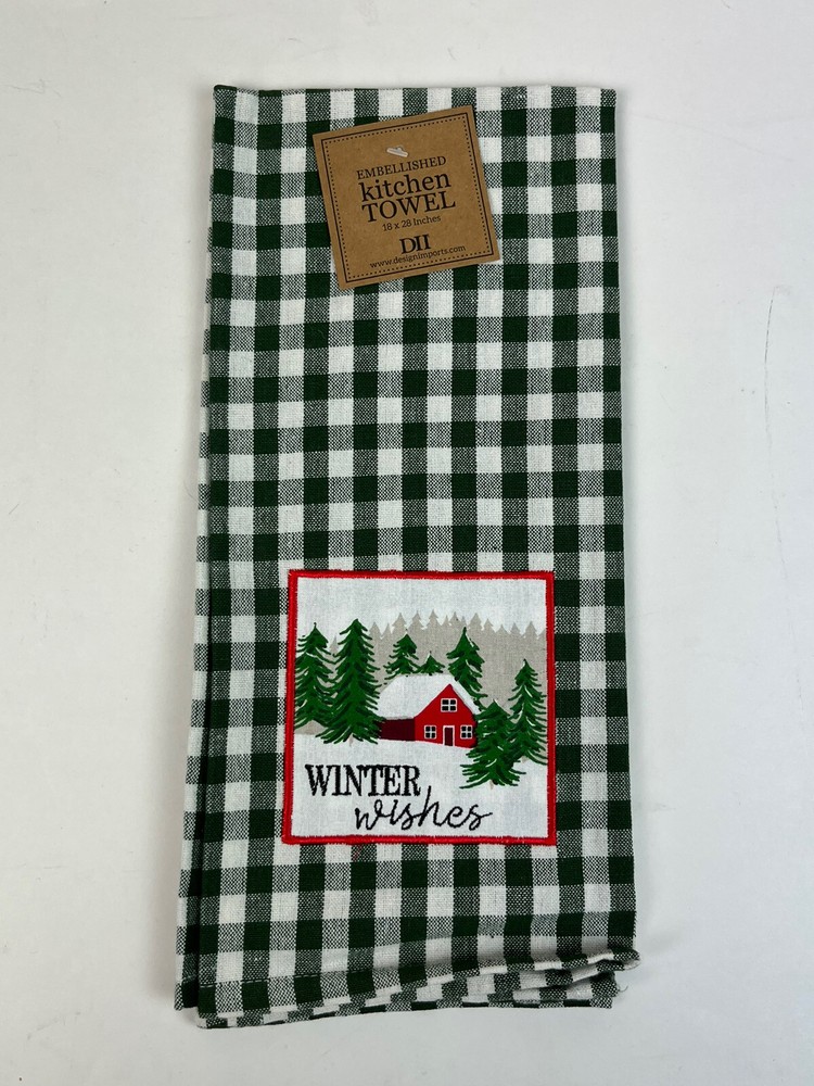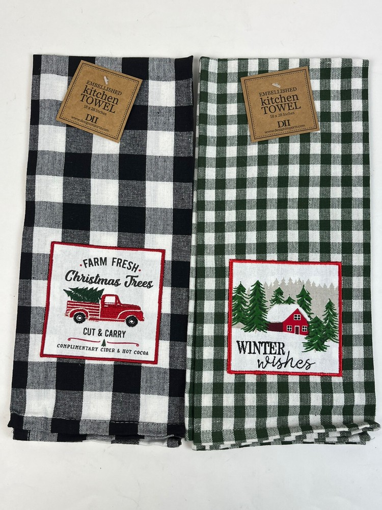 - Design Imports Vintage Truck and Barn Plaid Gingham Embellished Christmas Holiday Dishtowel Set of 2 - Brand new with tags - Each towel measures 18" x 28" - One towel is green plaid with a barn graphic and the words "Winter Wishes". The other towel is green with a truck graphic and the words "Farm Fresh Christmas Trees Cut & Carry Complimentary Cider & Hot Chocolate"