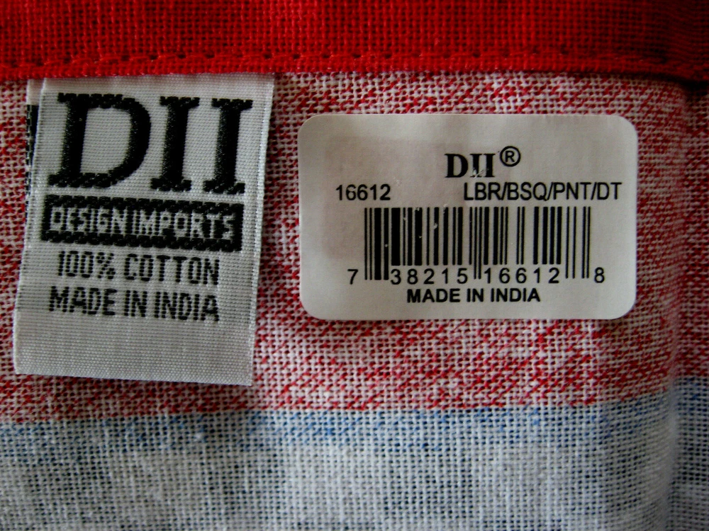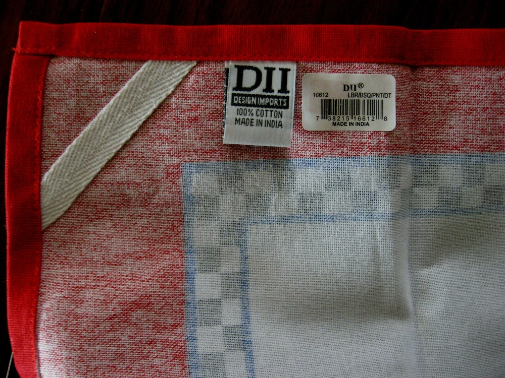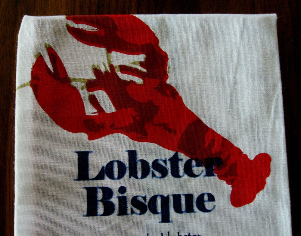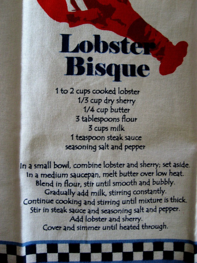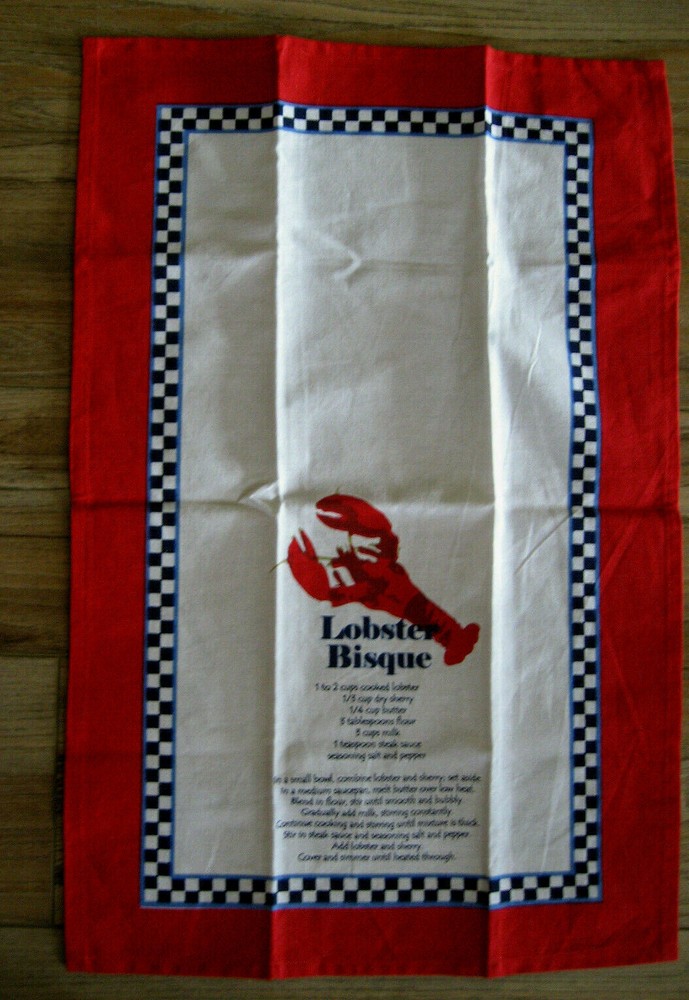 Up for Sale - An UNUSED Pre-owned Design Imports, DII, UNUSED, 100% Cotton Dish Tea Towel, LOBSTER BISQUE, Featuring Bright Red Lobster & Recipe for Bisque on White Background with Blue & White Checkered Design And Bright Red Border. Made in India, Excellent Pre-owned Unused Condition. Has a material label on back and also a paper label. Includes care instructions on back of material label. 100% Cotton. Has fold lines. Size - 18.5" by 28". Design Imports, Seattle, Washington, 2016. Great addition to your collection! Thank you for looking.
