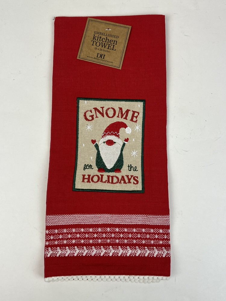 - Design Imports DII Gnome for the Holidays Red Embellished Christmas Kitchen Dishtowel - Brand new with tags - Each towel measures 18" x 28"