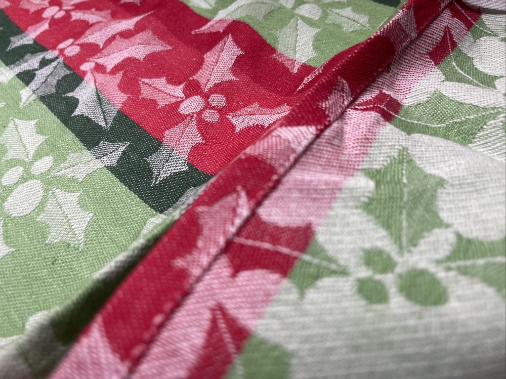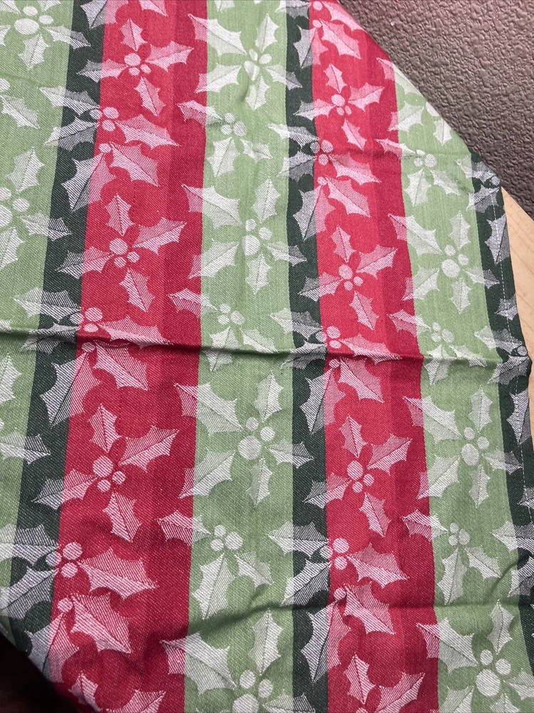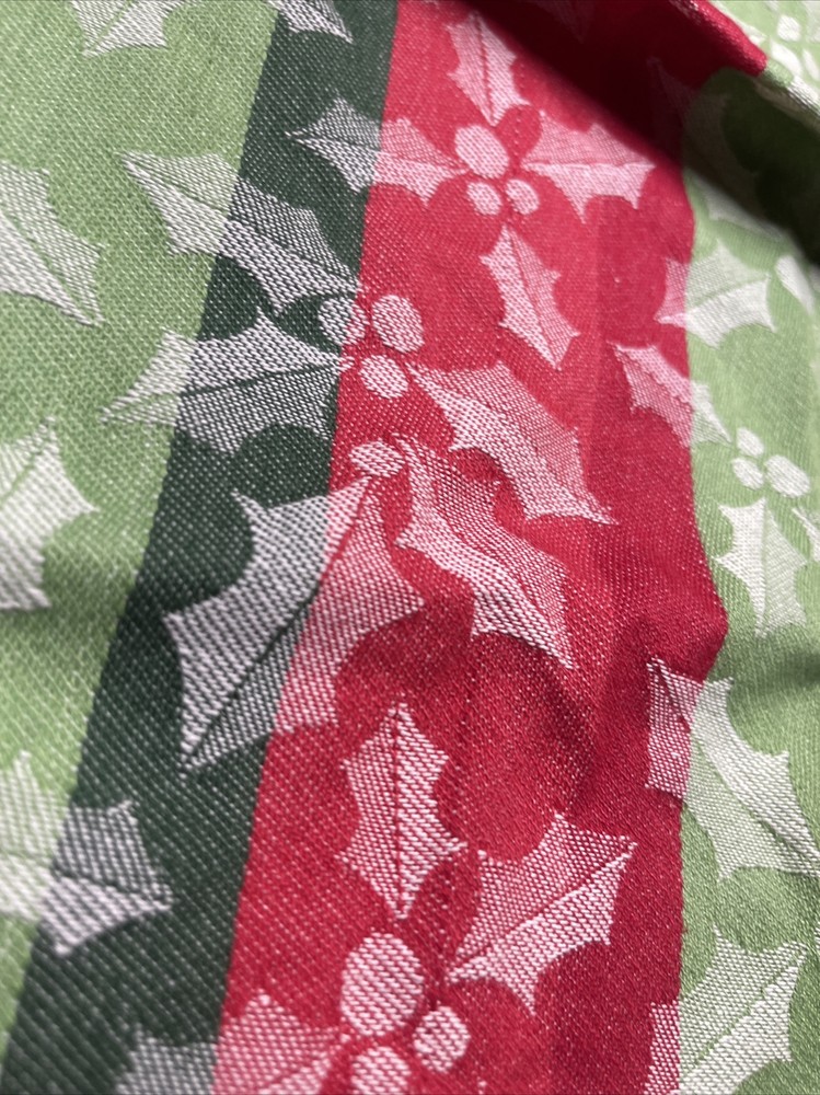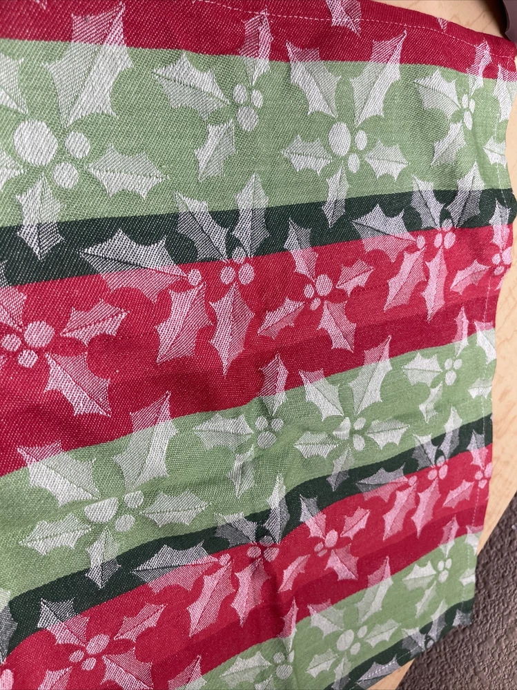 Crisp like new. Appears unused but it is previously owned. Great stripes design with white waves in holly and berry design throughout. See pictures. Sold as seen. It’s about 17.5” x 28.5”. C9