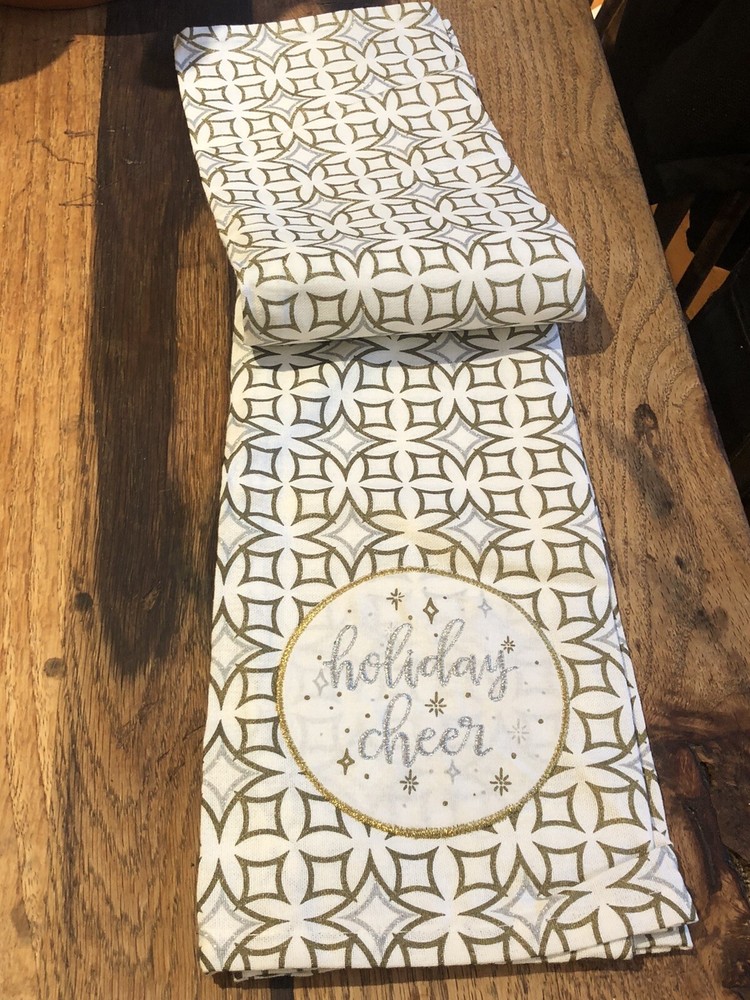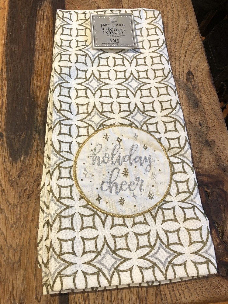 I'm offering this pretty set of holidays kitchen / tea towels that are NEW with tags They measure 28" long X 18" wide, have silver & gold glittering designs embellishments These are very festive & would brighten your home or make a lovely holiday gift. they come from a smoke free / cat free home
