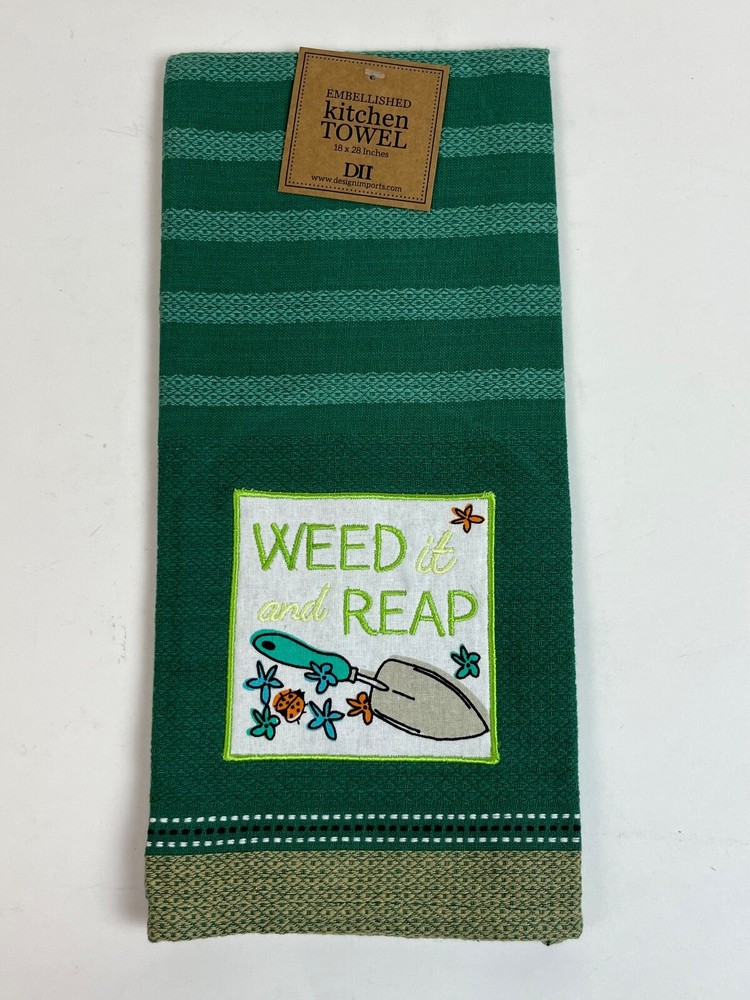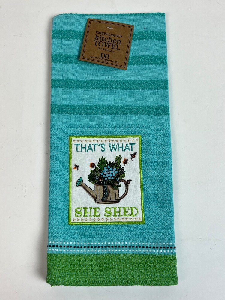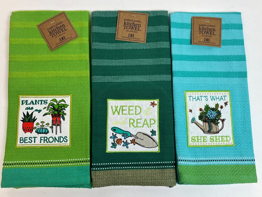 - Design Imports Garden Shed Embellished Dishtowel Set of 3 - Includes 3 dishtowels with each of the following sayings "WEED it and REAP", "PLANTS are my best FRONDS" and "That's what She Shed". - Makes a fun gift for the master gardener or person who loves to play in the dirt and plant vegetables and flowers. - Each towel measures 18" x 28". Made of 100% Cotton. Machine washable.
