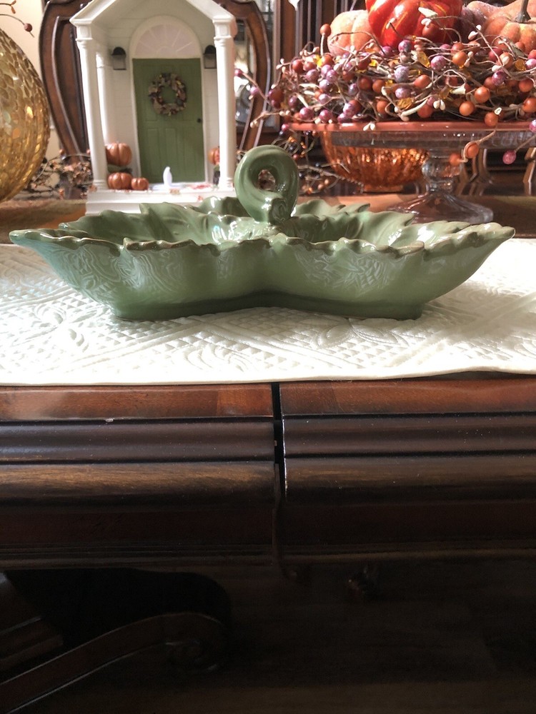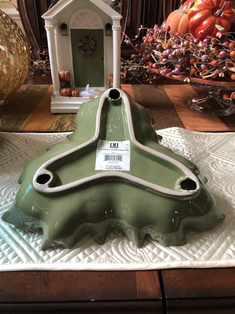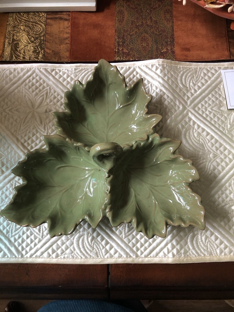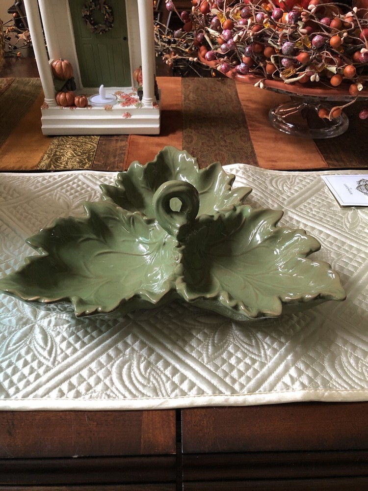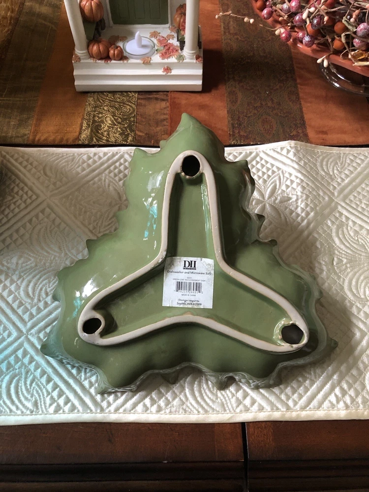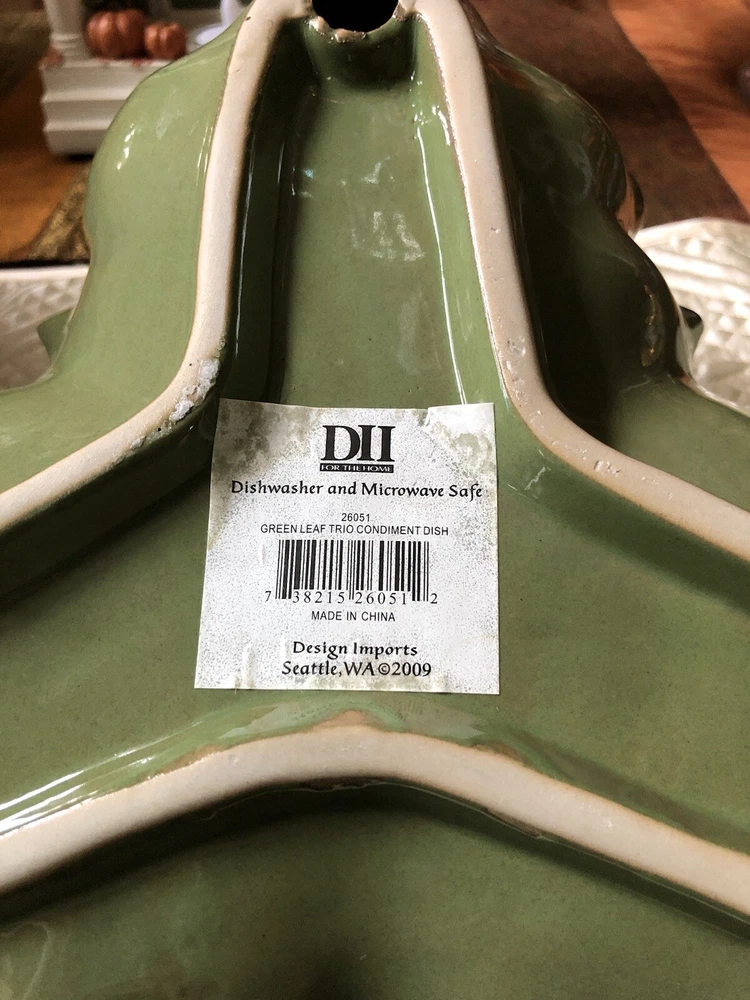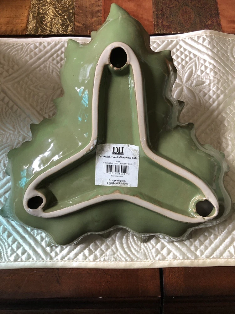 Design Imports Green Leaf Trio Ceramic Condiment Dish in excellent condition. There are no chips or cracks. This dish measures approximately 11" from corner to corner. It is dishwasher safe. Perfect for the holidays. Smoke-free home. Thanks for looking.