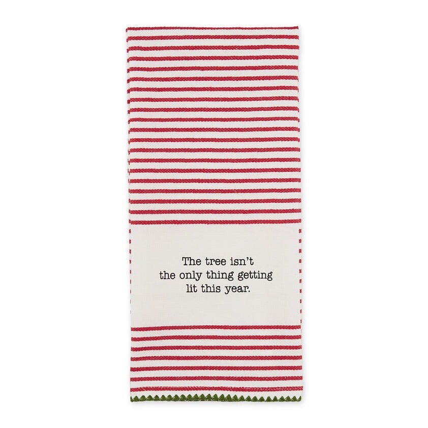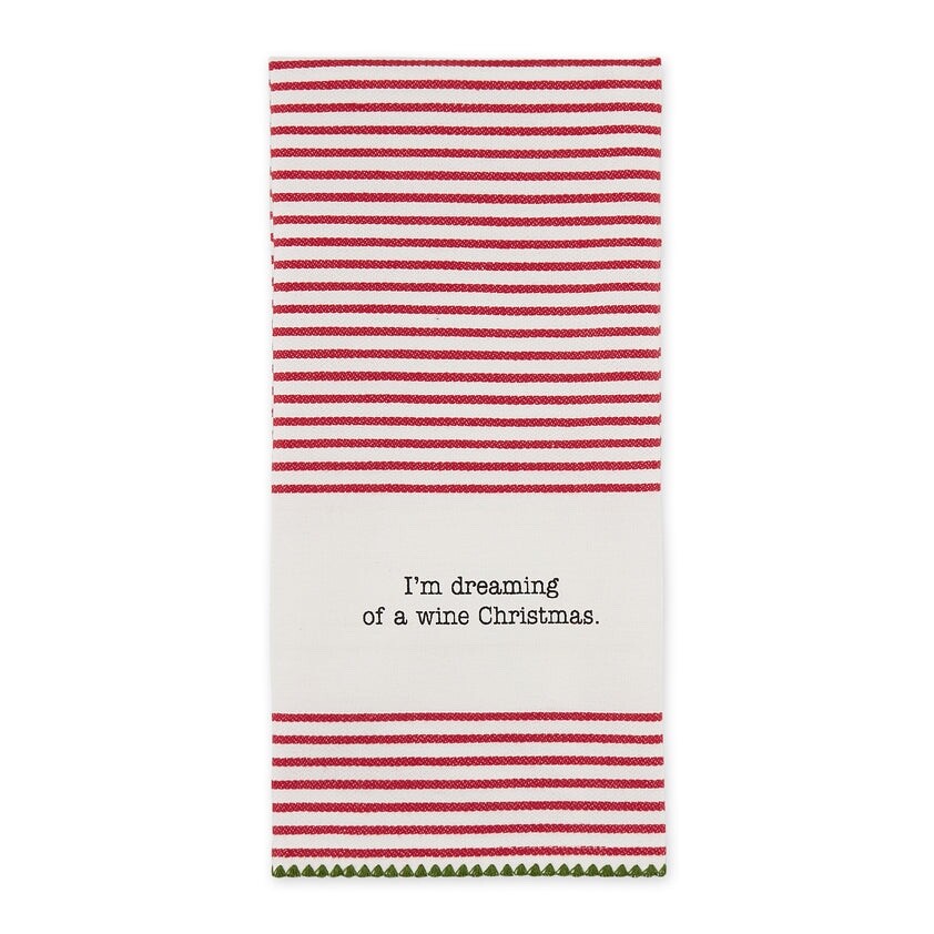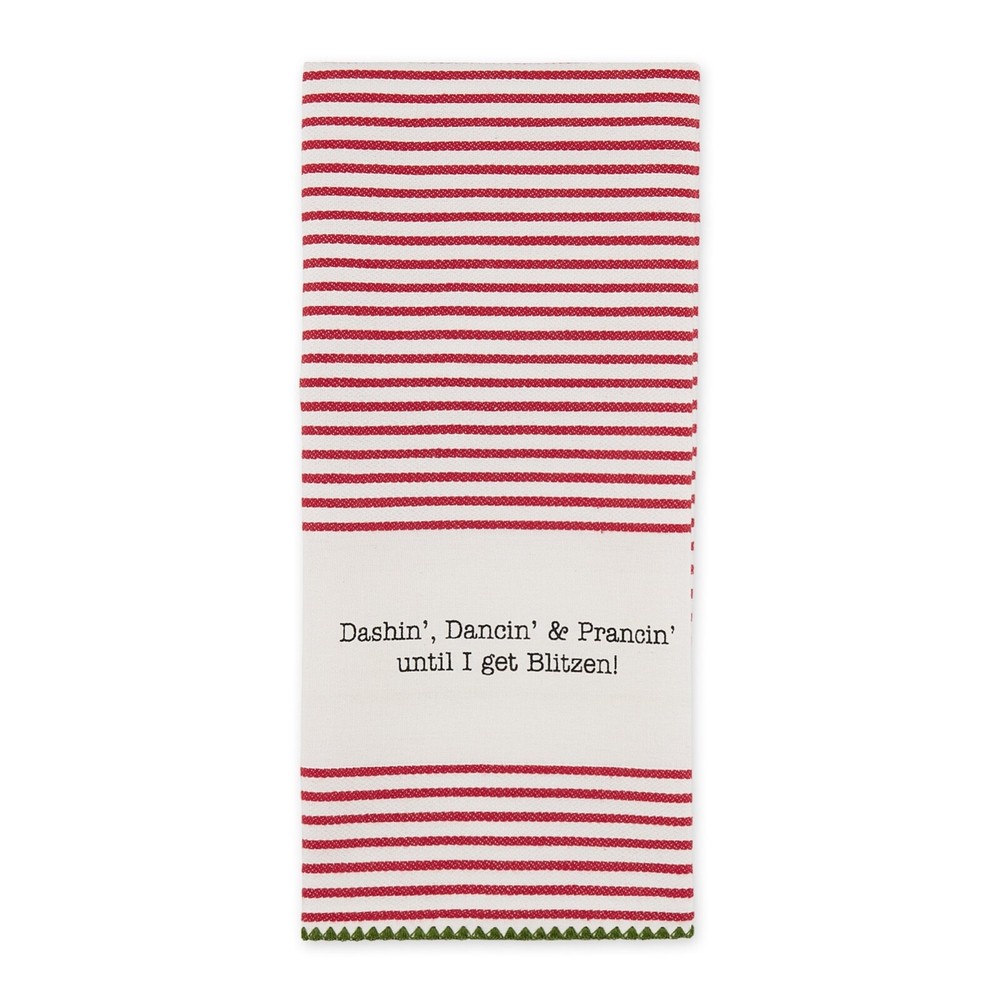 - Design Imports Happy Alcohol Idays Funny Adult Theme Stripe Kitchen Dishtowels Set of 4 - Brand new with tags - Made of 100% Cotton - Includes 4 towels with the following sayings " Dashin' Dashin' & Prancin' until I get Blitzen!", "I'll take my Christmas Spirit on the rocks", "The tree isn't the only thing getting lit this year" and "I'm dreaming of a wine Christmas" - Each towel measures 18" x 28"