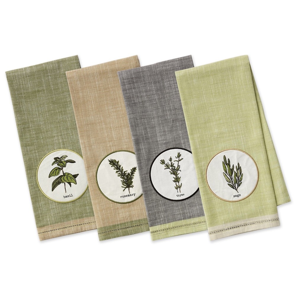 - Design Imports Herbal Embellished Dishtowels Set of 4 - Includes 4 towels with 1 each of the following herbs: Rosemary, Thyme, Sage, and Basil - Brand new with tags - Each towel measures 28" x 18" - Made of 100% Cotton. - Machine wash cold separately. Gentle Cycle. Tumble Dry Low. Low iron.